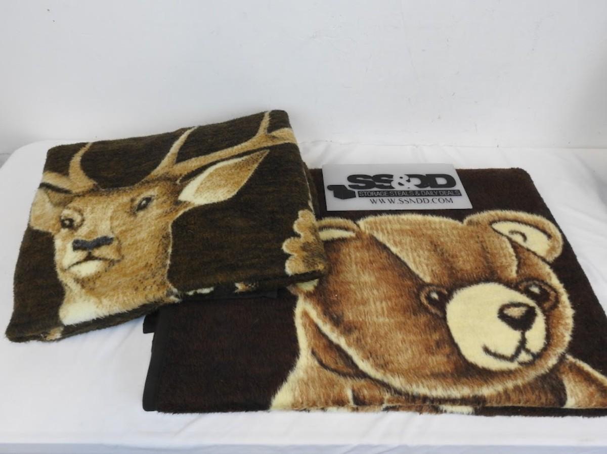 2 Brown Blankets Rustic/Cabin: Deer/Elk missing some trim 60"x74" & Bears 60"x80"