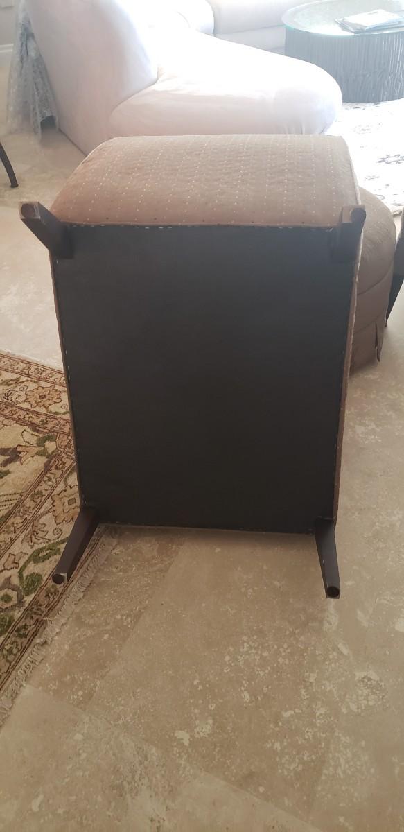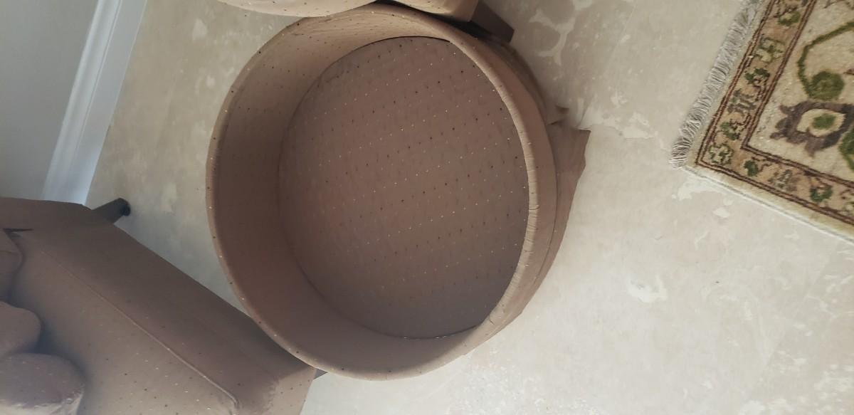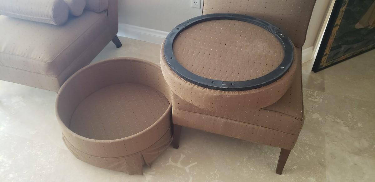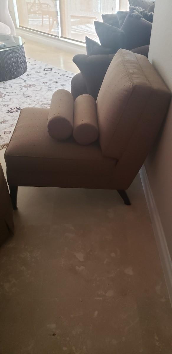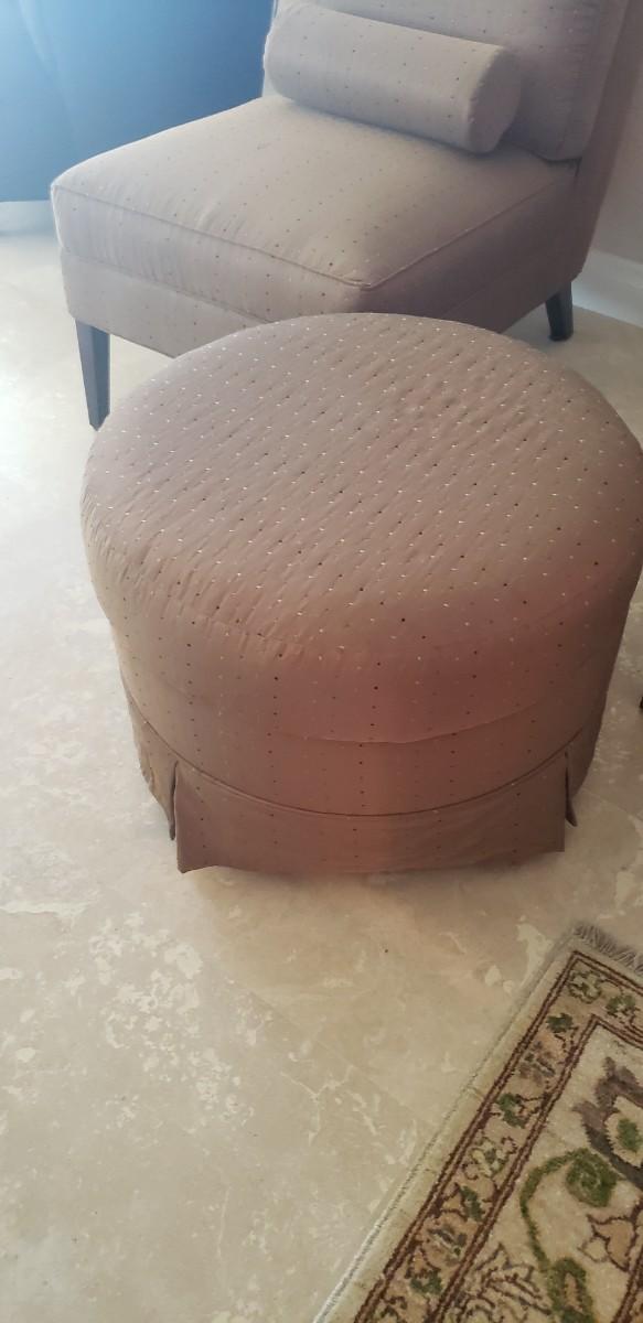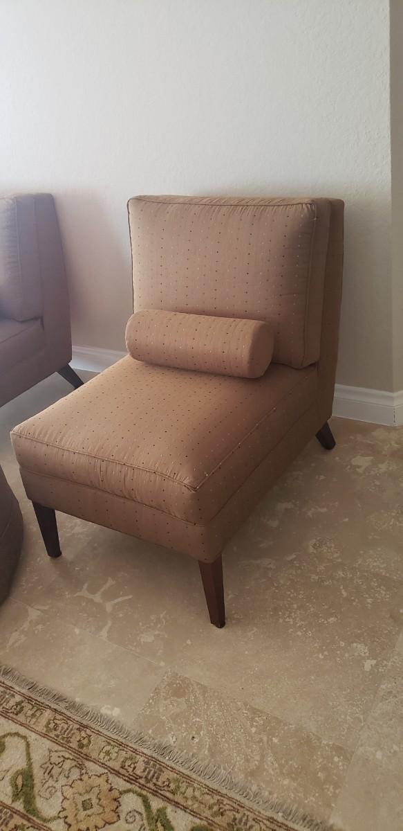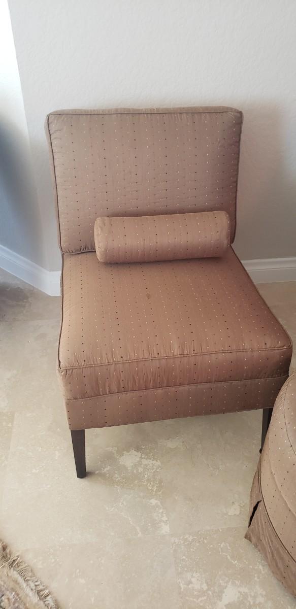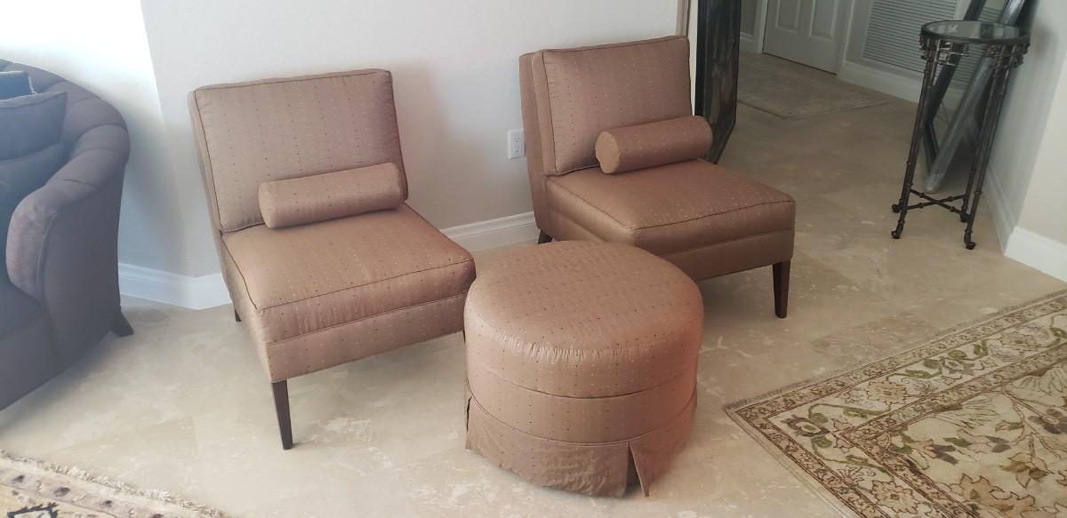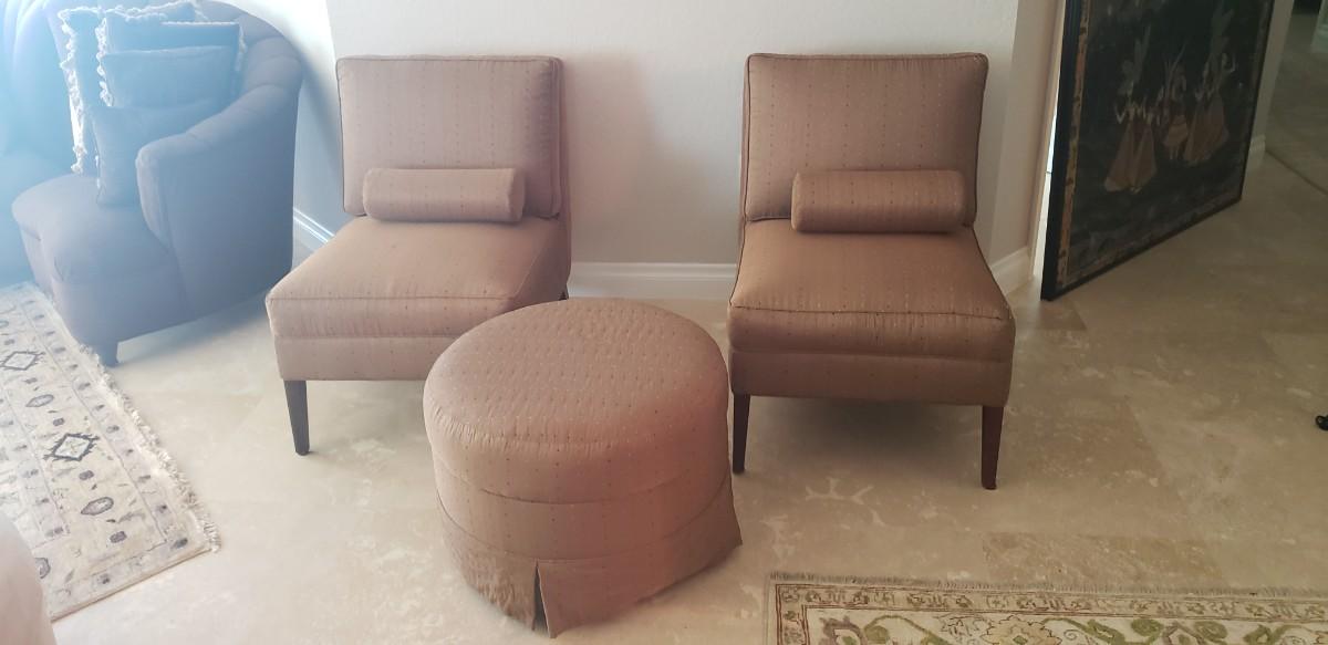2 Tan Silk Chairs with Pillows and Ottoman