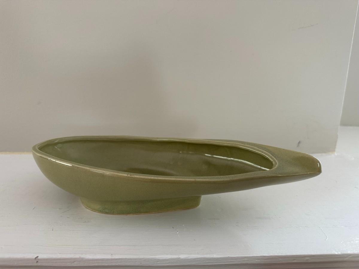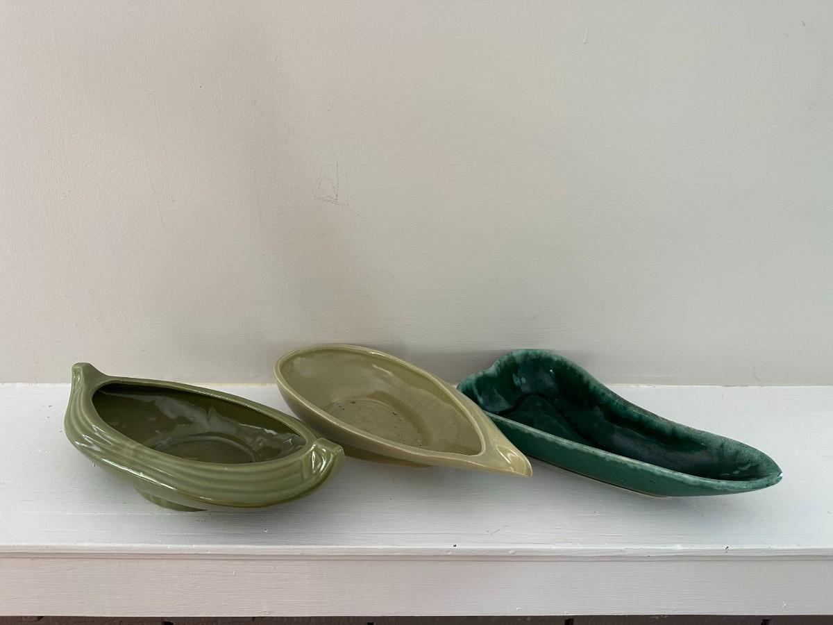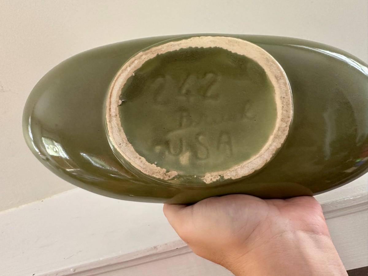 11"w Lt Green Brush USA 243 Pottery, 11.5" Green Brush USA 242 Pottery. 10"w Green Dish, unmarked