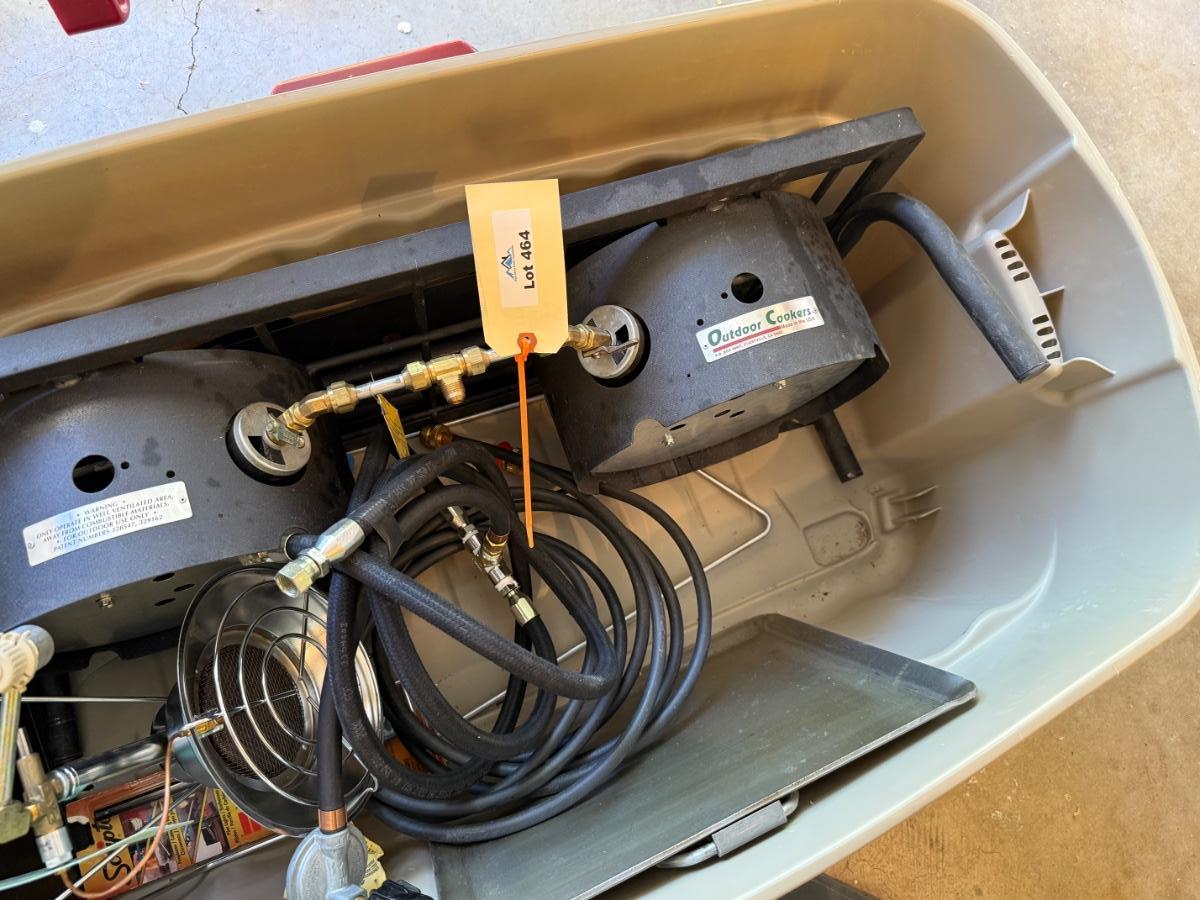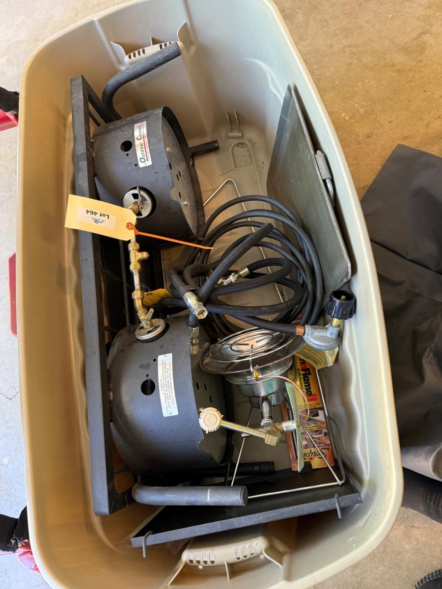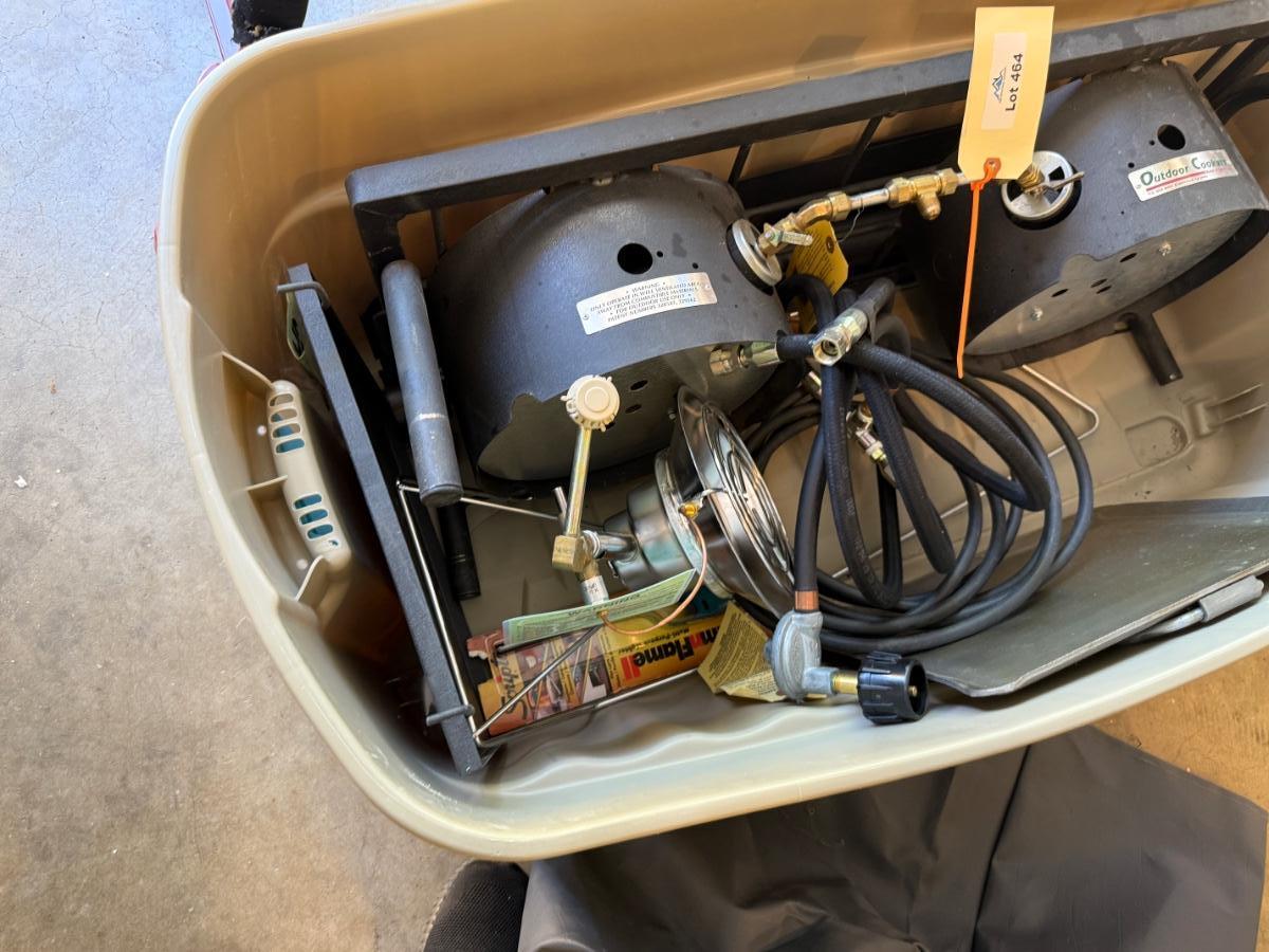 Outdoor Cookers 2-Burner Propane Stove & Heater plus tray and new lighter along with large gray plastic tub & lid