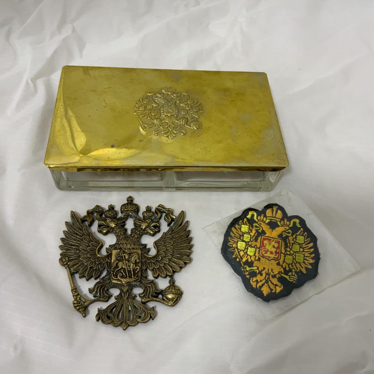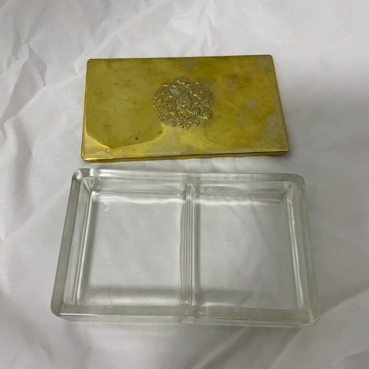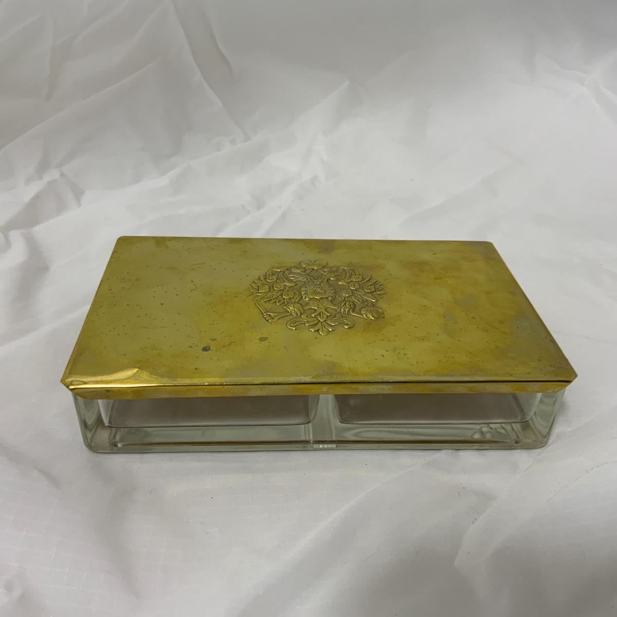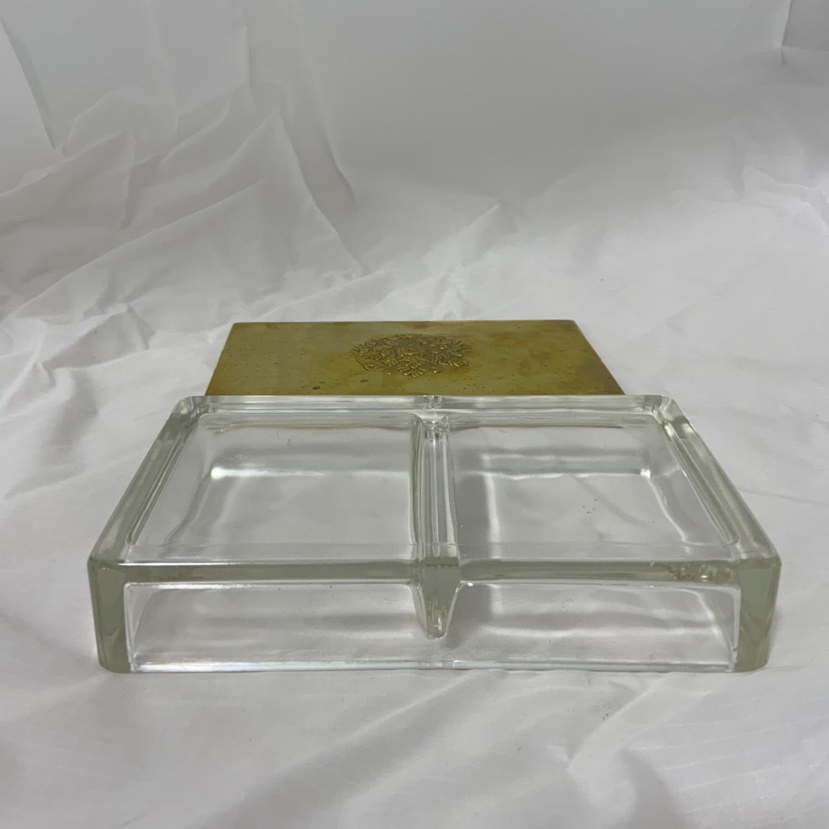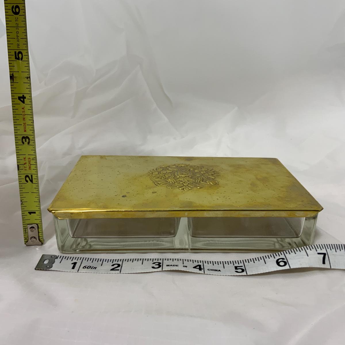 From the Estate of Peter Radovanovich: Elegant Brass-Lidded Glass Dish with divided base. Could hold two decks of cards or cigarettes. Brass Crest with a relatively flat back that could be added to furniture or a display piece. Patch, new in packaging. Please see photos for details and condition. ::: Shipping is available on this lot. If you require shipping you must let us know at the close of the auction. We will coordinate with you after the item has been won. Shipping fees will include insurance up to or exceeding the value of all items being mailed. If you have any questions regarding this lot please contact the auctioneer either via this website, by direct email or by phone. PICK UP TIMES and other important information can be found in the TERMS and DESCRIPTION of the auction. Please take a look for pertinent information. Thanks!