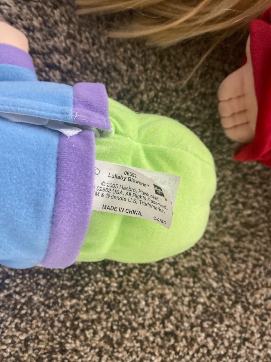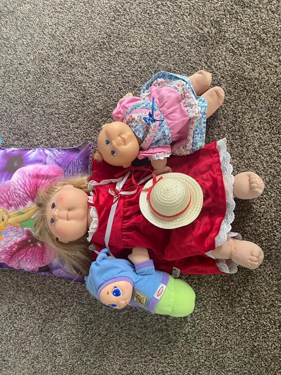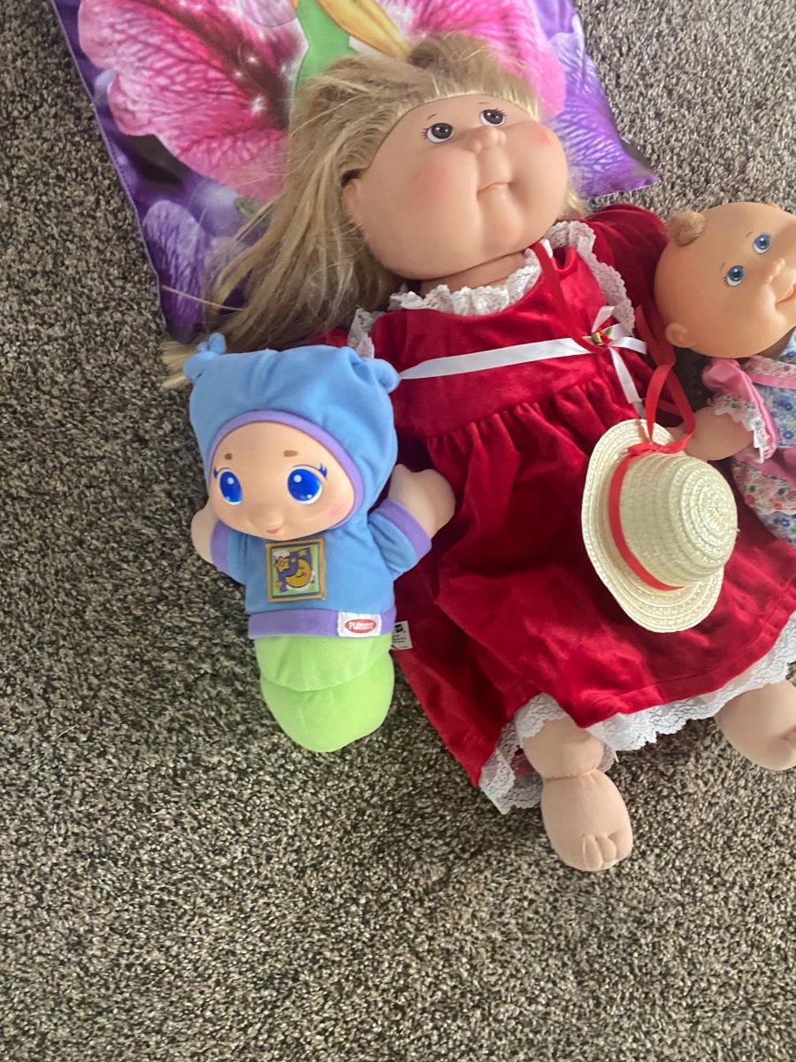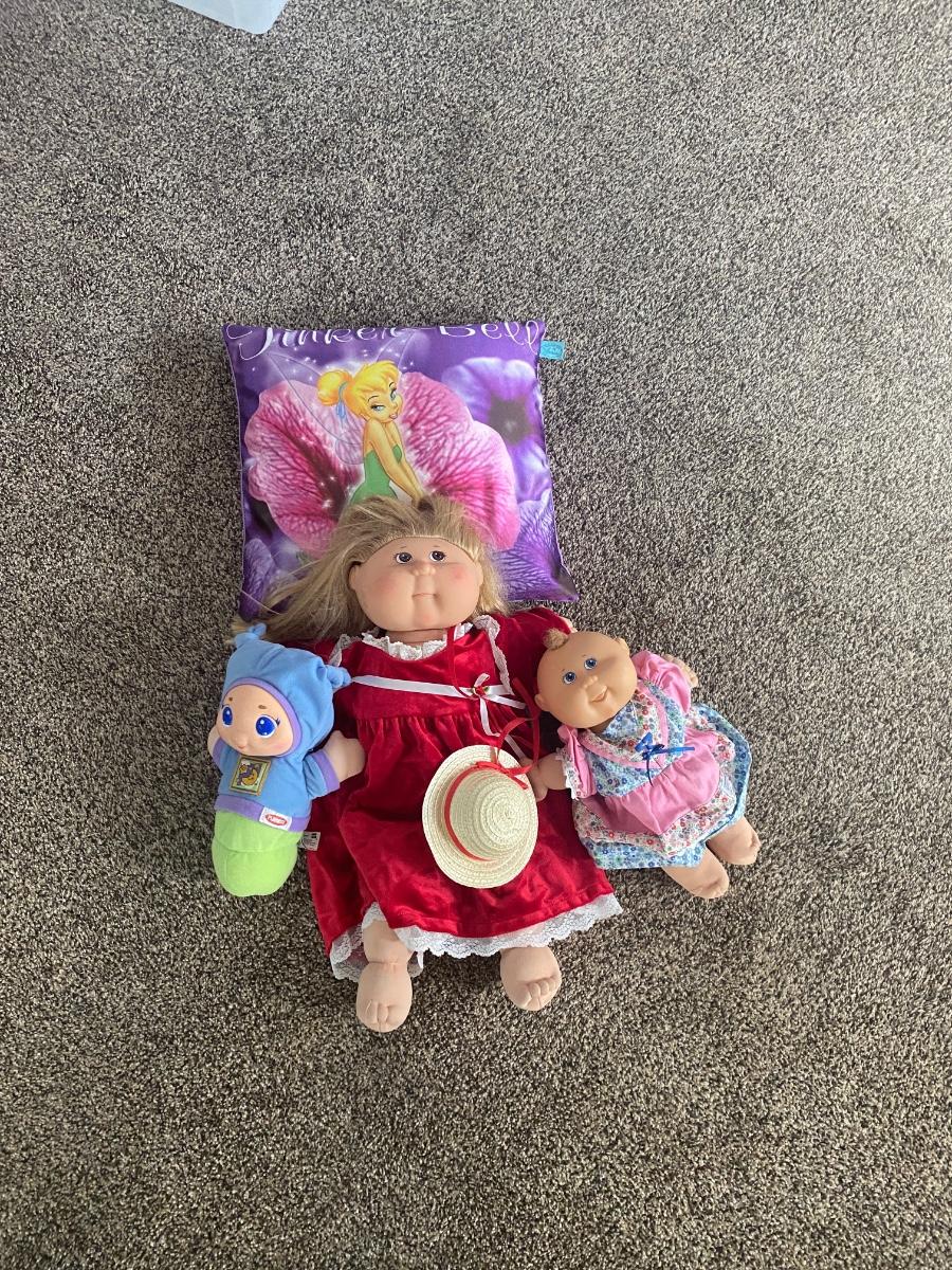 2 CABBAGE PATCH KIDS AND A CUTE LITTLE LULLABY GLOW WORM WITH TINKER BELL PILLOW