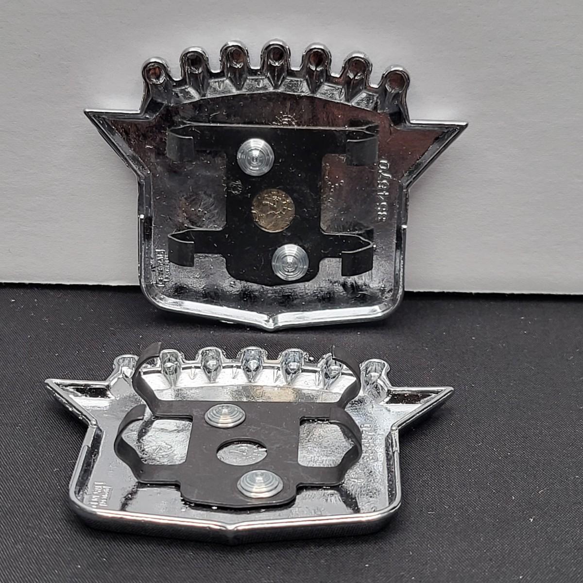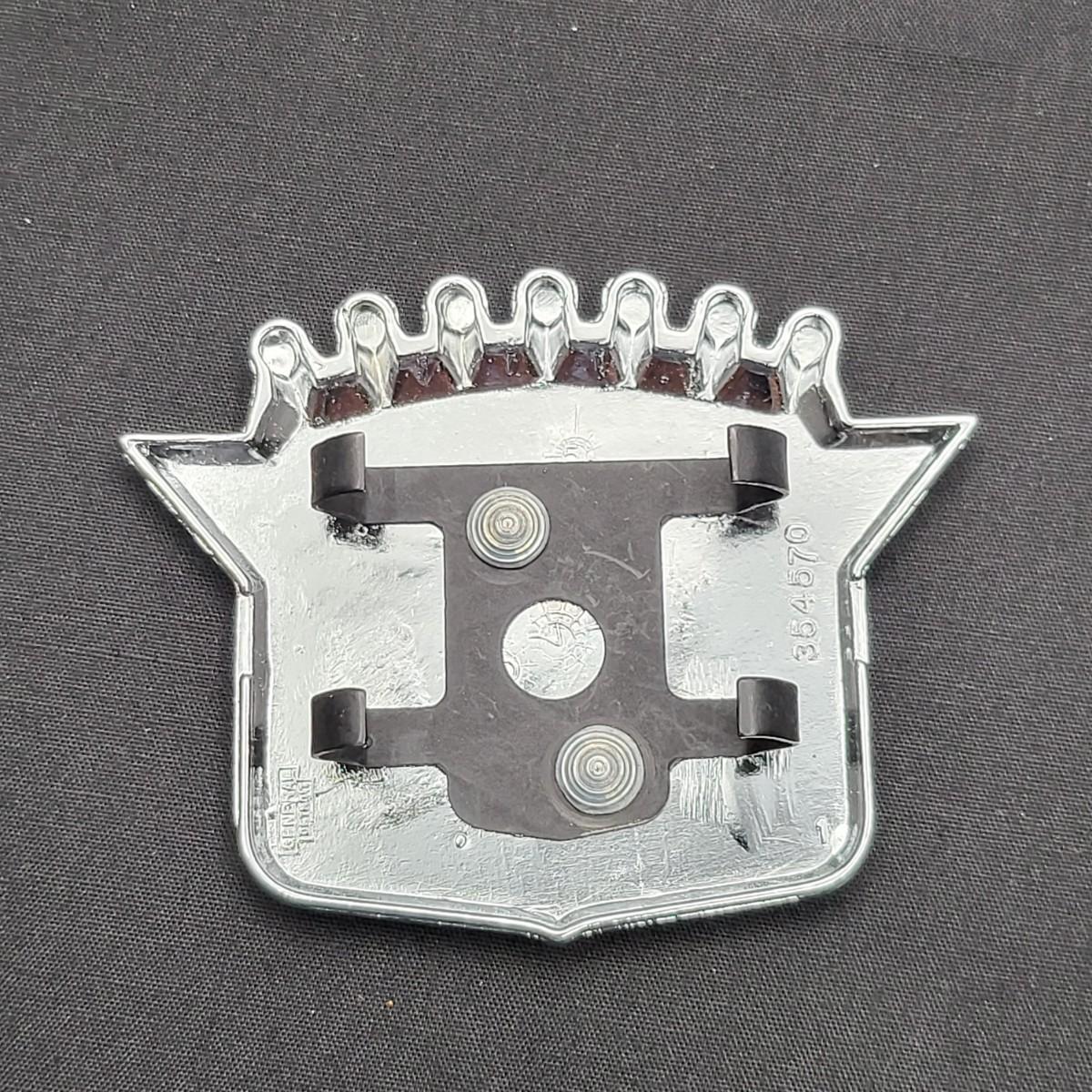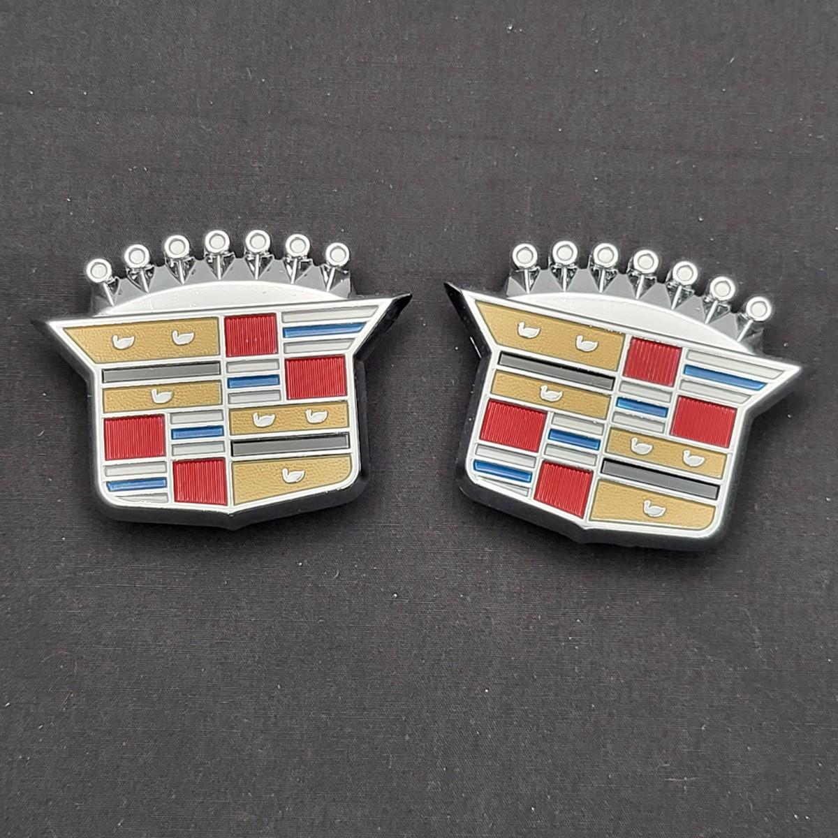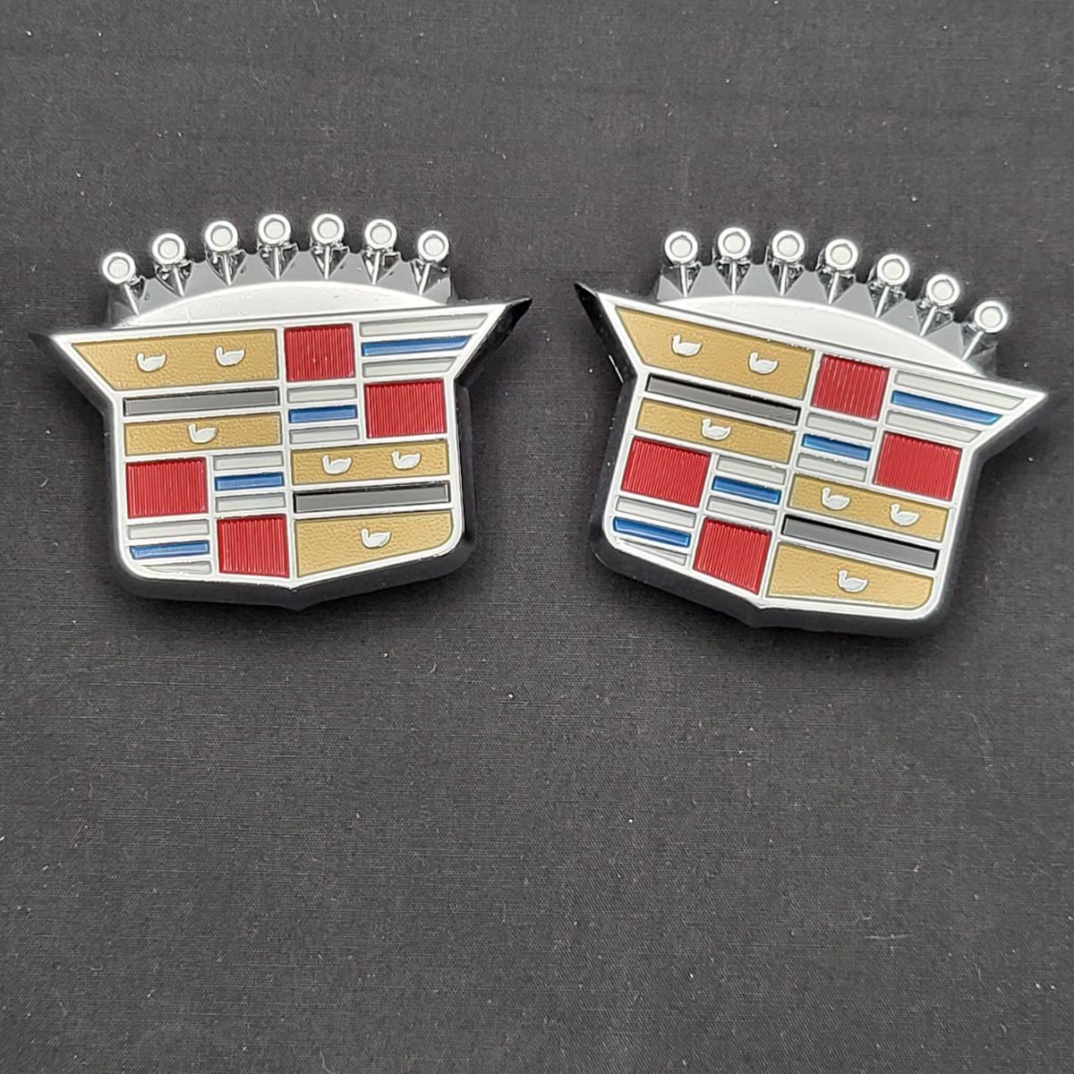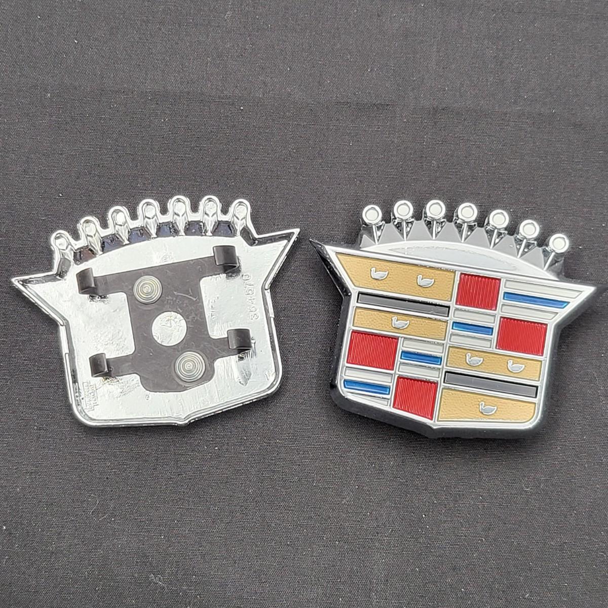 A pair of wheel hub cap clip emblems for Cadillac. Number 354570.