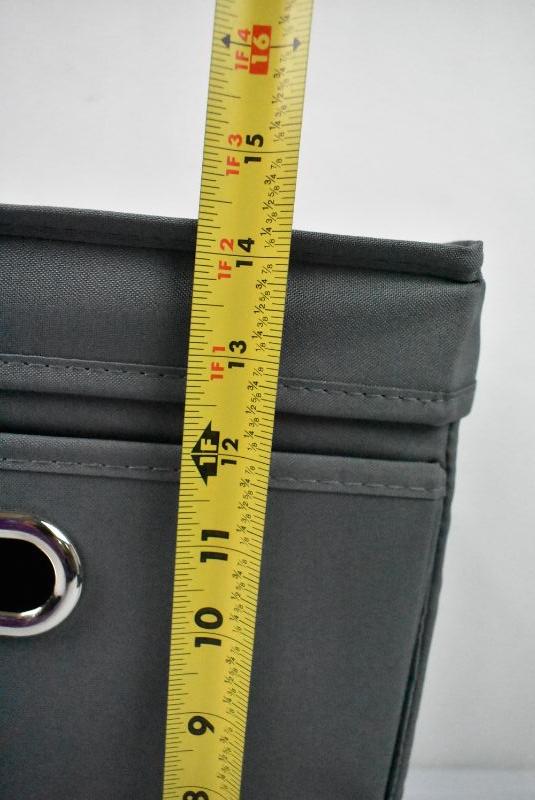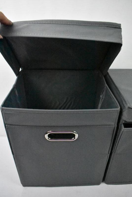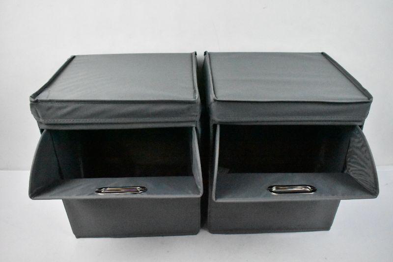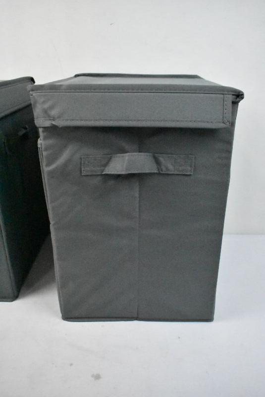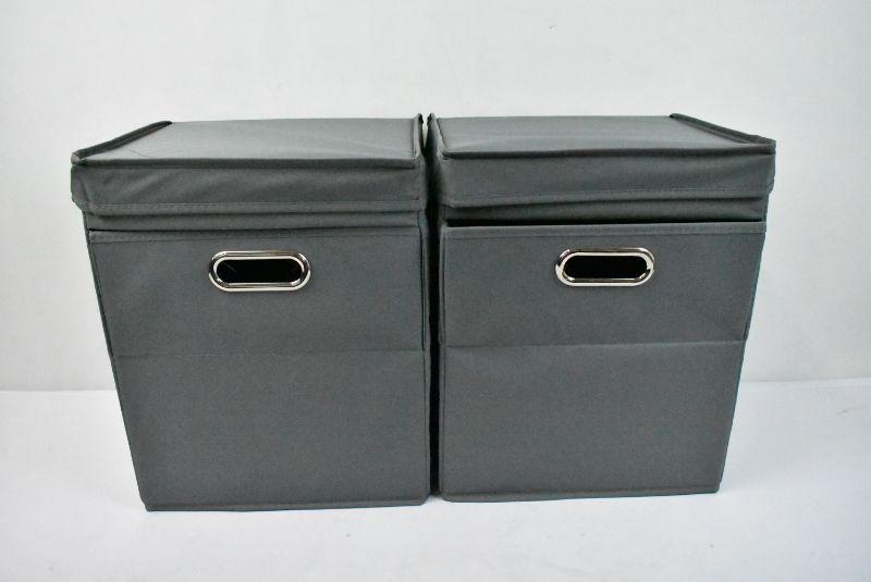 2 Canvas Bins, Gray. Attached Lids, Front Access, Side Handles. No packaging - New