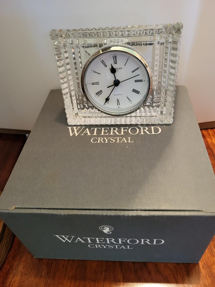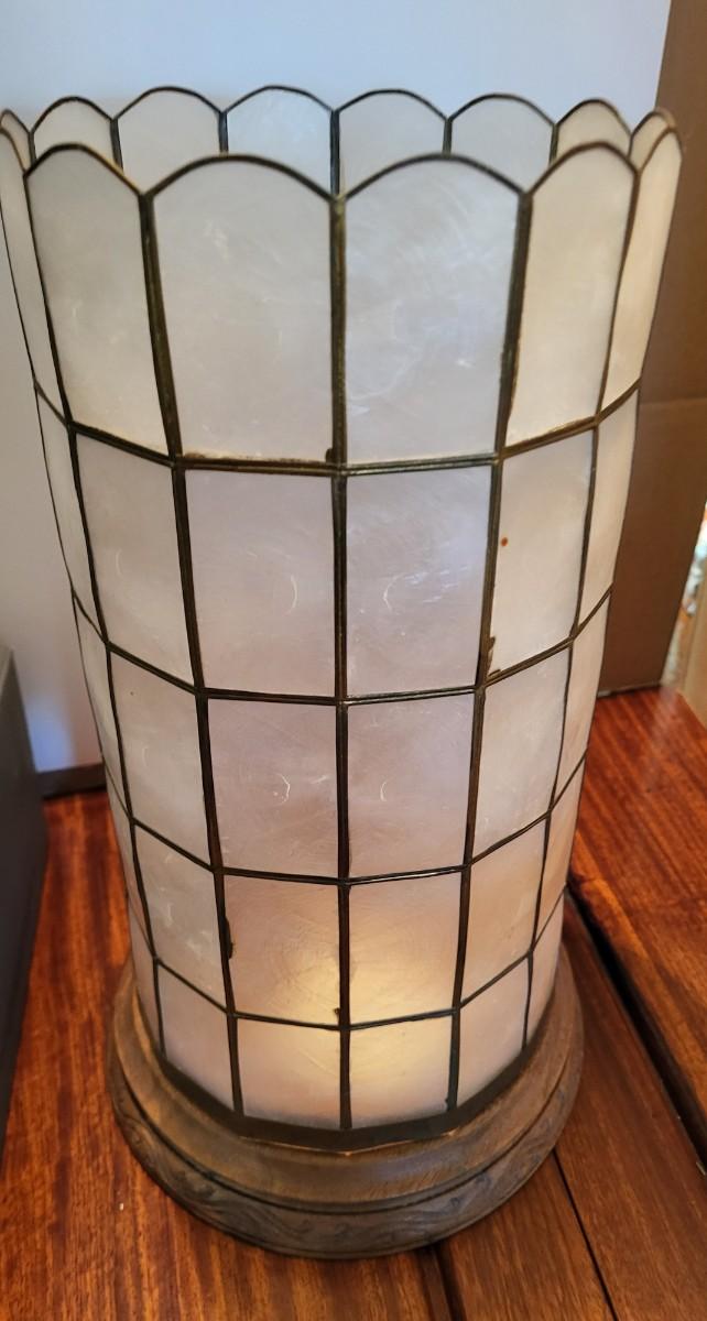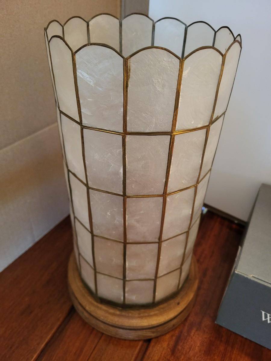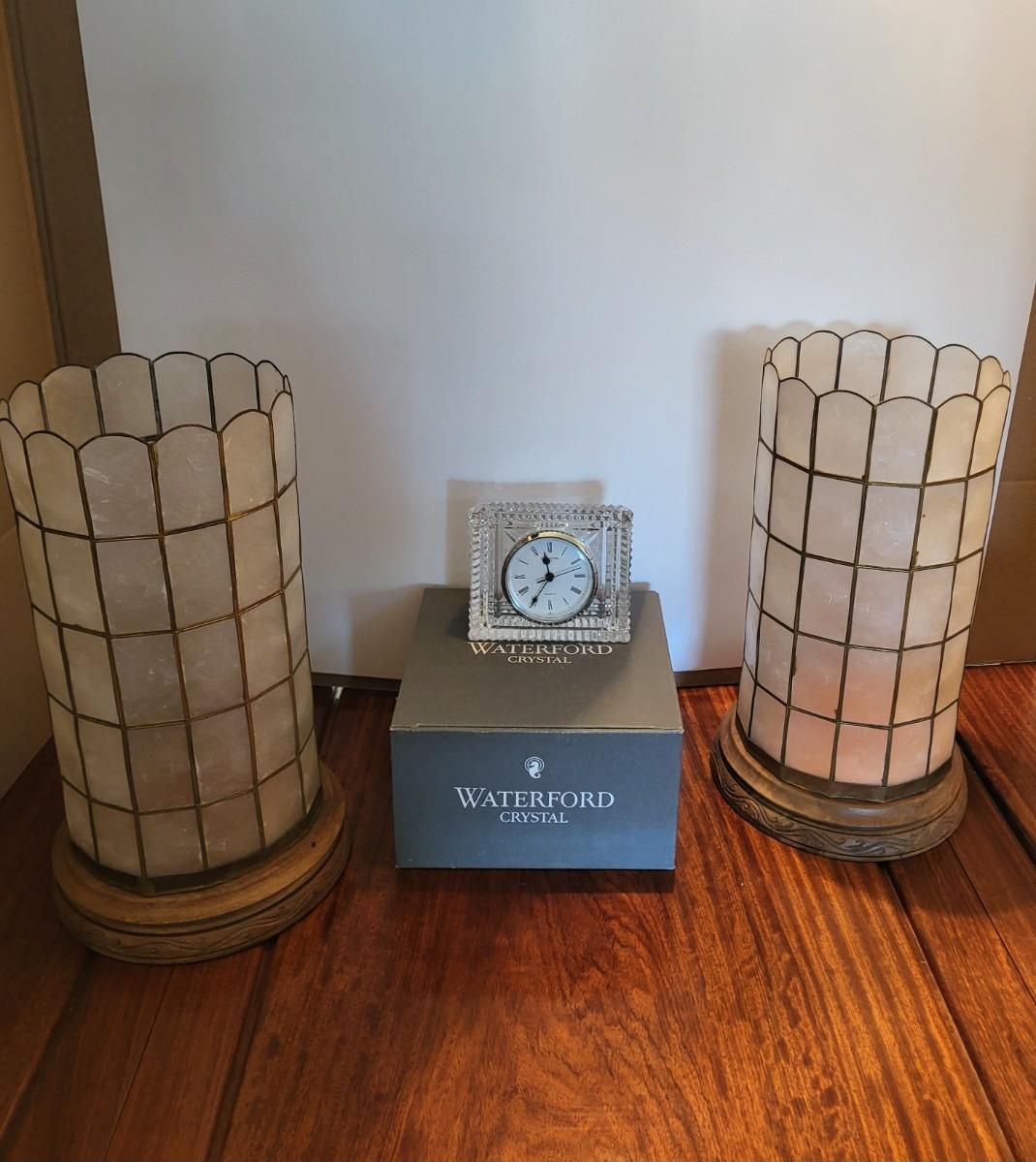 2 CAPIZ SHELL HURRICANES AND A WATERFORD CRYSTAL CLOCK