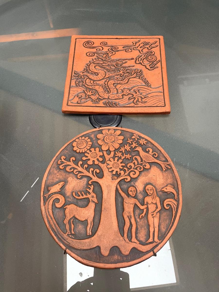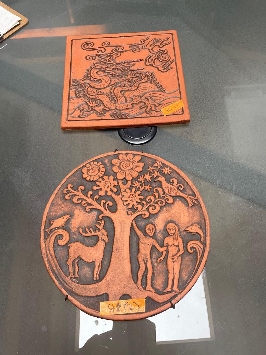 2 Carved TERRA COTTA PLAQUES 1 Round, 1 Square