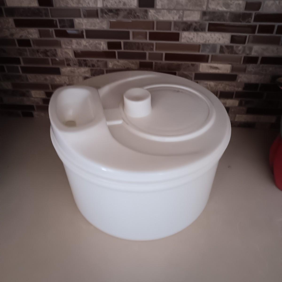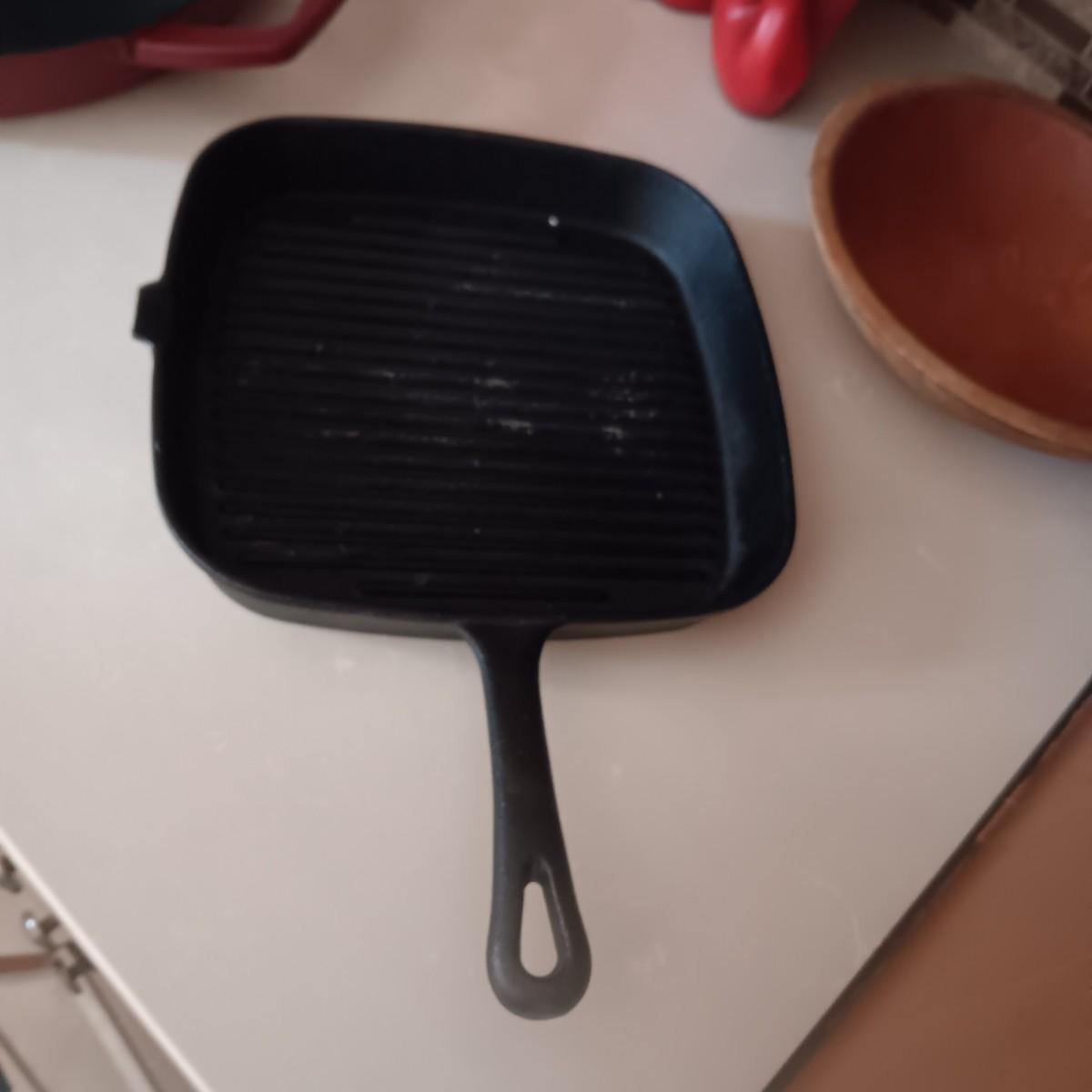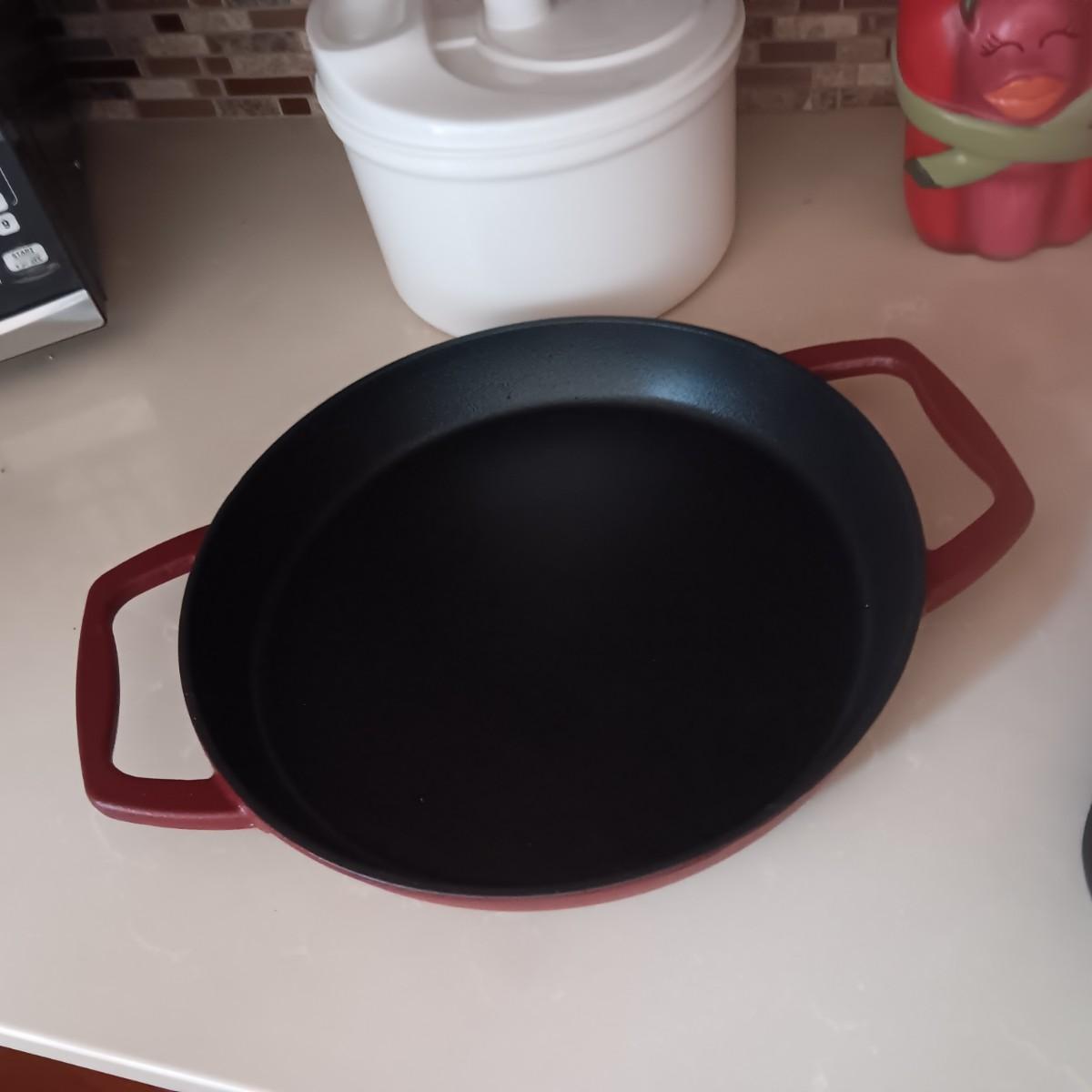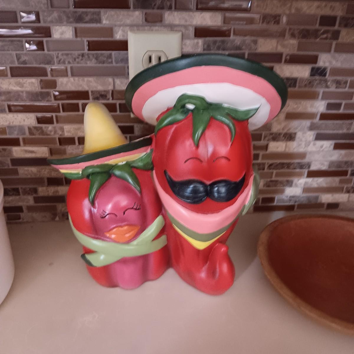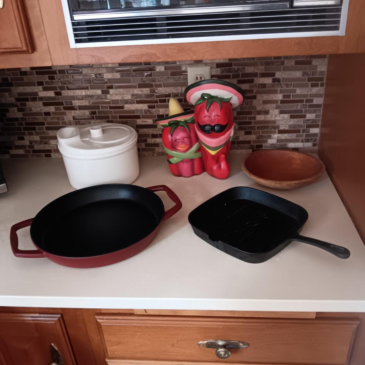 2 CAST IRON SKILLETS, WOOD DOUGH BOWL, CHILI DECOR AND SALAD SPINNER