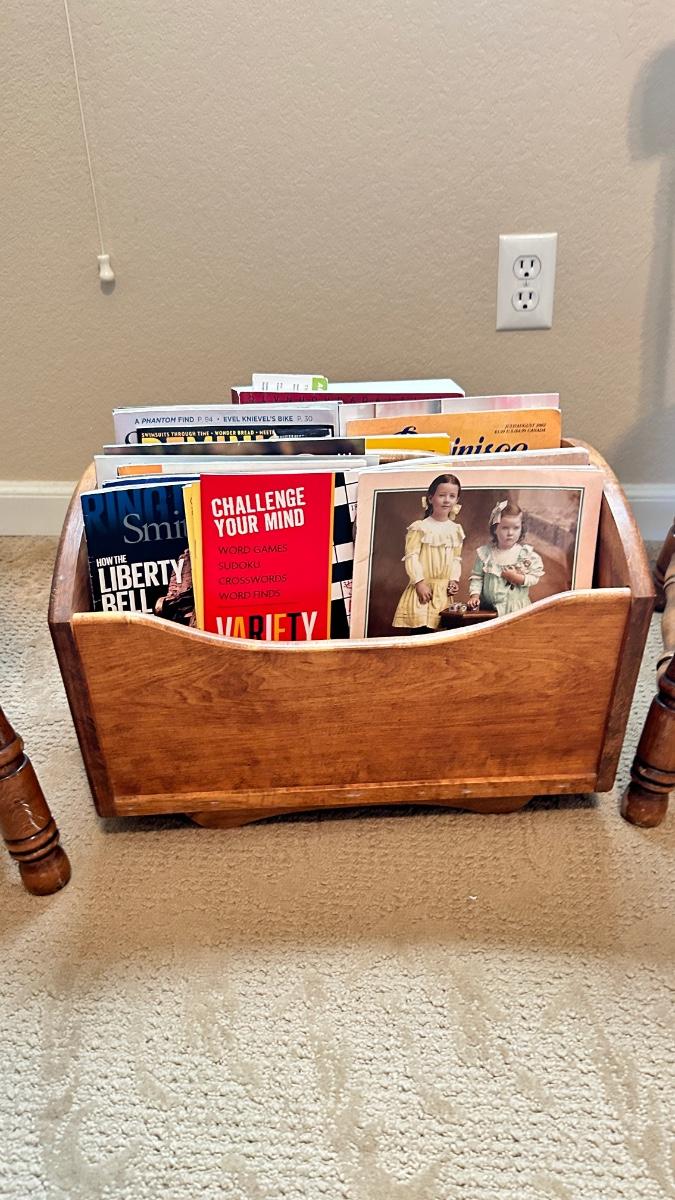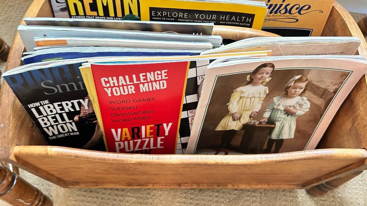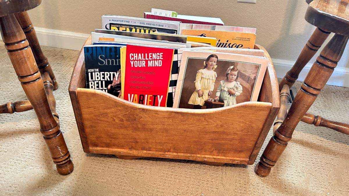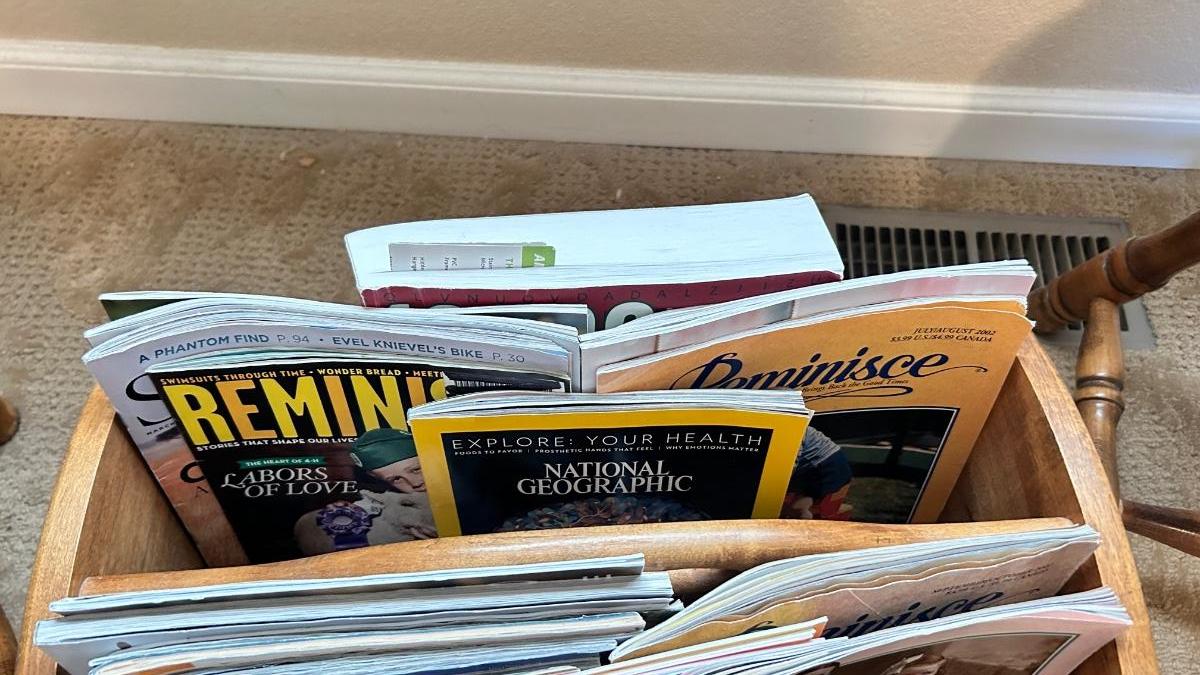 2 CHAIRS AND A MAGAZINE RACK PACKED WITH REMINENCSE, SMITHSONIAN, AND OTHER MAGAZINES
