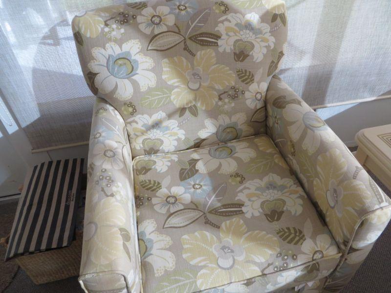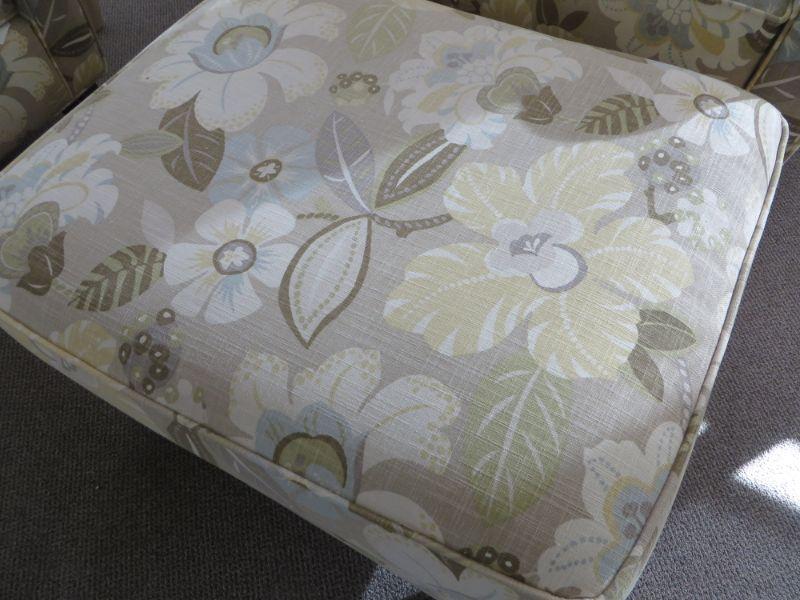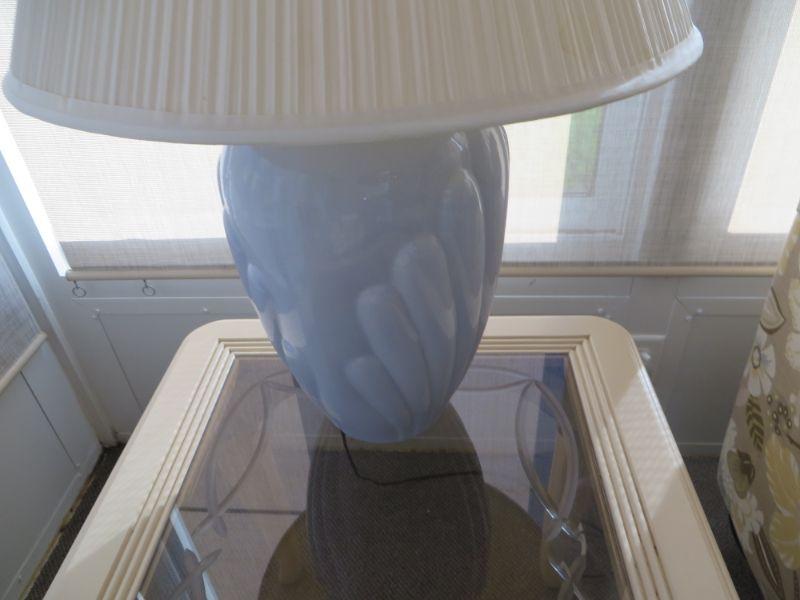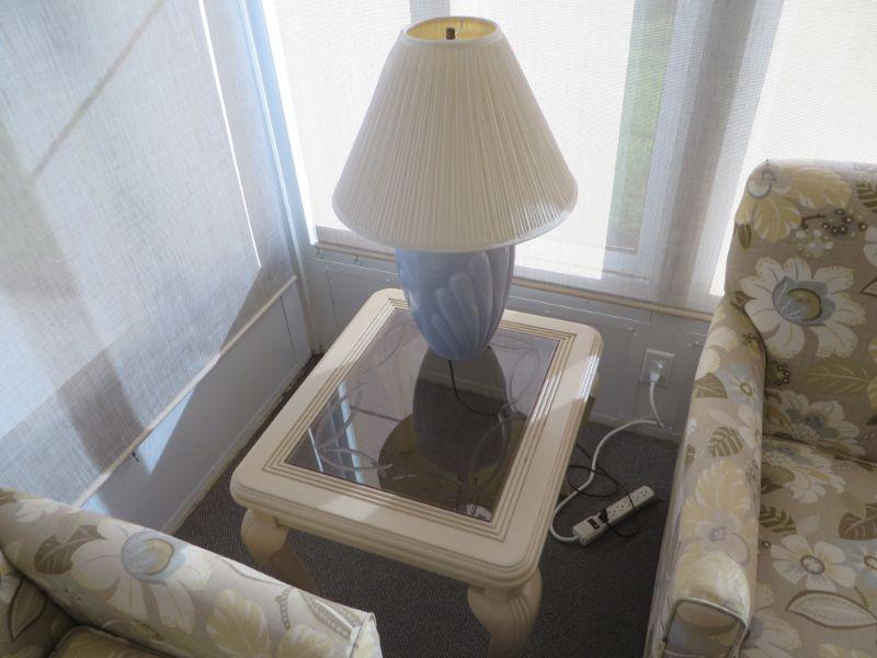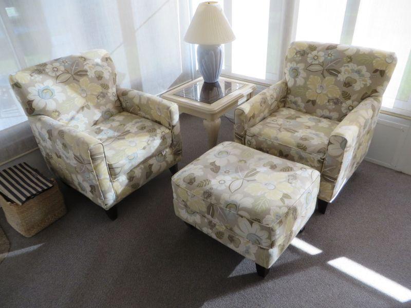 2 Chairs with Ottoman, Table and Blue Ceramic Lamp