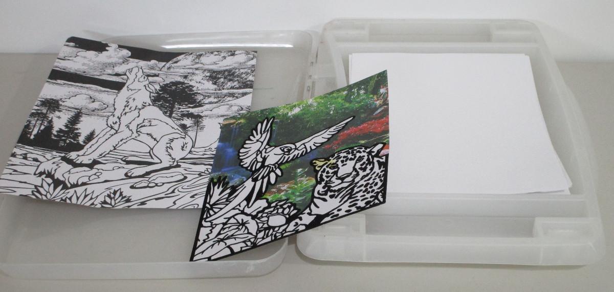 Children's lap desk with a lot of paper and a couple of pictures