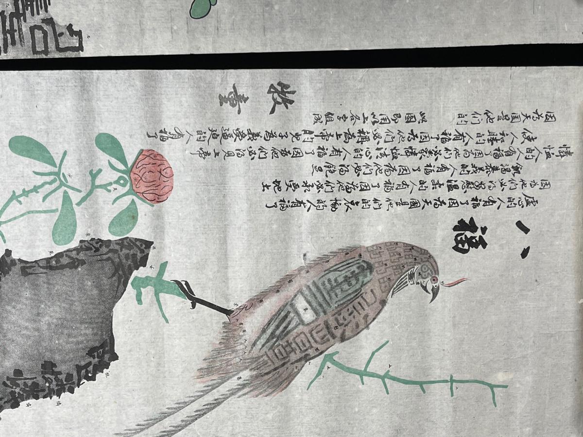 DESCRIPTION: This pair of scrolls are detailed The Lords’s Prayer and The Beatitudes written in Chinese script and landscapes. One renders an abstracted pagoda platform structure, the other with a hunting bird of pray perched in a tree. See photos for condition.