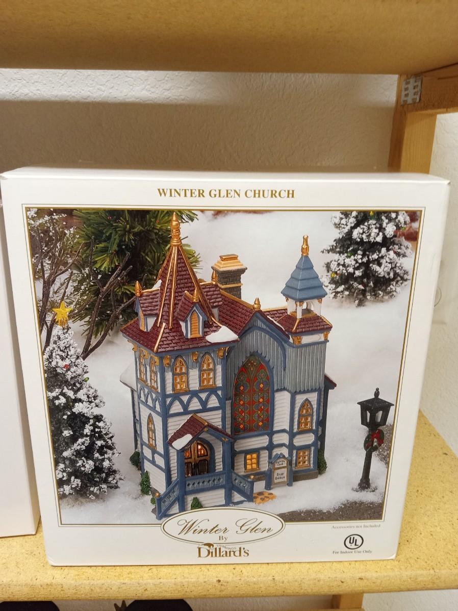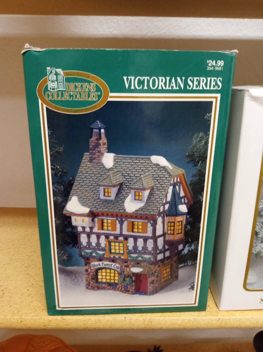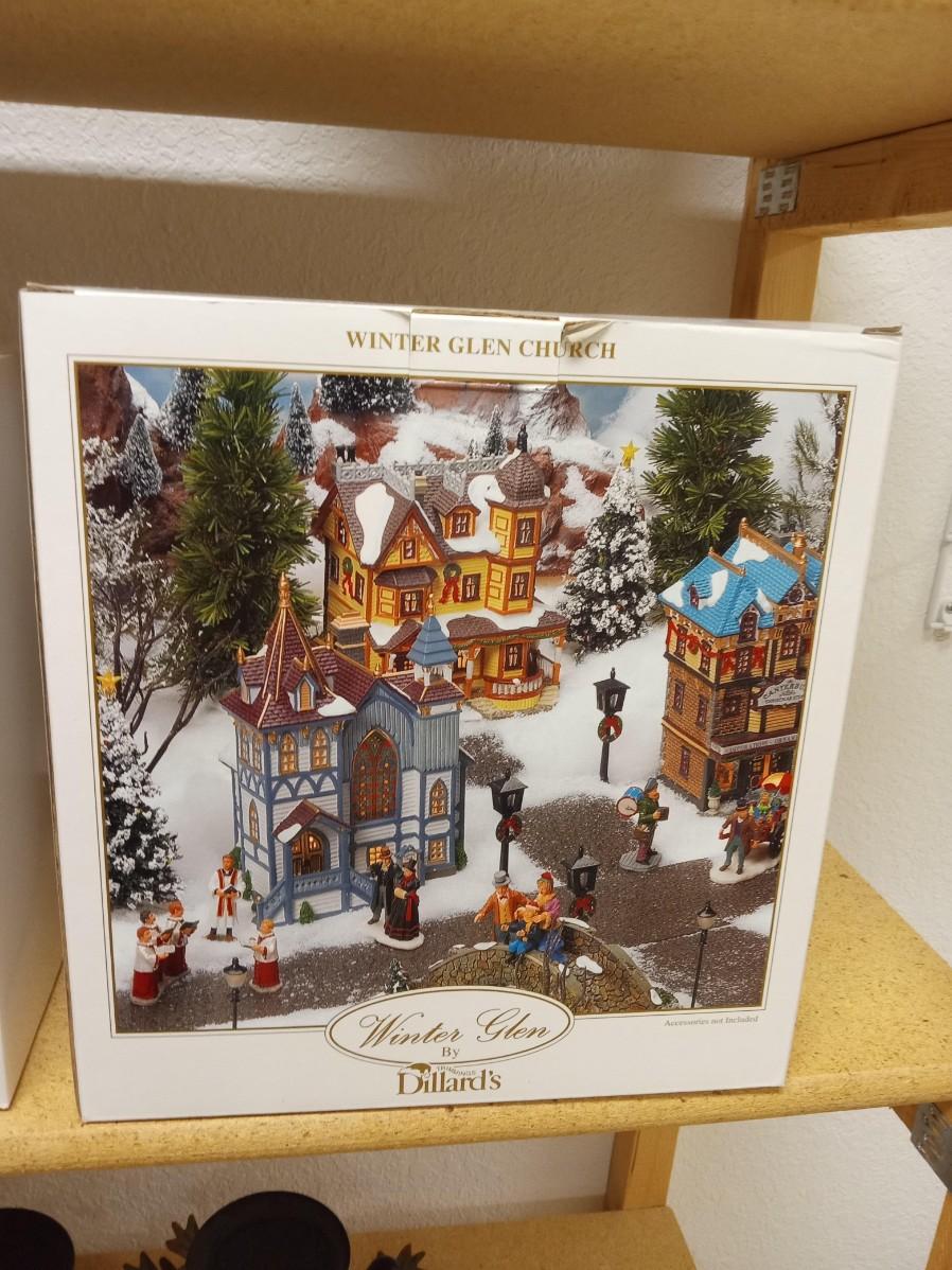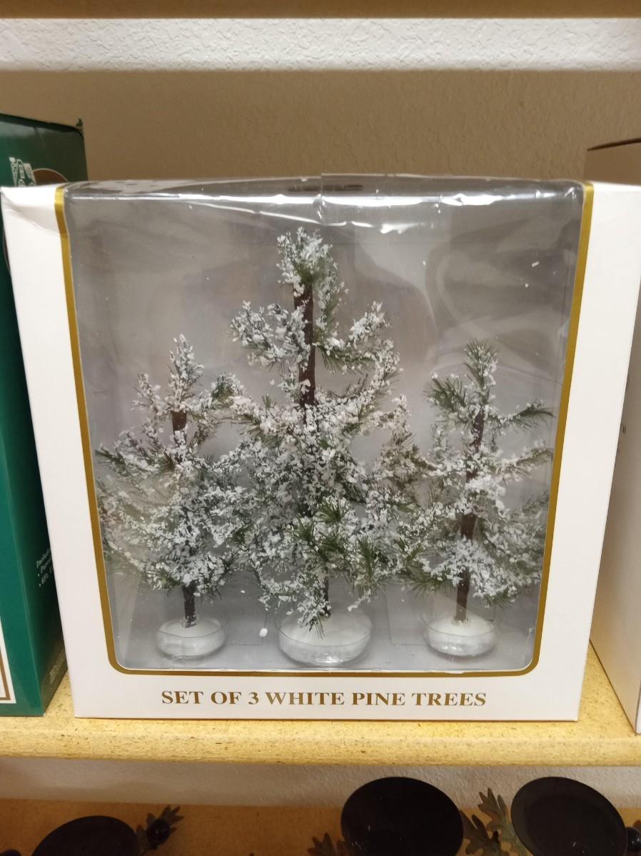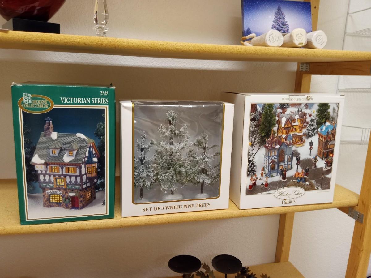 2 CHRISTMAS VILLAGE TYPE BUILDINGS AND SOME TREES