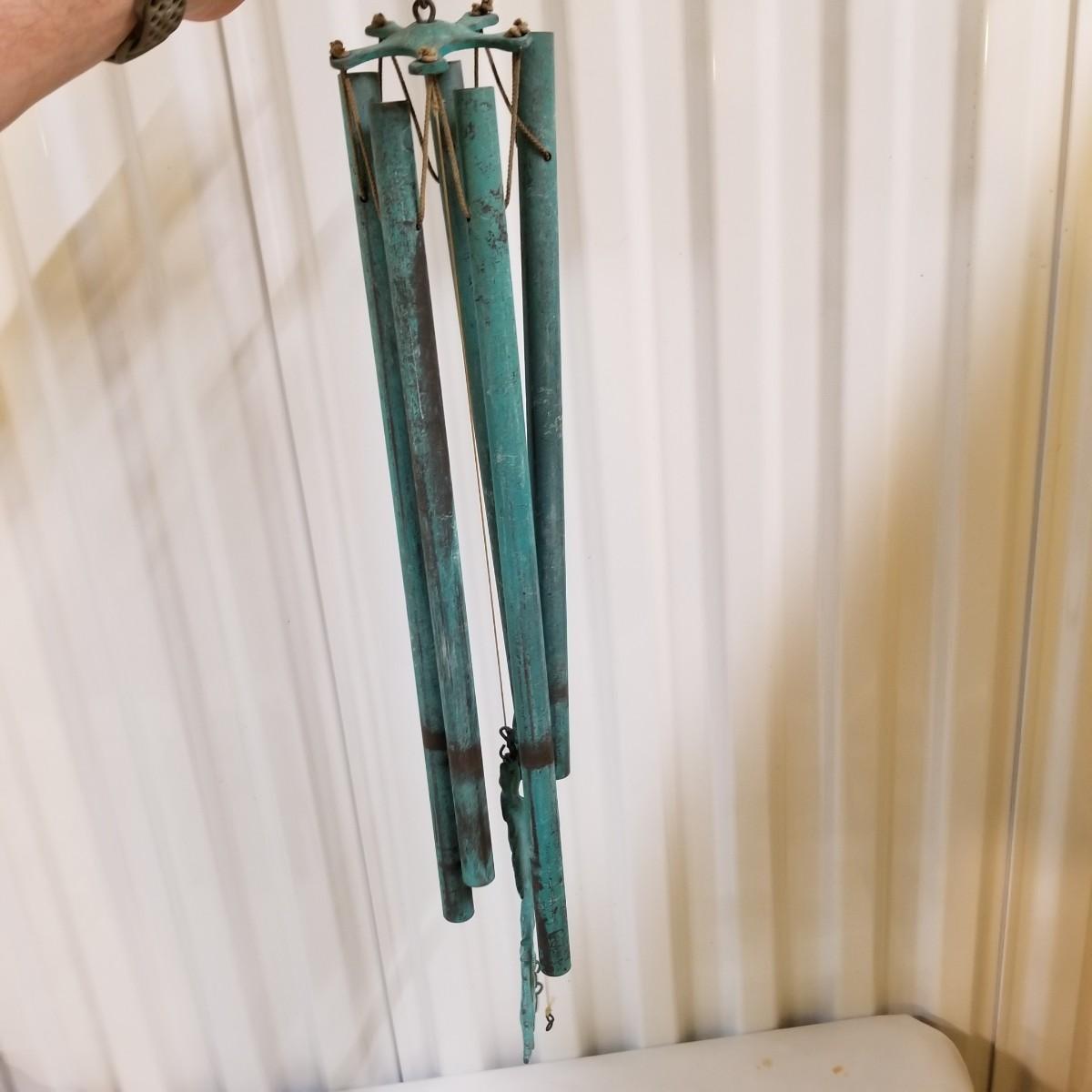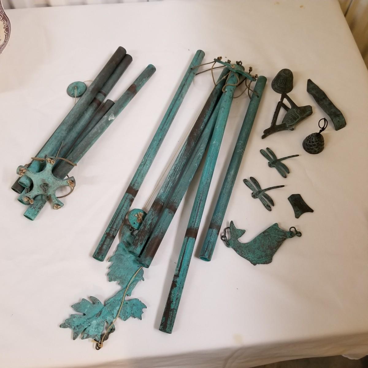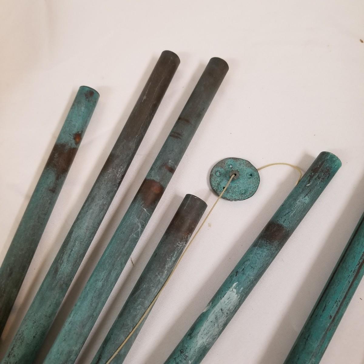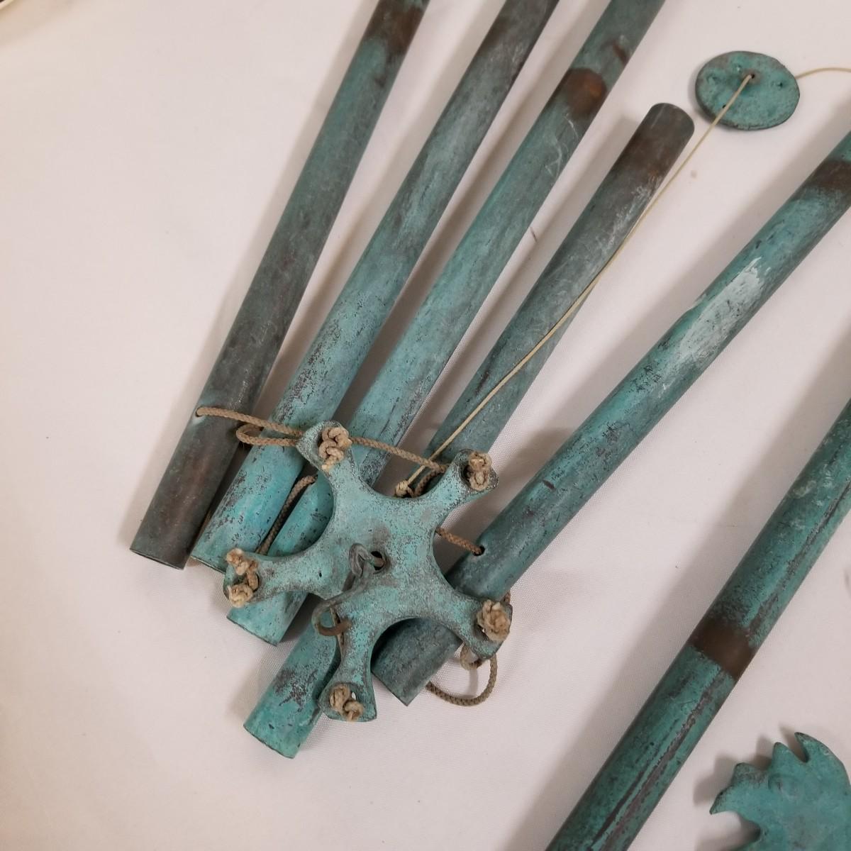 A pair of nicely patinaed copper chimes.  Round tubes and stylized ringers plus several additional add ons. Large chime is 24" long and the shorter one is 15".  See photos for detail.  Shipping available.