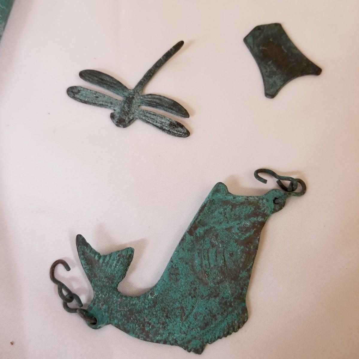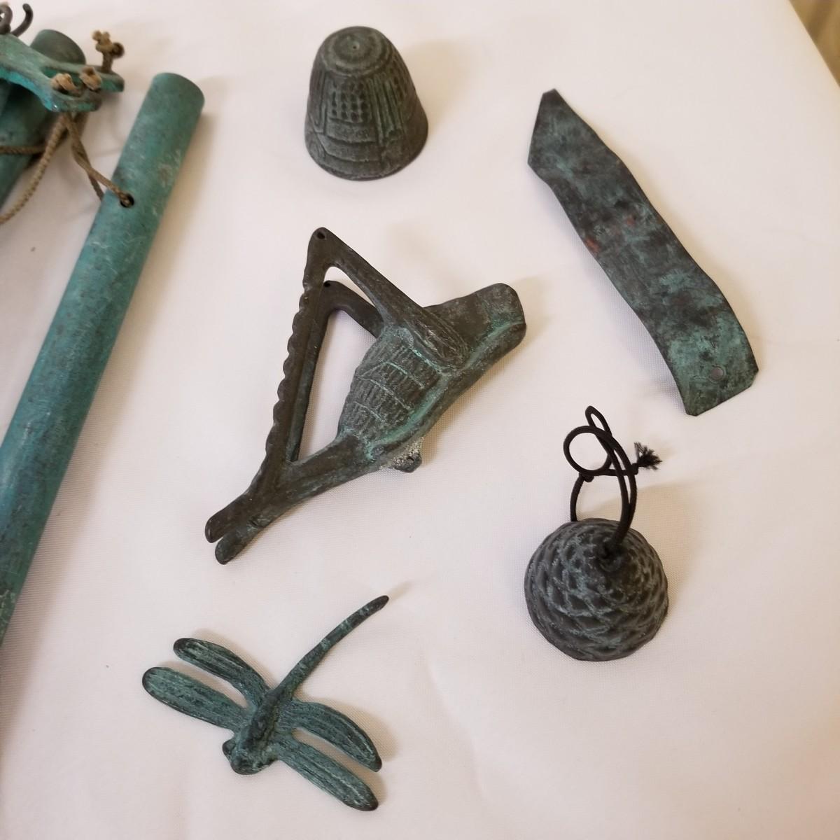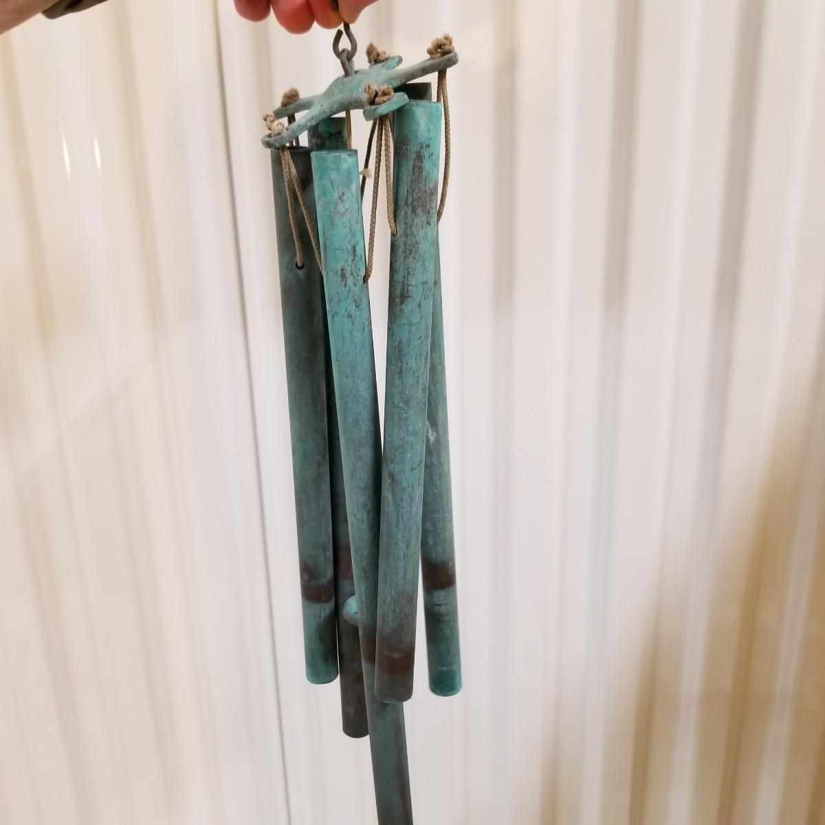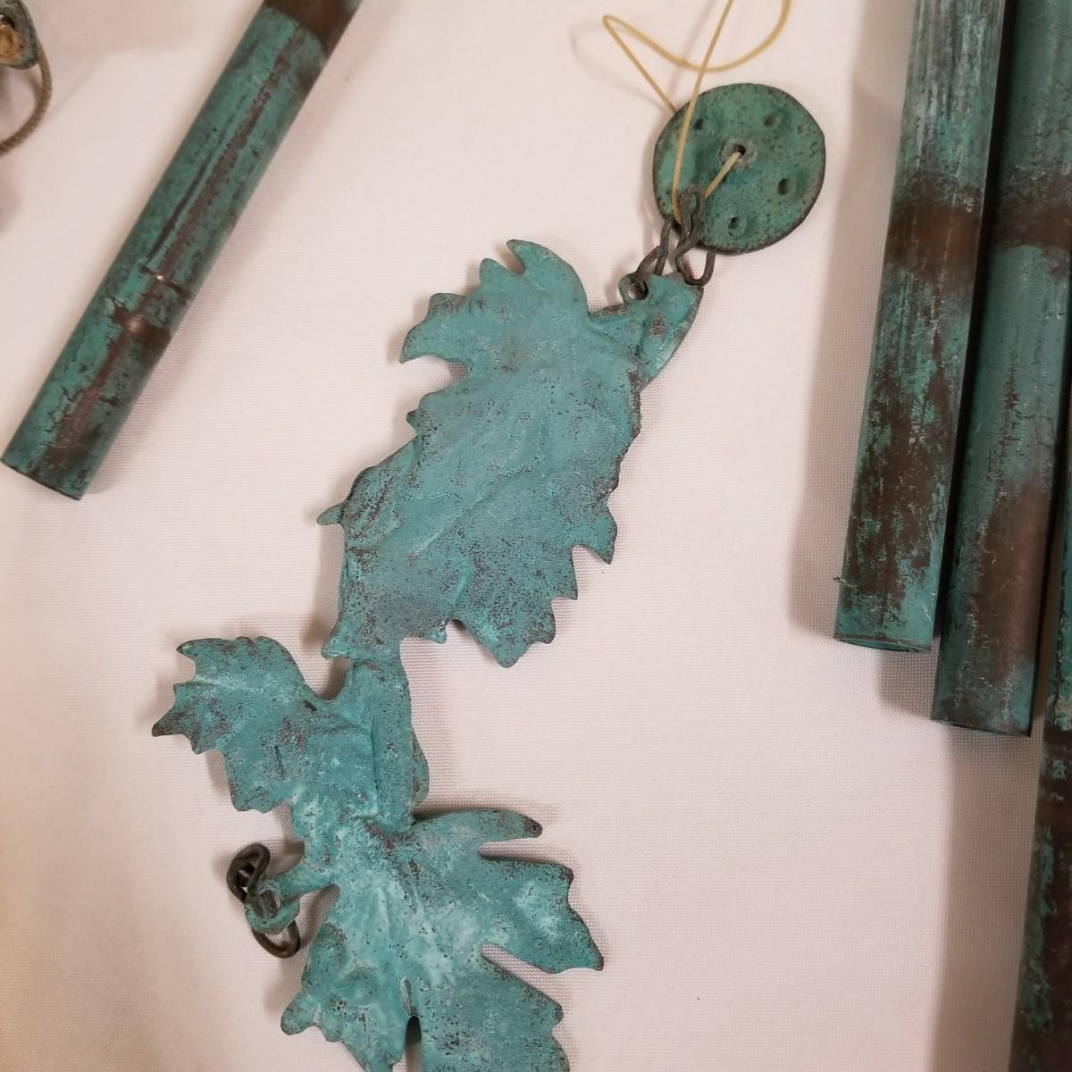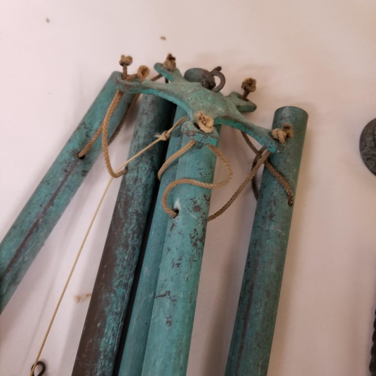 A pair of nicely patinaed copper chimes.  Round tubes and stylized ringers plus several additional add ons. Large chime is 24" long and the shorter one is 15".  See photos for detail.  Shipping available.