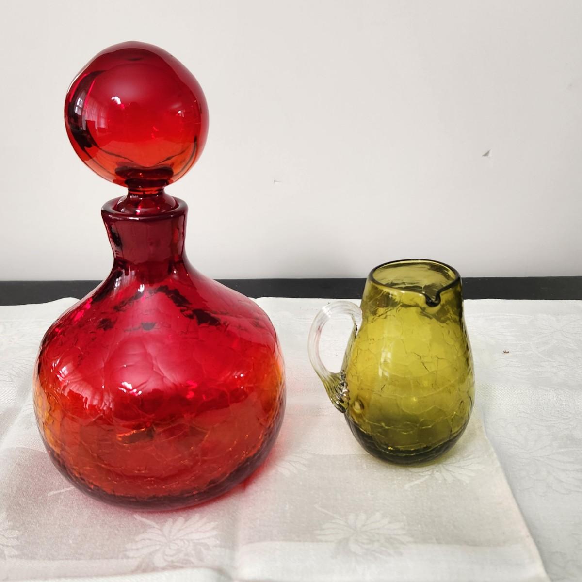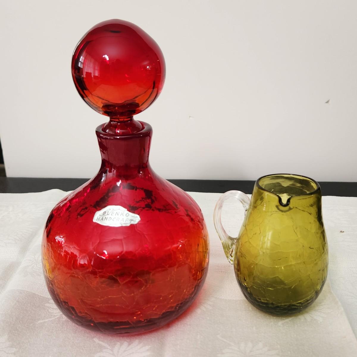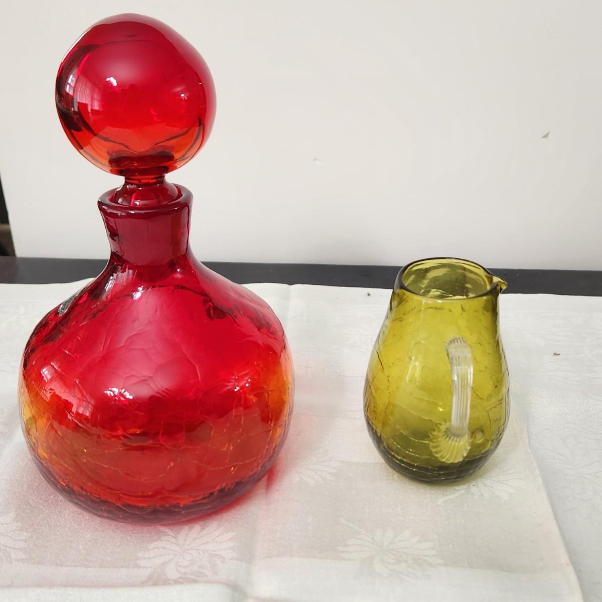 2 Crackle Glass  Amberina Red  Crackle  Blenko Decanter & Green Crackle Pitcher
