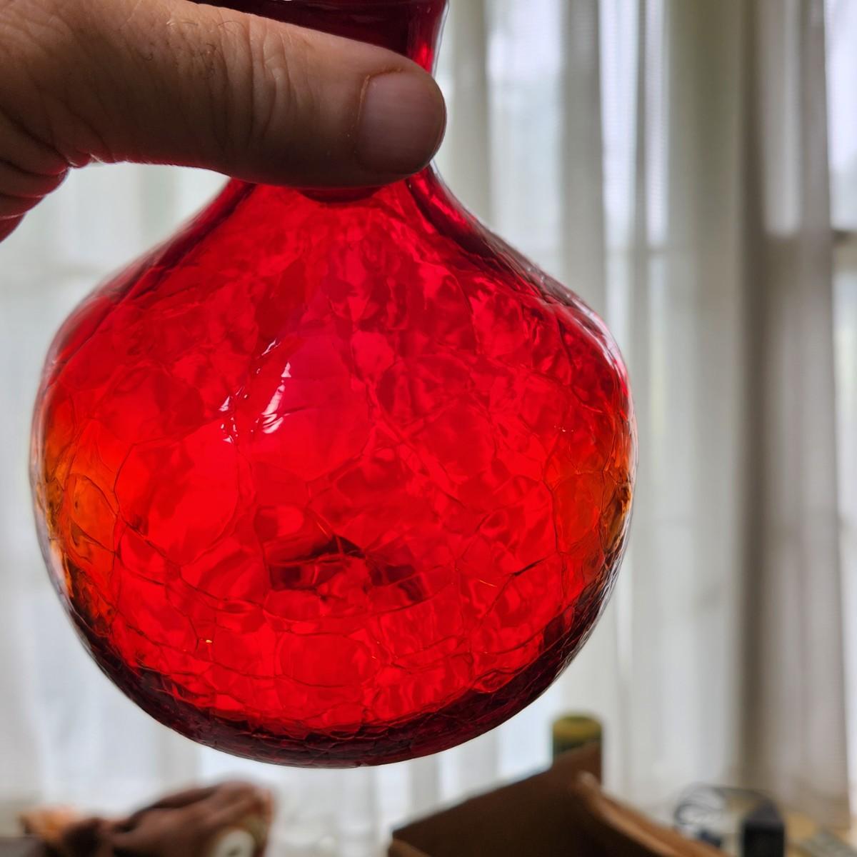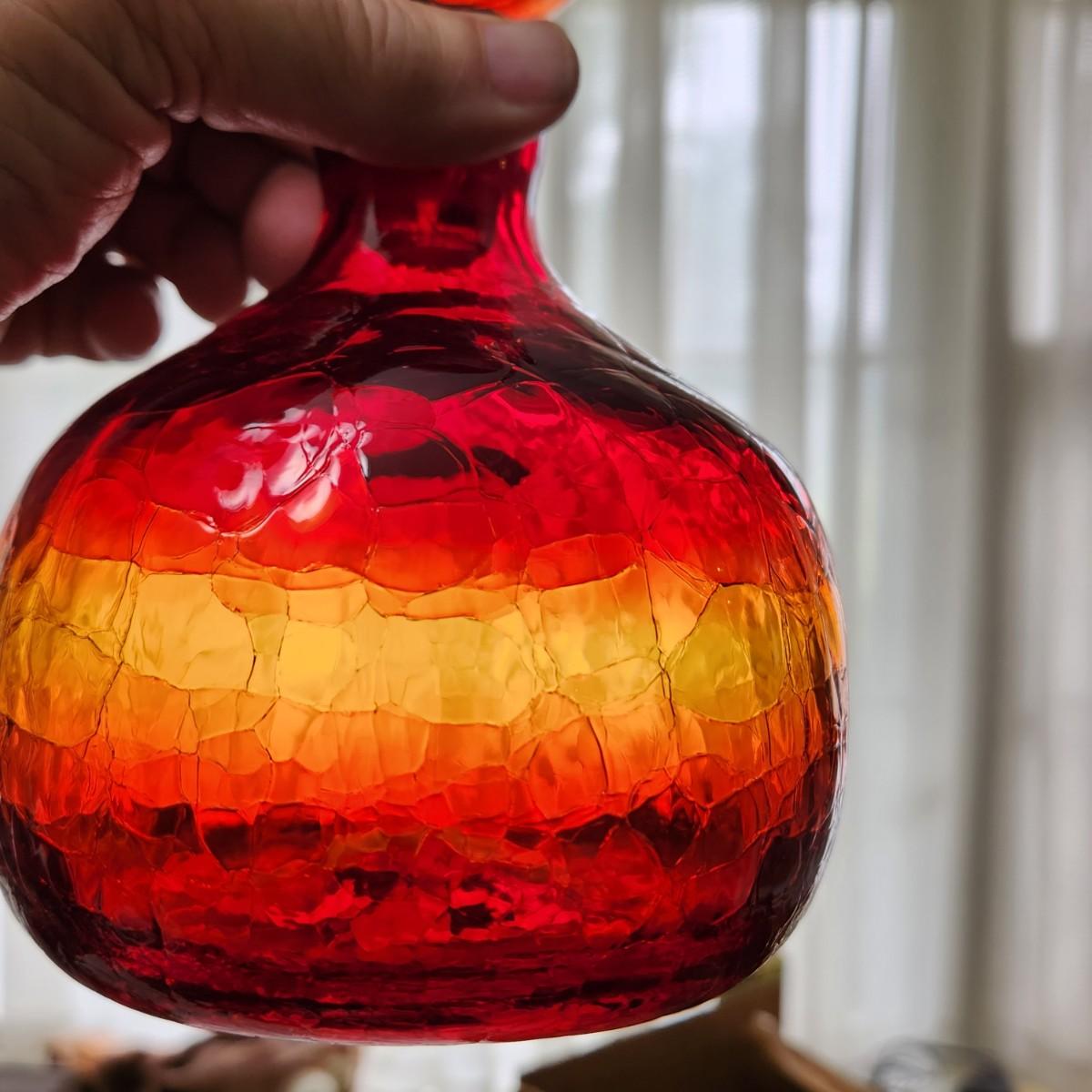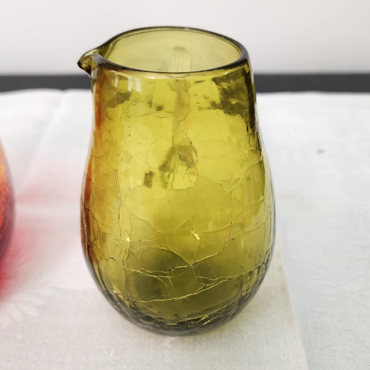 2 Crackle Glass  Amberina Red  Crackle  Blenko Decanter & Green Crackle Pitcher