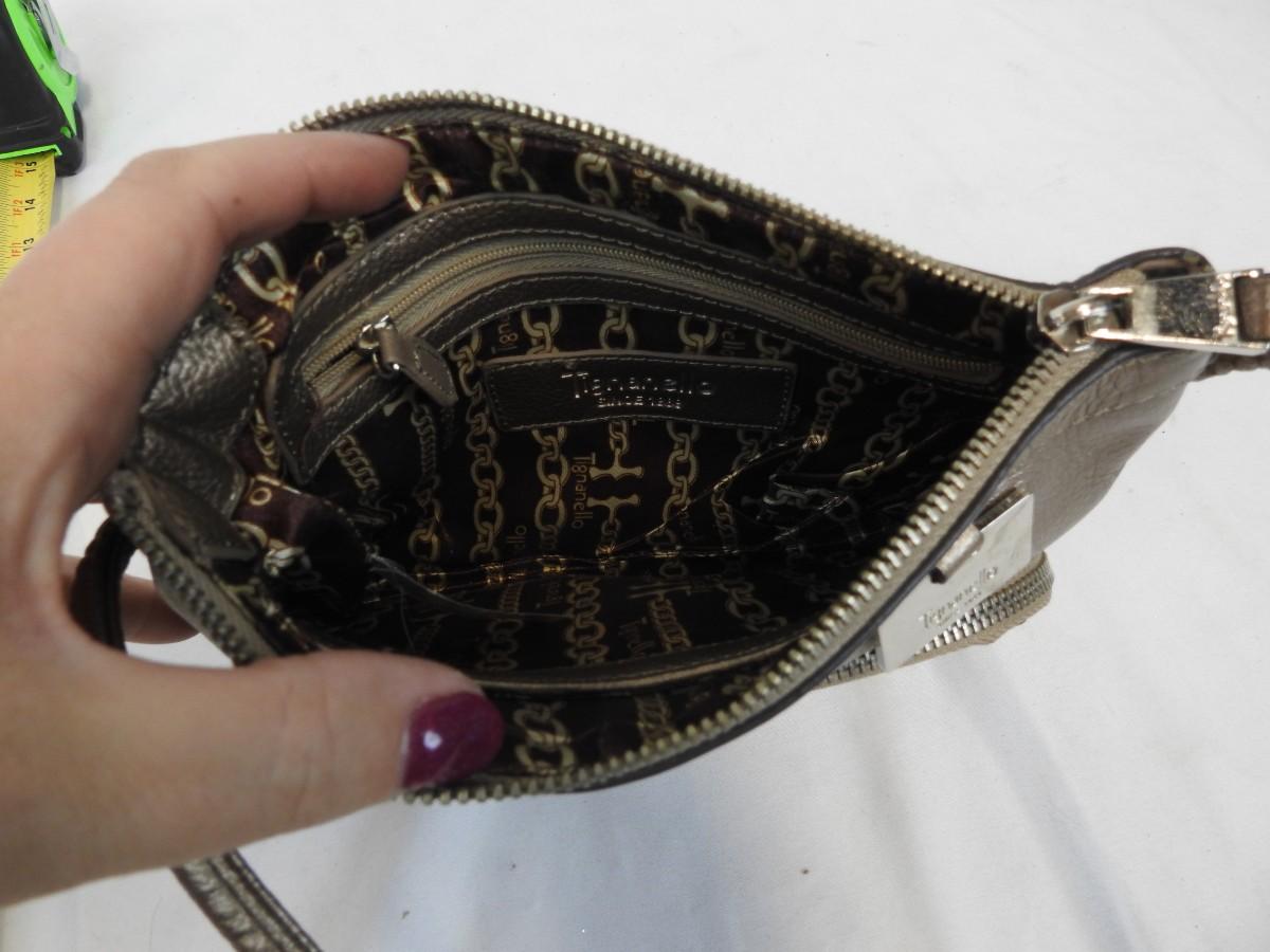 2 Cross Body Purses by Tignanello: Black Envelope style with Removable Strap. Rose Gold Metallic