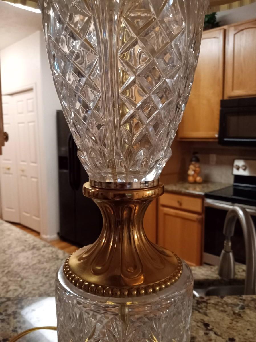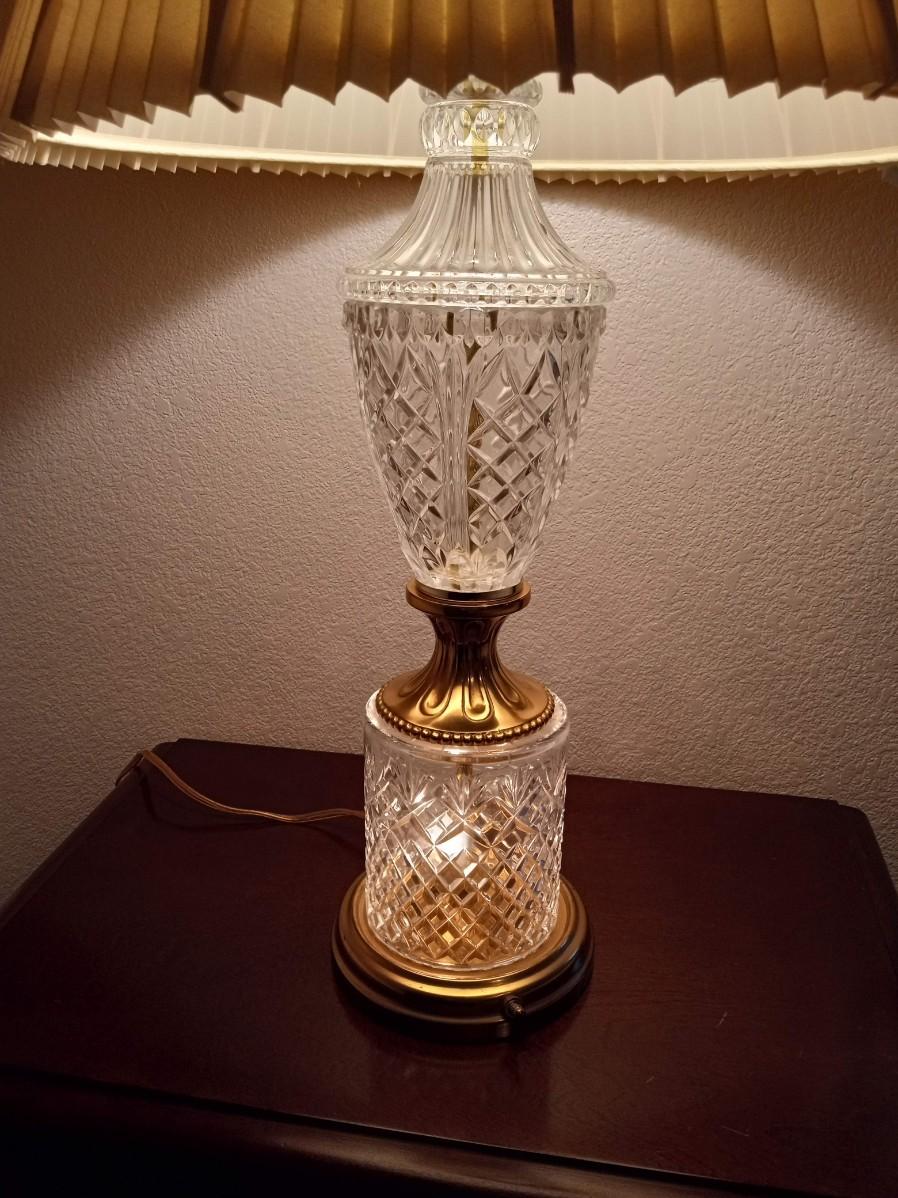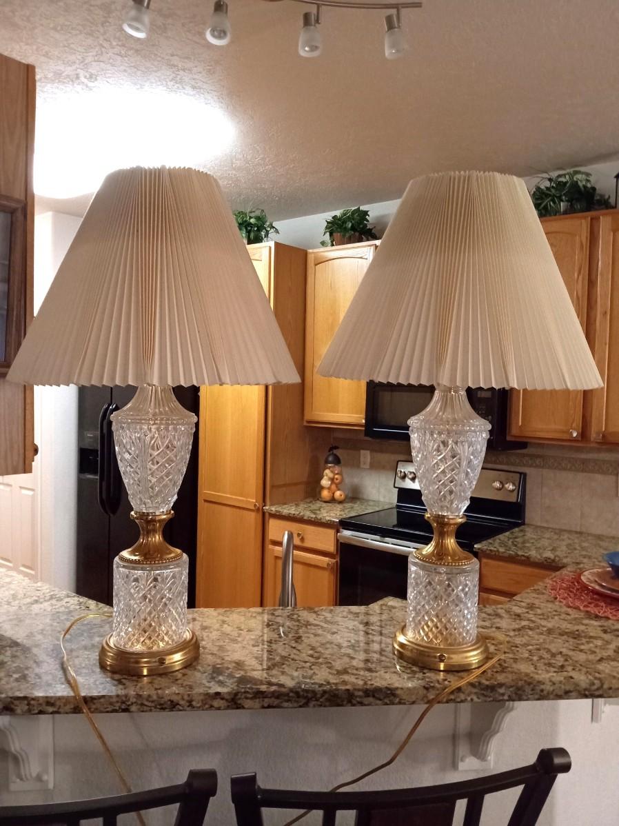 2 MATCHING CRYSTAL LAMPS THAT LIGHT ON TOP AND HAVE A SECOND KNOB TO LIGHT THE BOTTOM. THEY STAND APPROX 34"