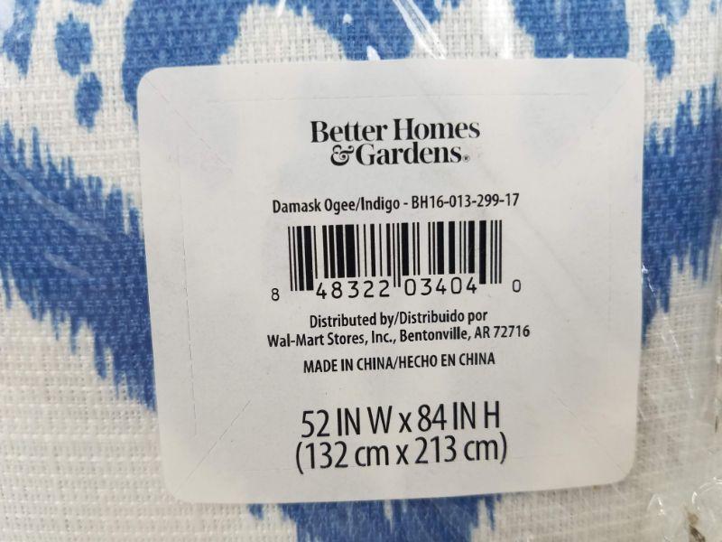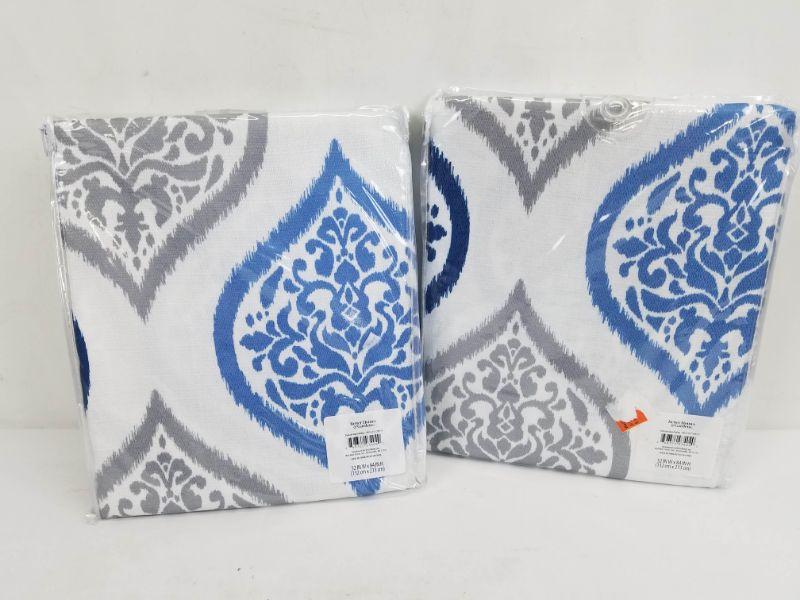 2 Curtain Panels, White w/ Gray & Blue. BH&G Damask Ogee/Indigo 52"x84" - New