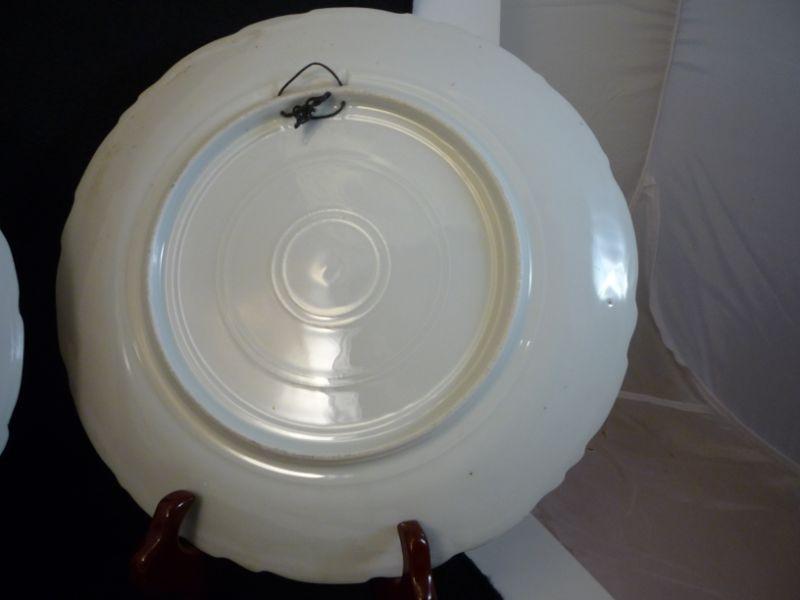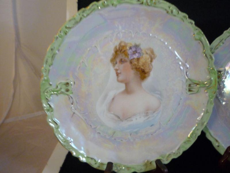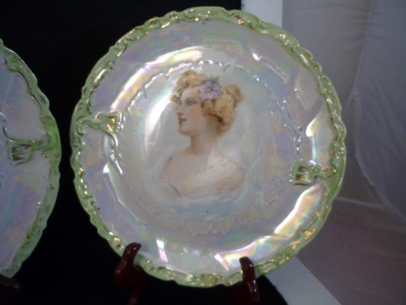 Two vintage/antique decorative wall hanging plates - matching image of lady with flower in her hair - opalascent color and green gold painted rim - unsigned - no manufacturer mark. Measure 10 inches across. One plate has old tag that says restore one chip - cannot see where repair was done --both ready to hang.