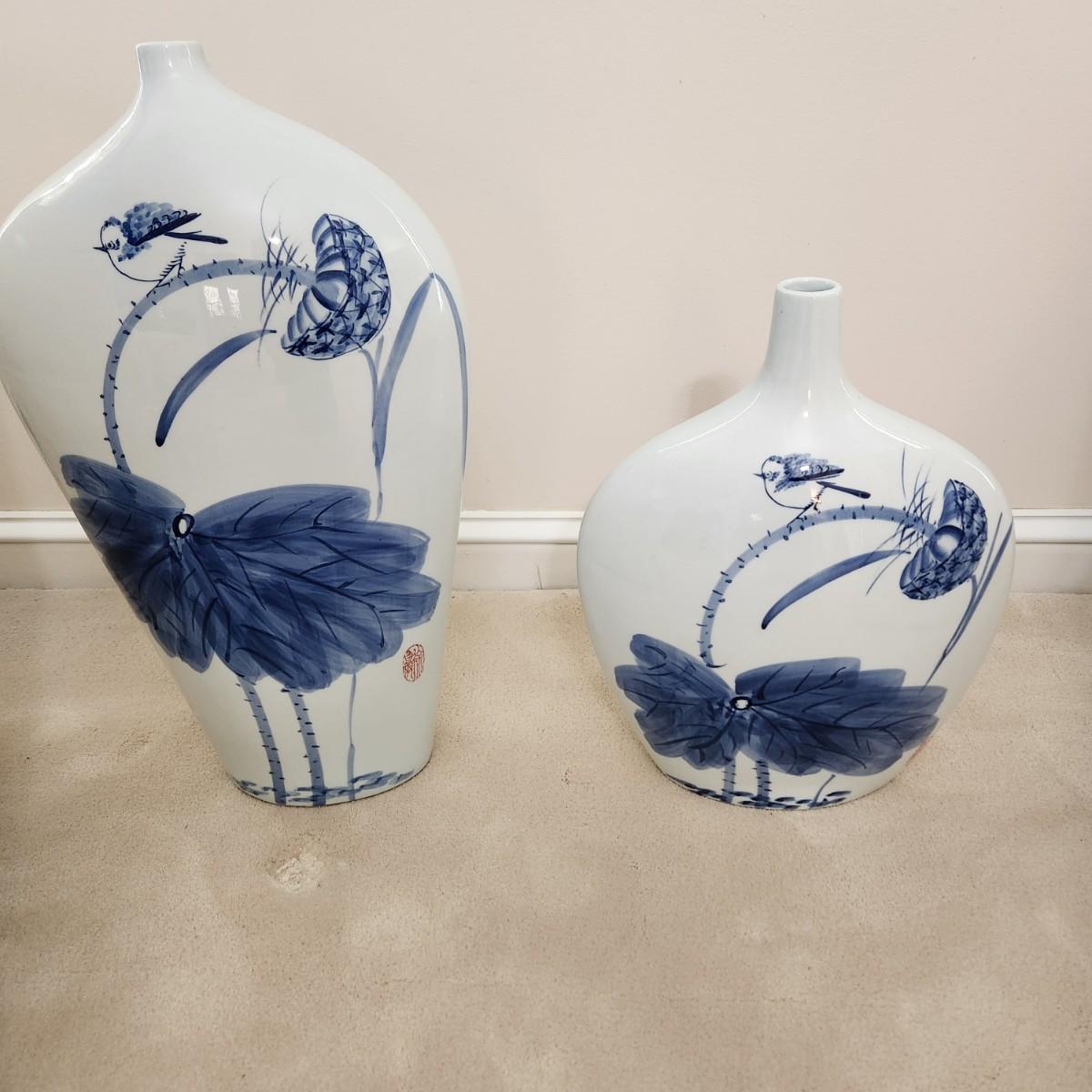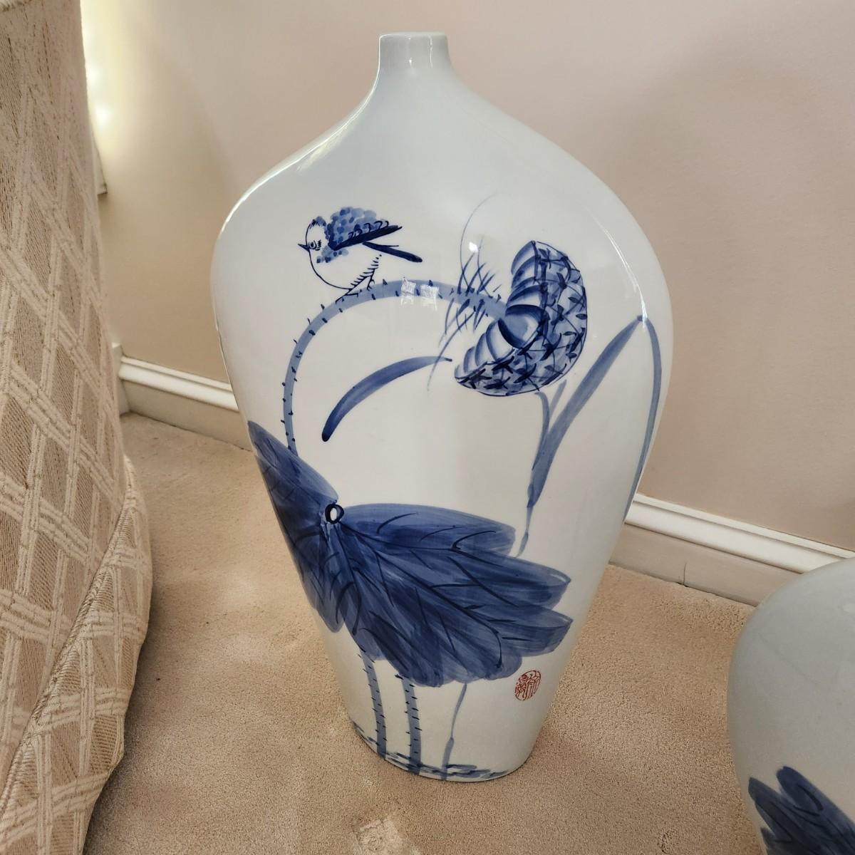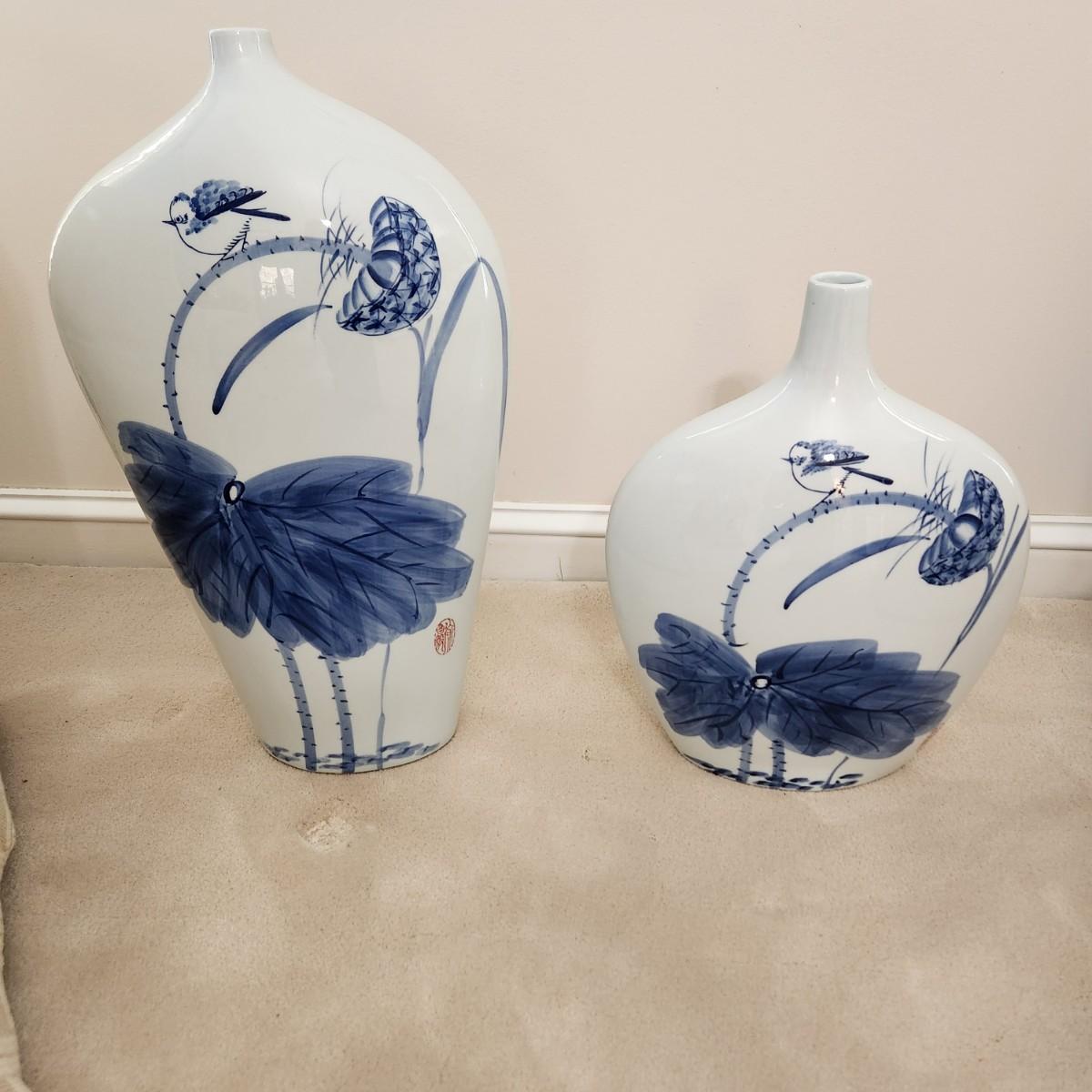 2 Decorative Blue and White Marsh Scene Vases