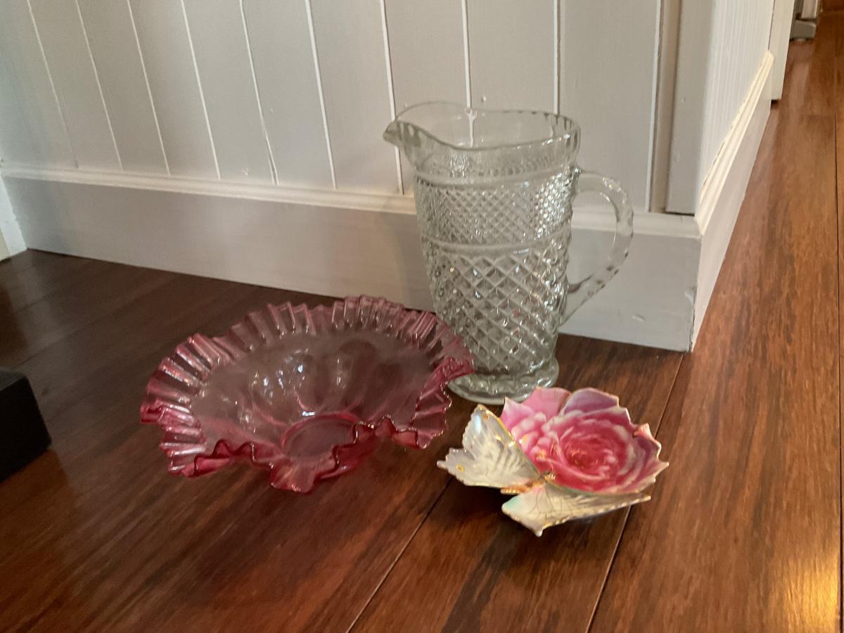 Crystal pitcher & 2 decorative bowls and 3 crystal glasses