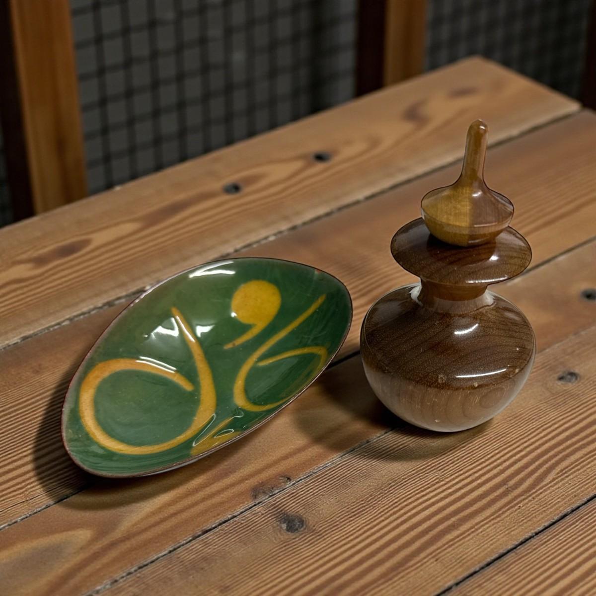 2 Decorative Items- Glazed Dish and Wood Turned Piece from OR