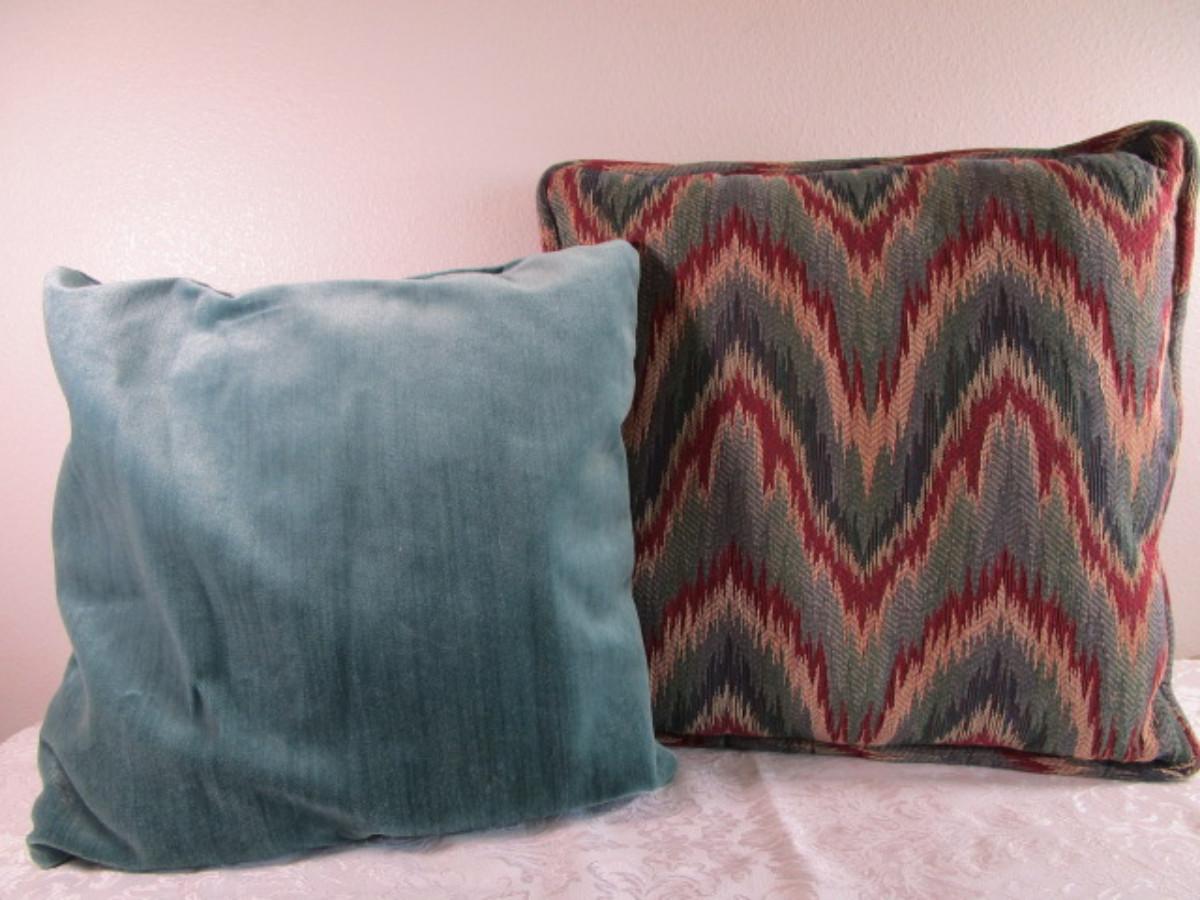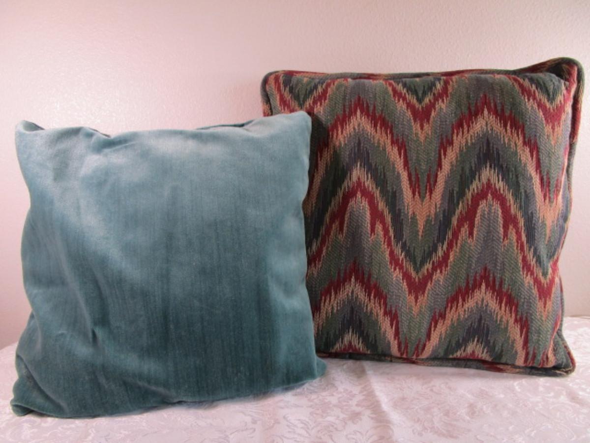 one is green velour 16" x 16"; one is patterned 18" x 18"