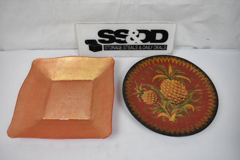 2 Decorative Plates: Orange Square & Round Red/Gold/Green