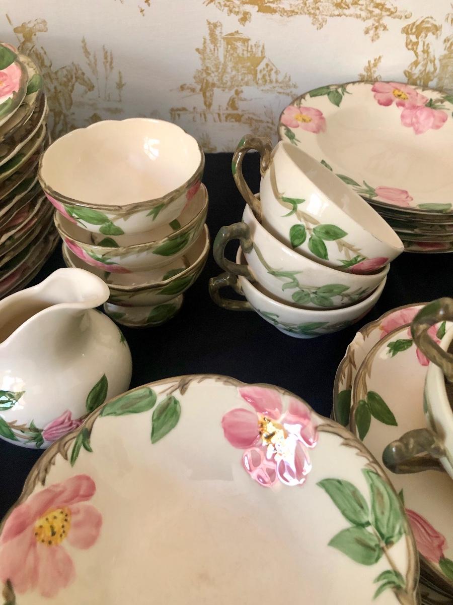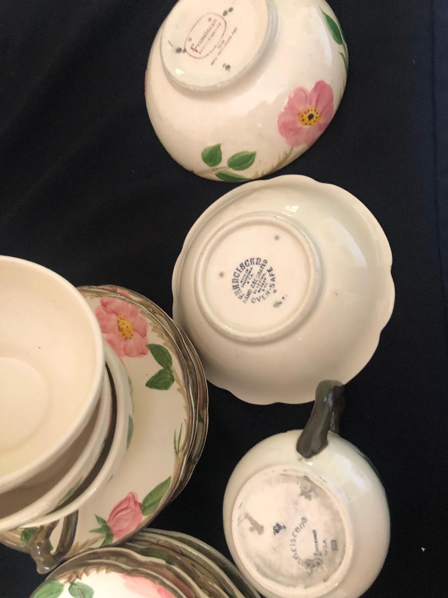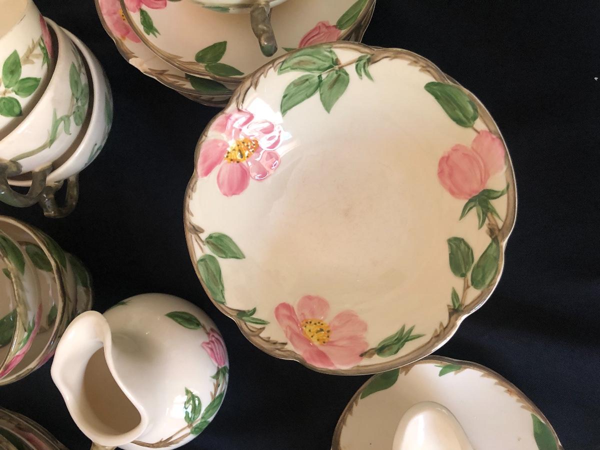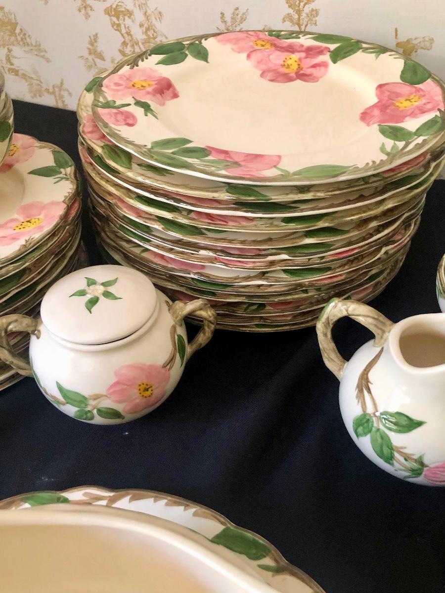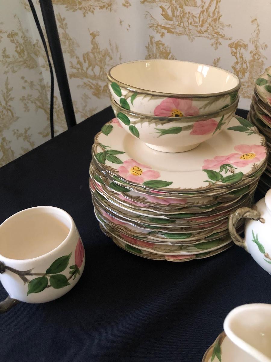 Includes 13 dinner plates 11 salad plates 4 Soup bowls, gravy dish, six tea cups cream and sugar set, six dessert bowls. And two additional pieces. Condition is vintage used some small chips here and there