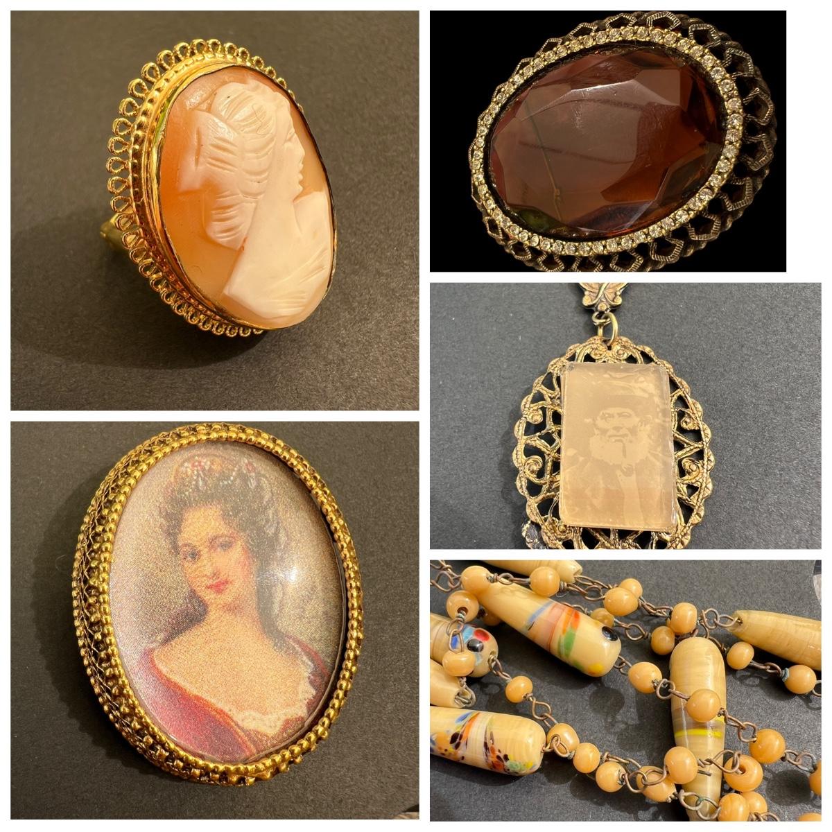 Vendome faux cameo ring with adjustable band. Florenza Victorian style brooch pendant. Buying "as is - as found" in this wonderful estate. See ALL PHOTOS for content, condition, & dimensions. NEVER a Buyer's Premium or Credit Card Fee added.