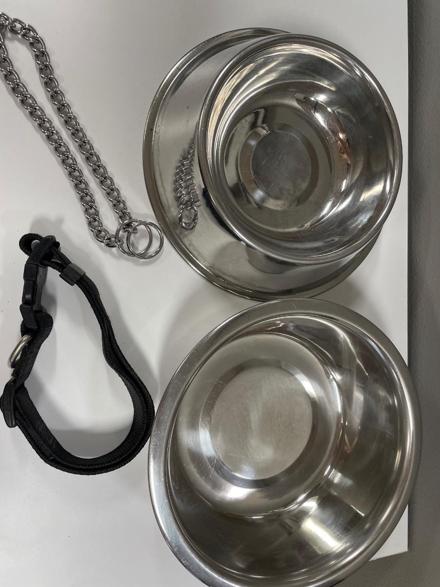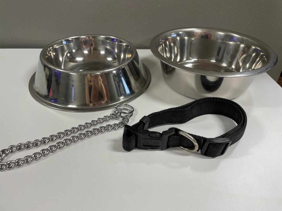 2 dog bowls and 2 collars