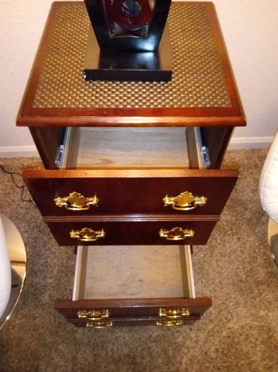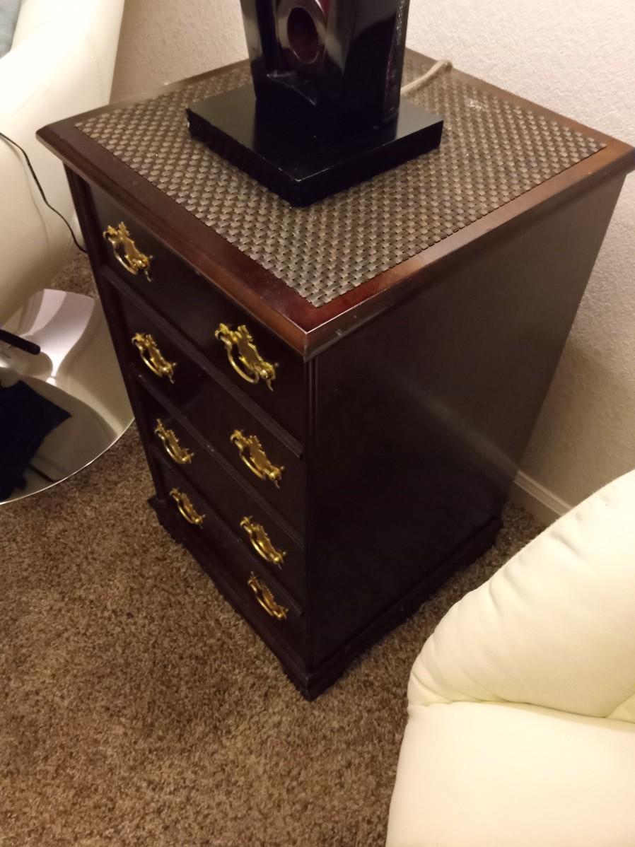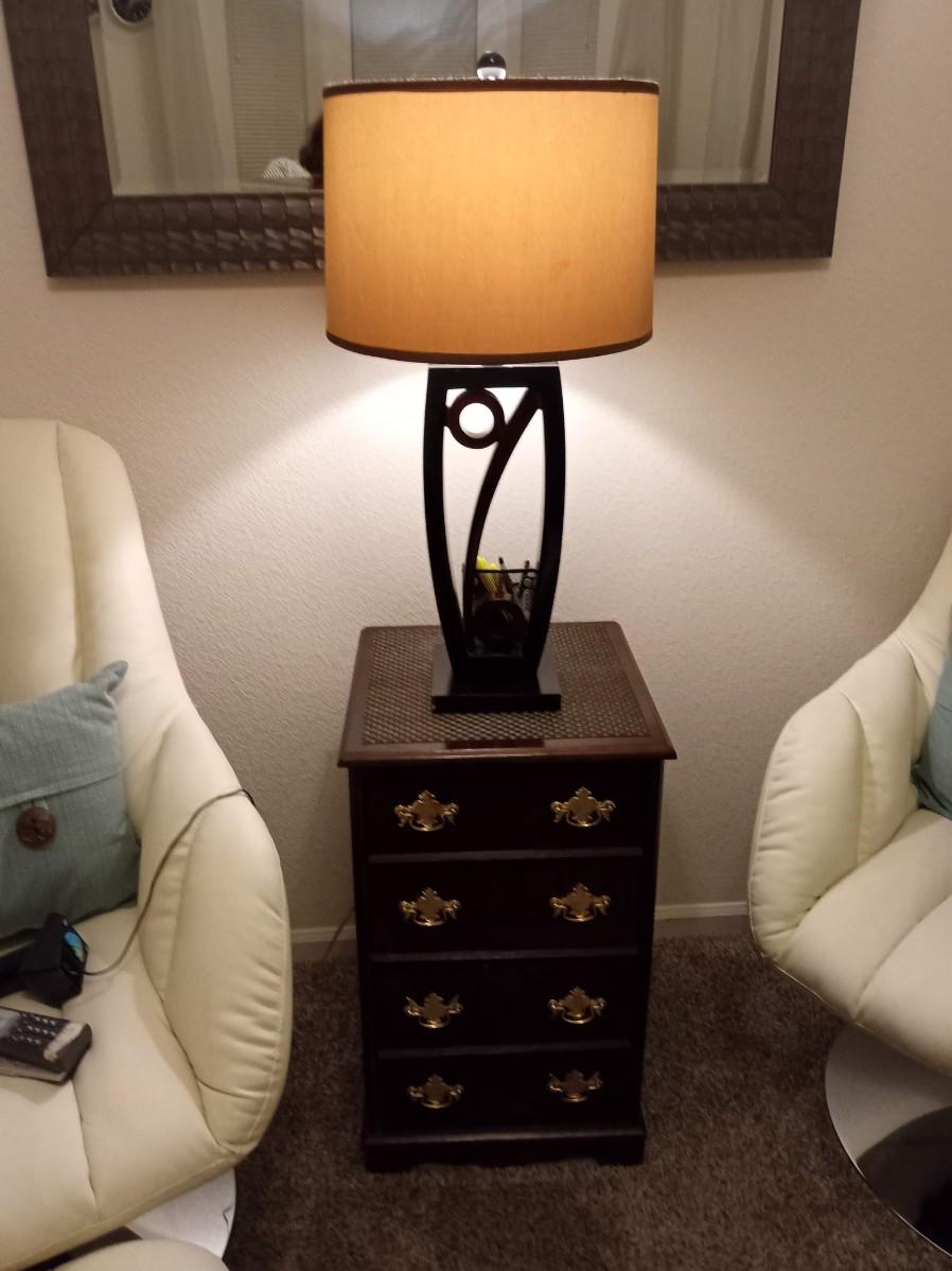 THE TOP OF THE CABINET HAS SOME WEAR, IT HAS A PAD THAT COVERS IT. IT MEASURES 16" SQUARE AND 27" TALL. THE LAMP IS 27" TALL