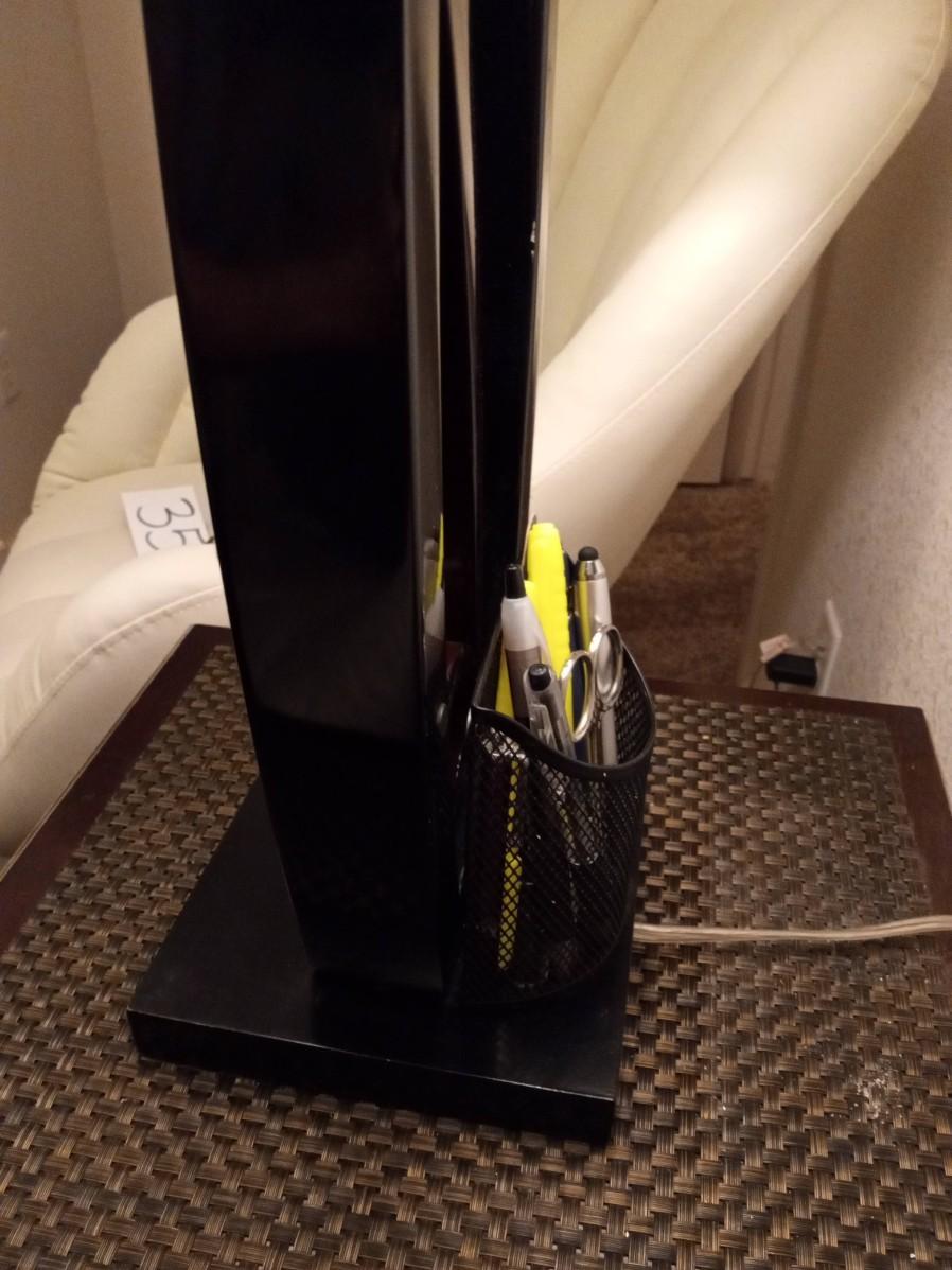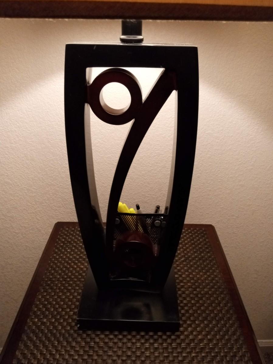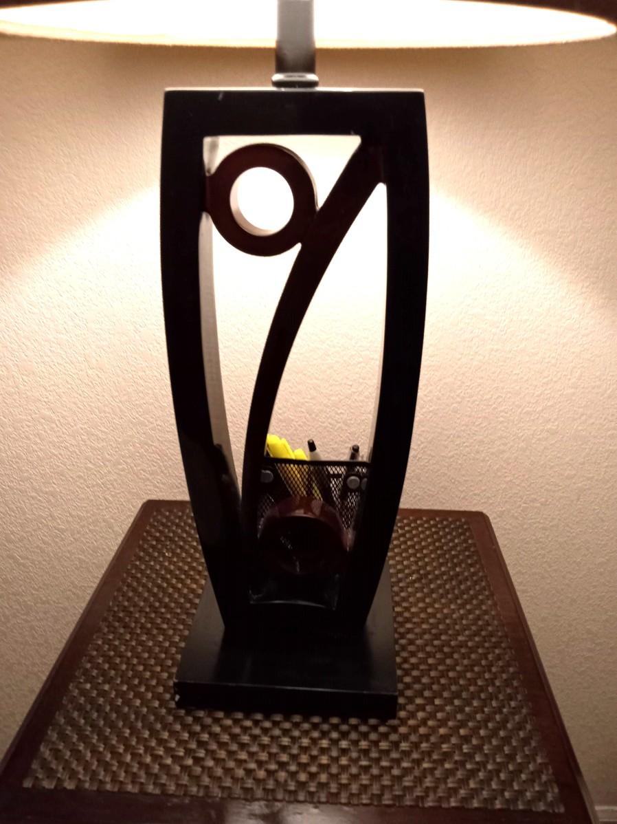 THE TOP OF THE CABINET HAS SOME WEAR, IT HAS A PAD THAT COVERS IT. IT MEASURES 16" SQUARE AND 27" TALL. THE LAMP IS 27" TALL