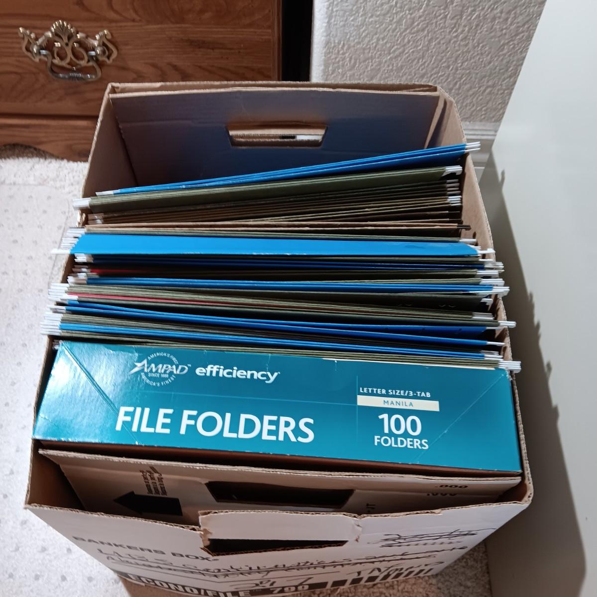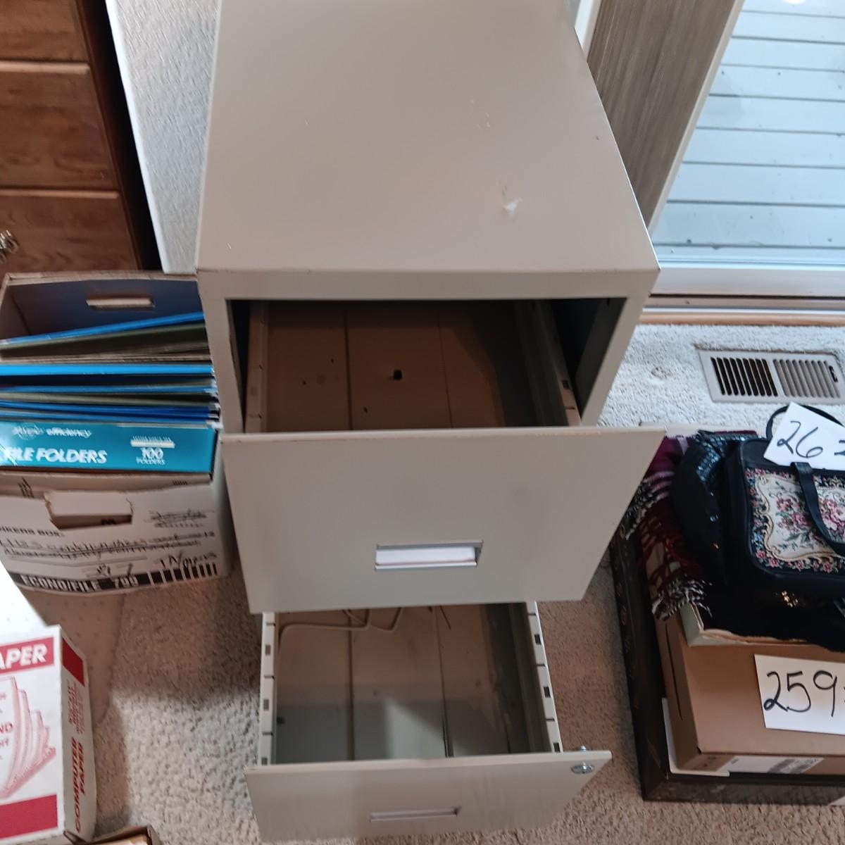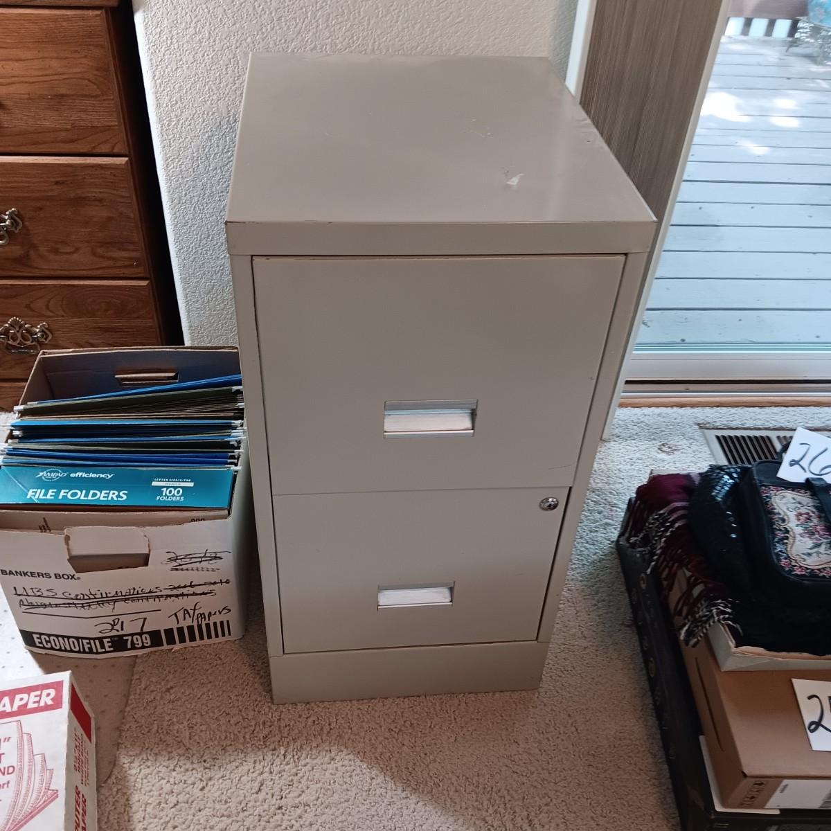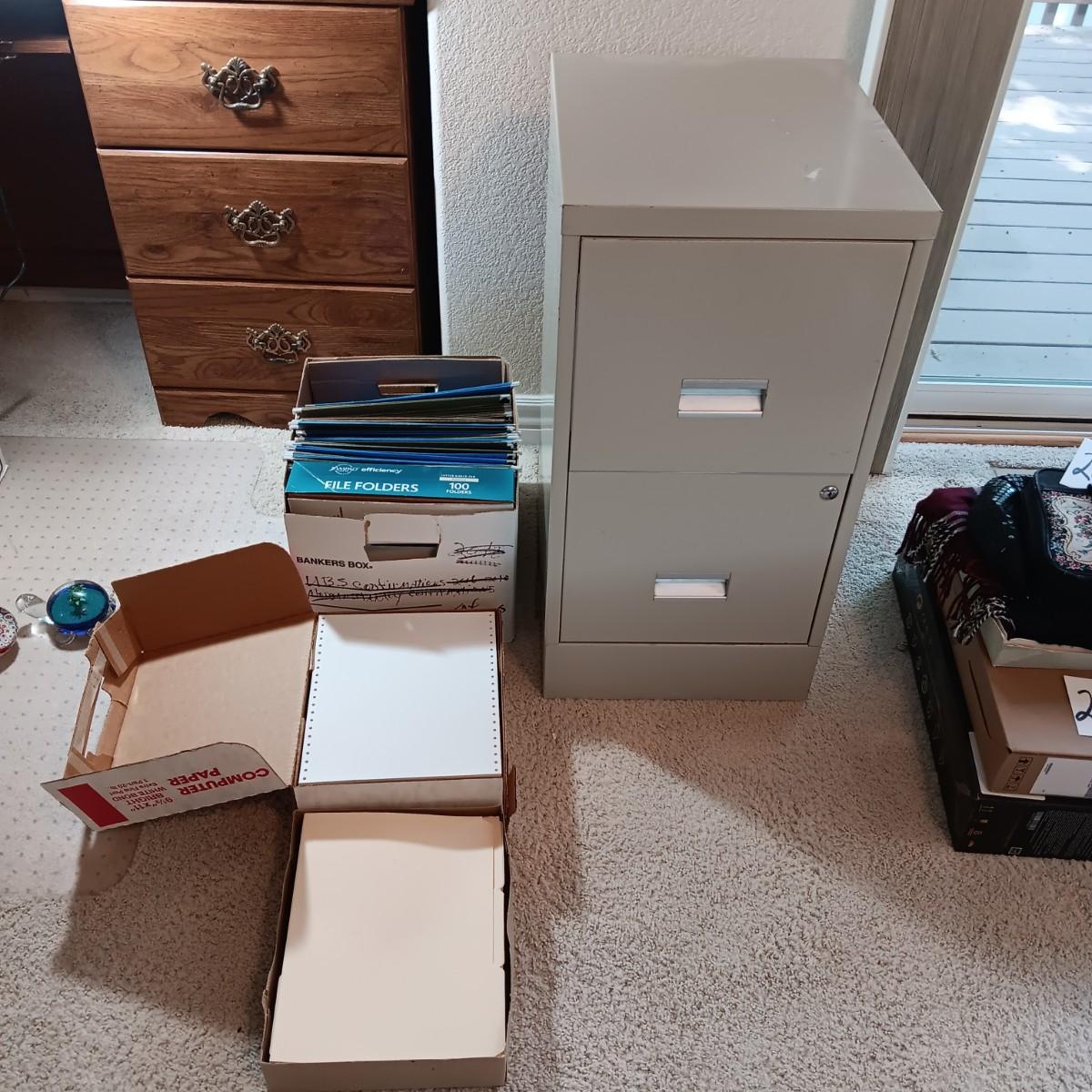 2 DRAWER FILING CABINET, HANGING FOLDERS AND FILE FOLDERS PLUS A FULL BOX OF COMPUTER PAPER