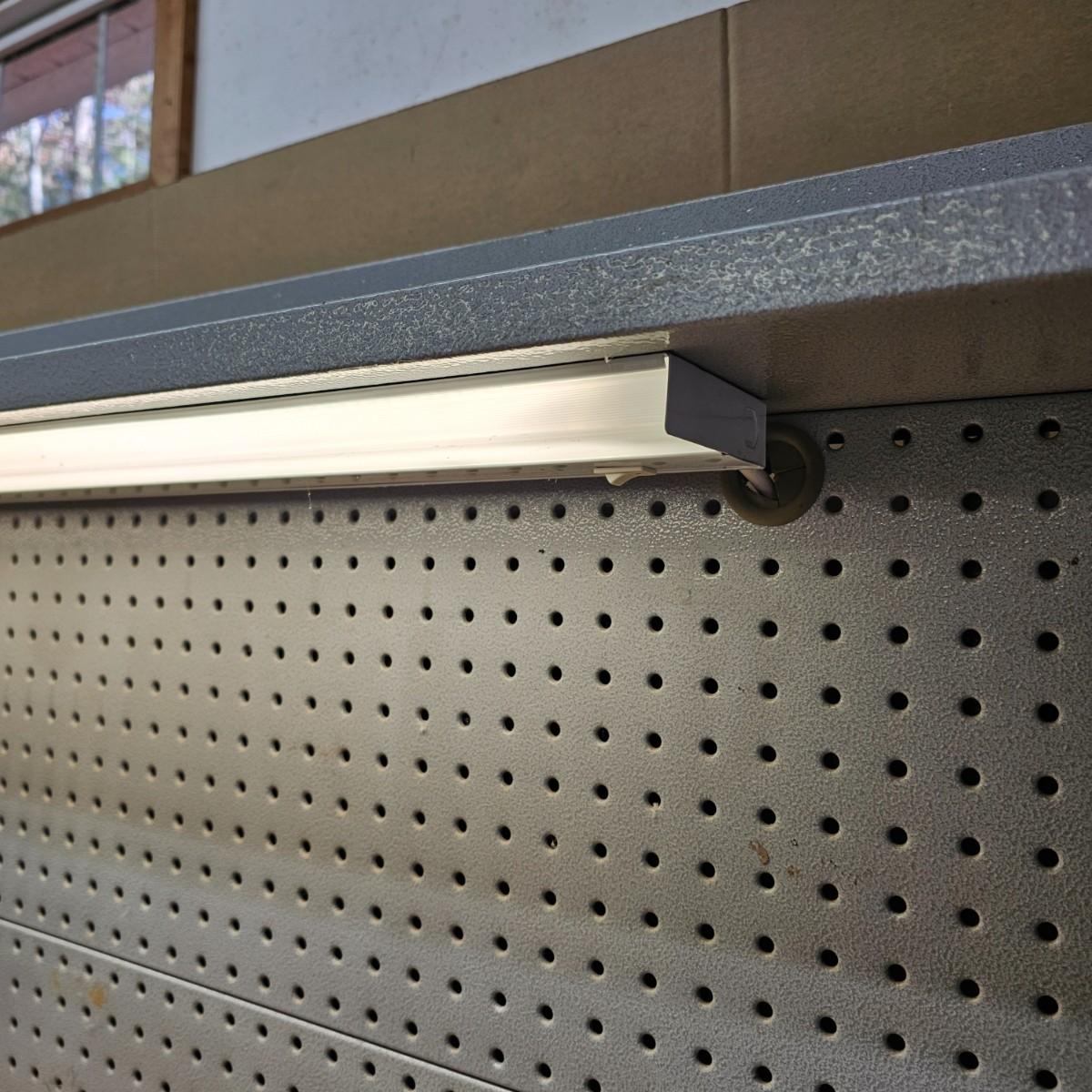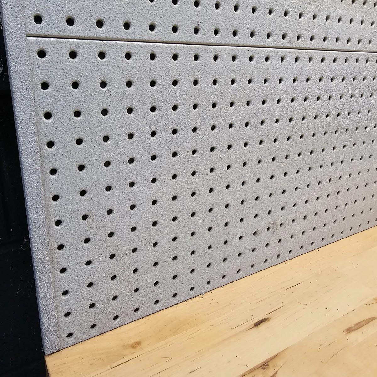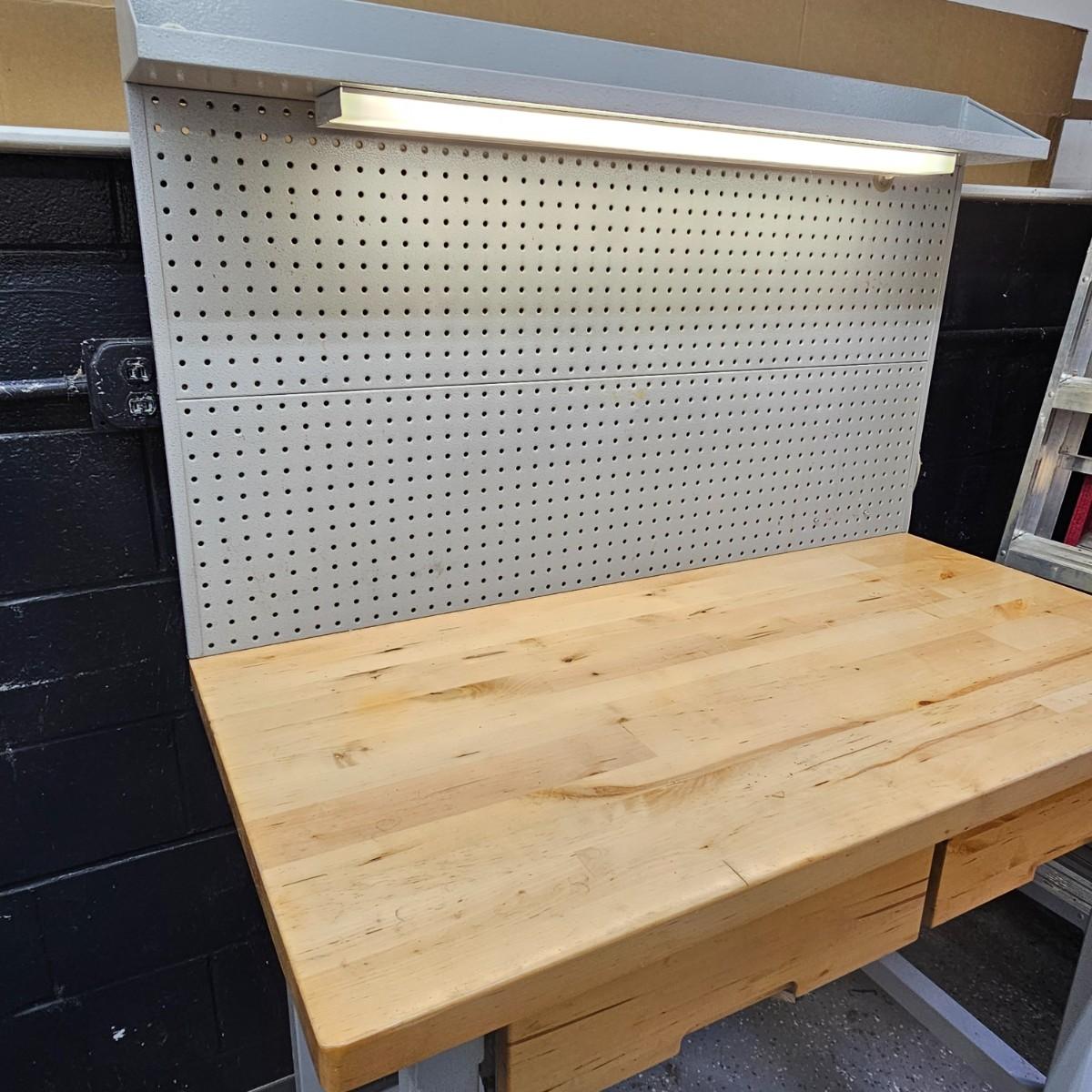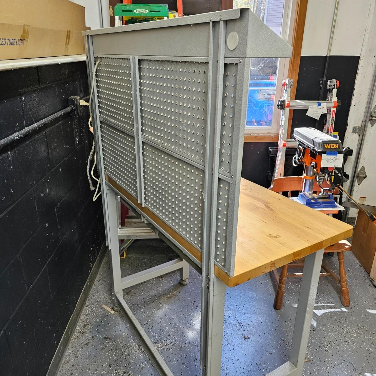 Metal base, stand and back with wood top, this lighted workbench will fit in many places. Pegboard style back is all metal with short shelf on top, light under shelf. Two pull out drawers in front. Unit measures 48" x 24" x 66"H, can be separated to transport. Pegboard piece comes off with six hex head bolts. See photos for details. Local pickup only. Winning bidder must bring assistance to help move and load this item due to its weight and/or size.
