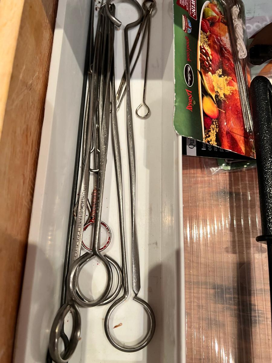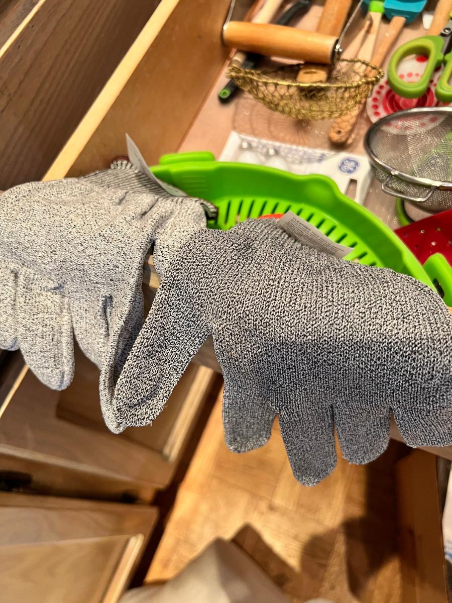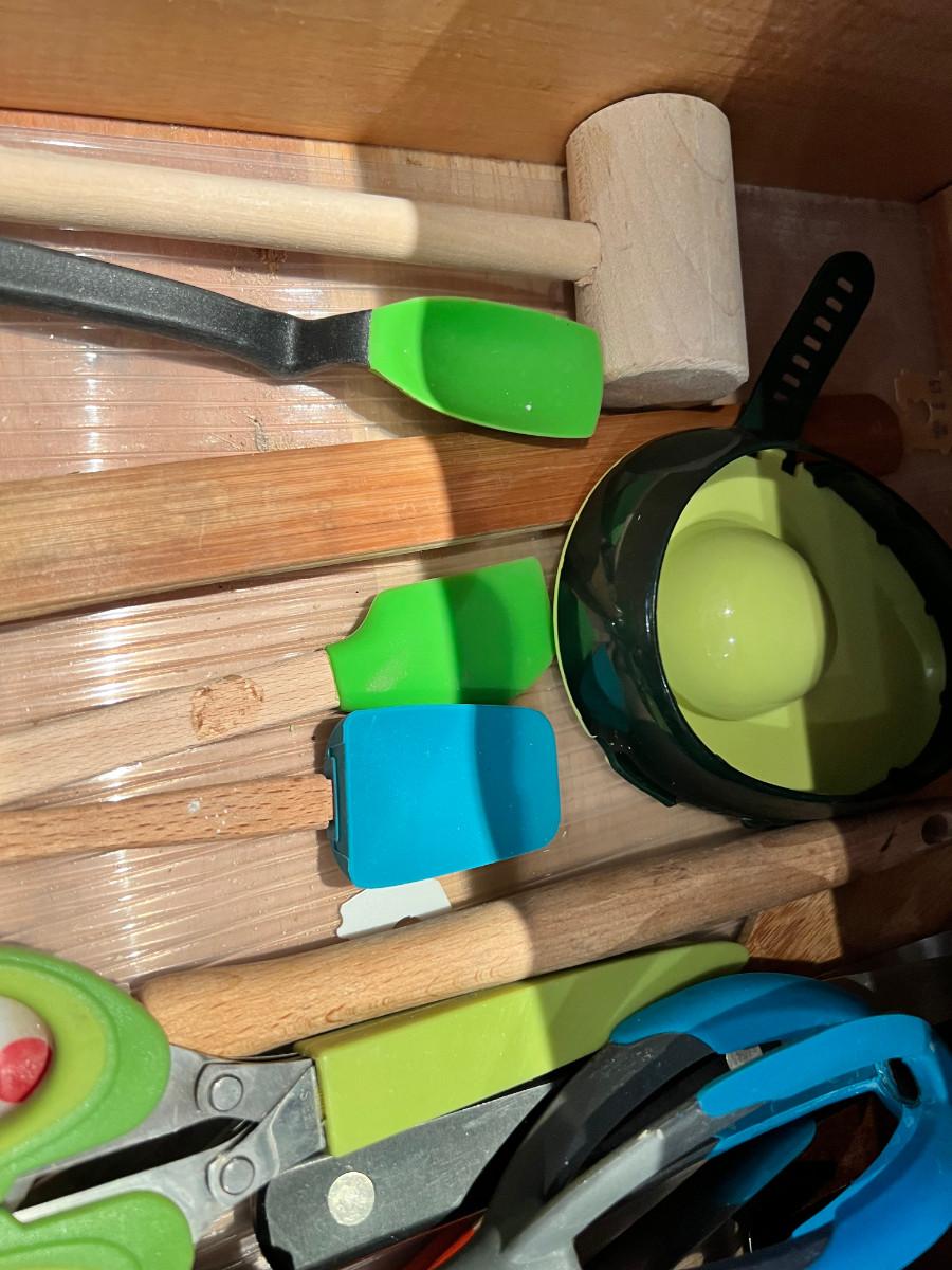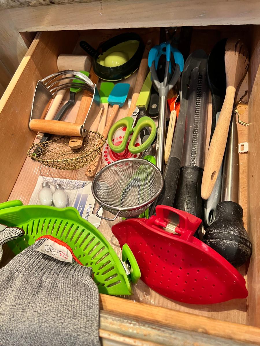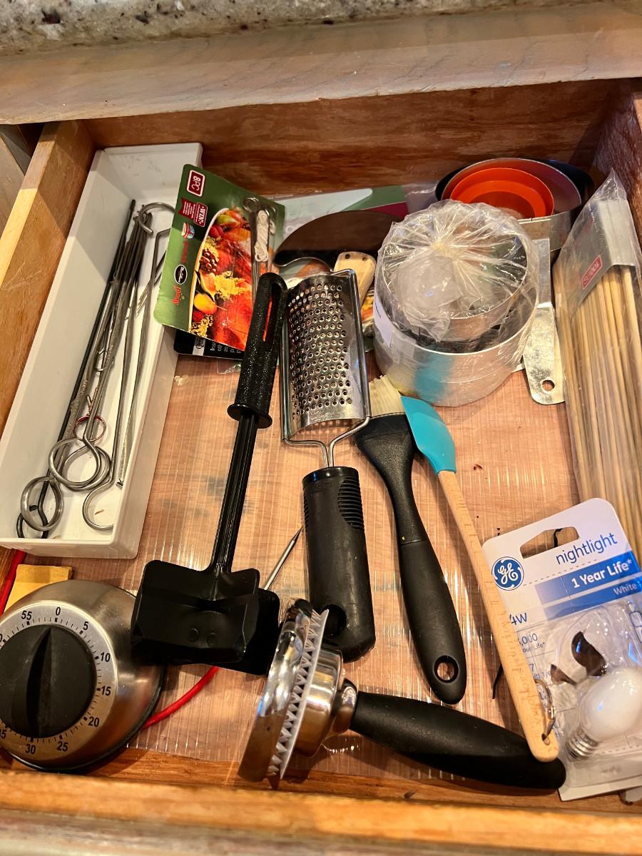 Contents of both drawers, including cut proof gloves, scissors , avocado keep , wok hot oil tool., Timer,