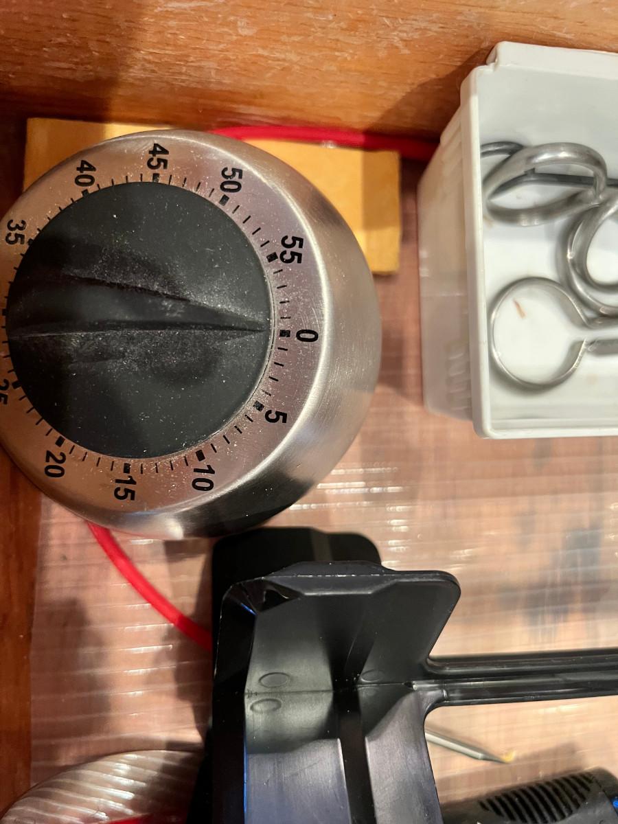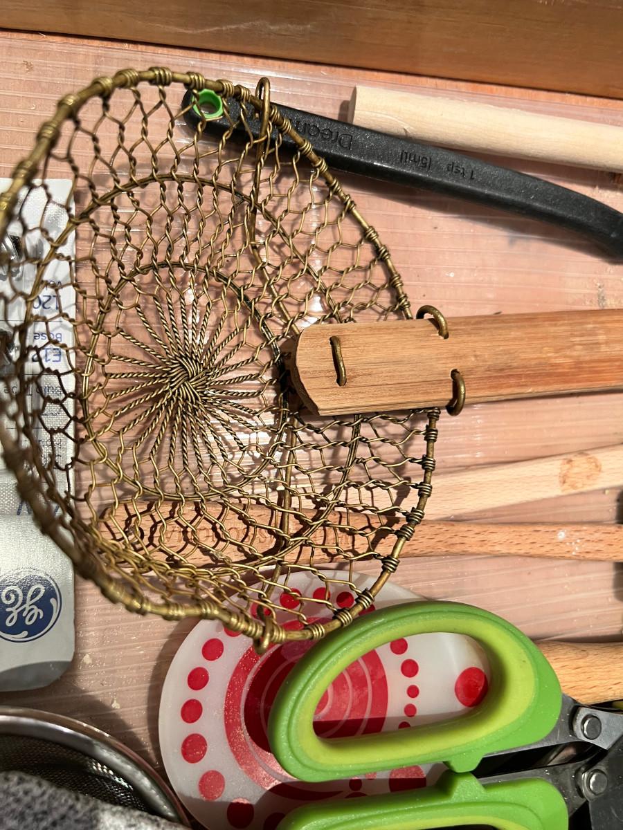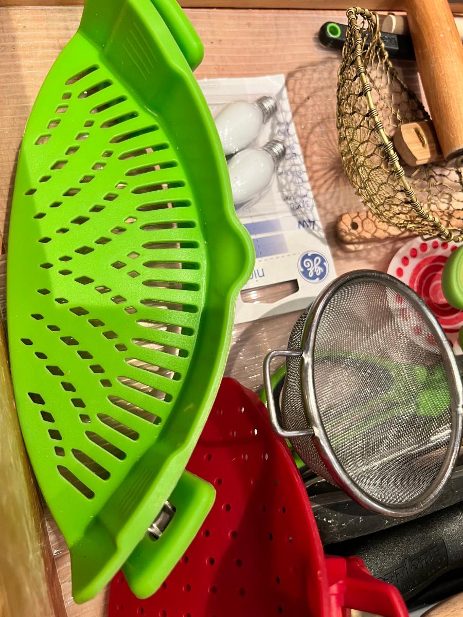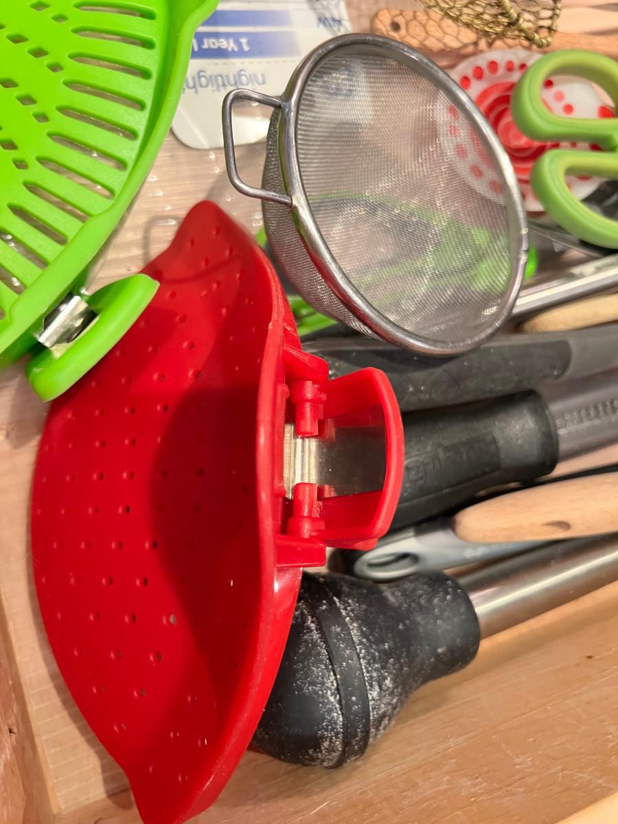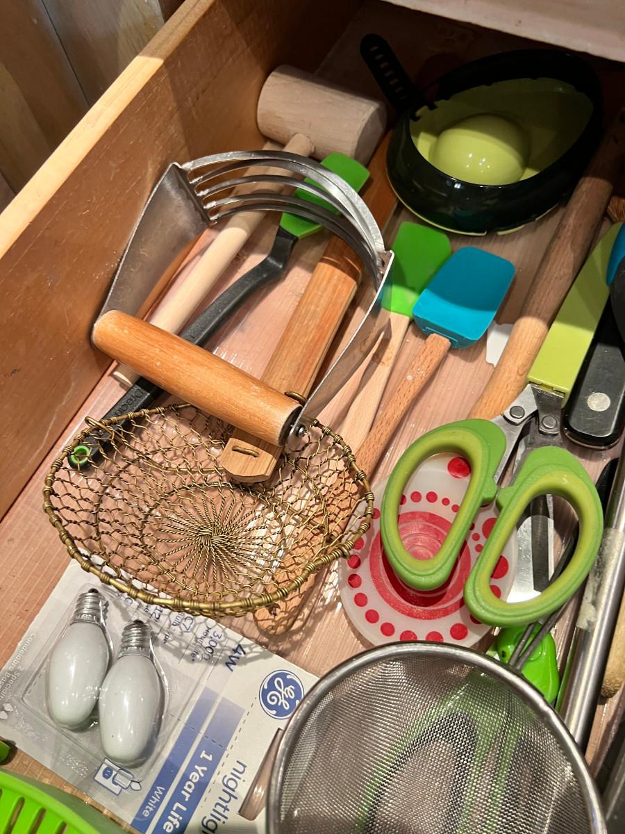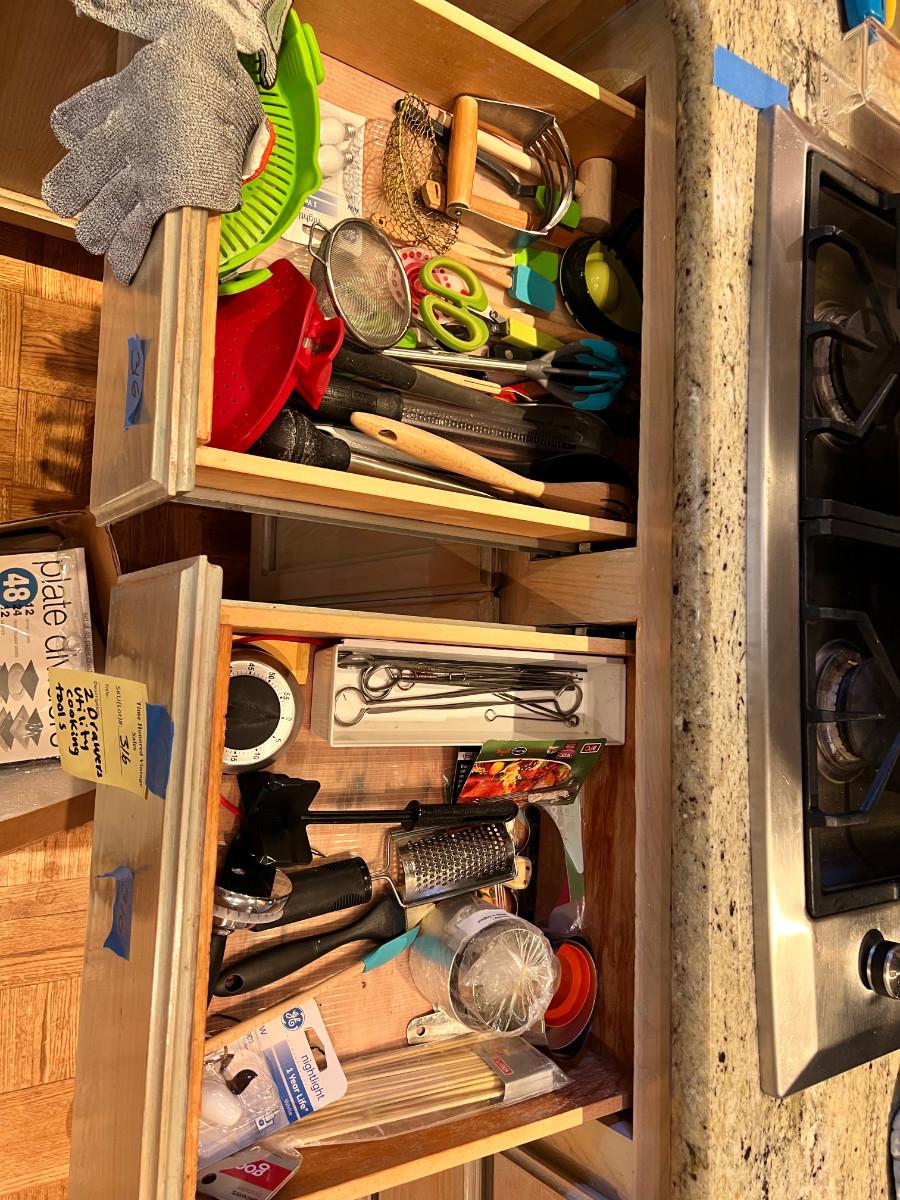 Contents of both drawers, including cut proof gloves, scissors , avocado keep , wok hot oil tool., Timer,