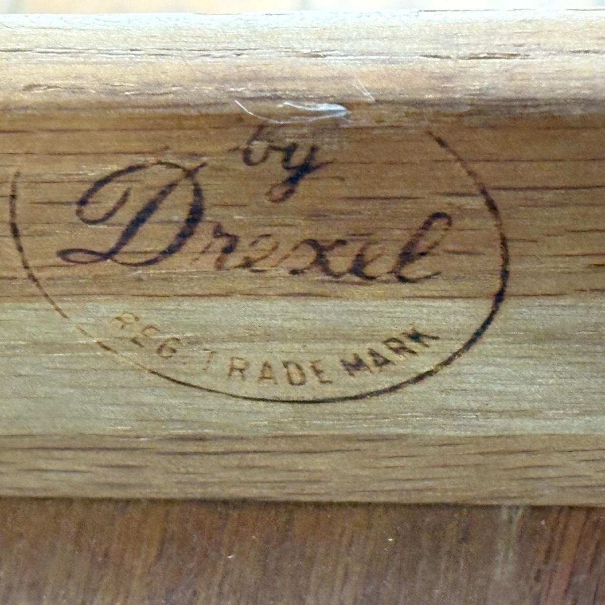 These 2 solid wood Drexel side tables measure approximately 20" x 26" x 22"H. They have dovetail drawers. Tables each have several blemishes, as shown in pictures.