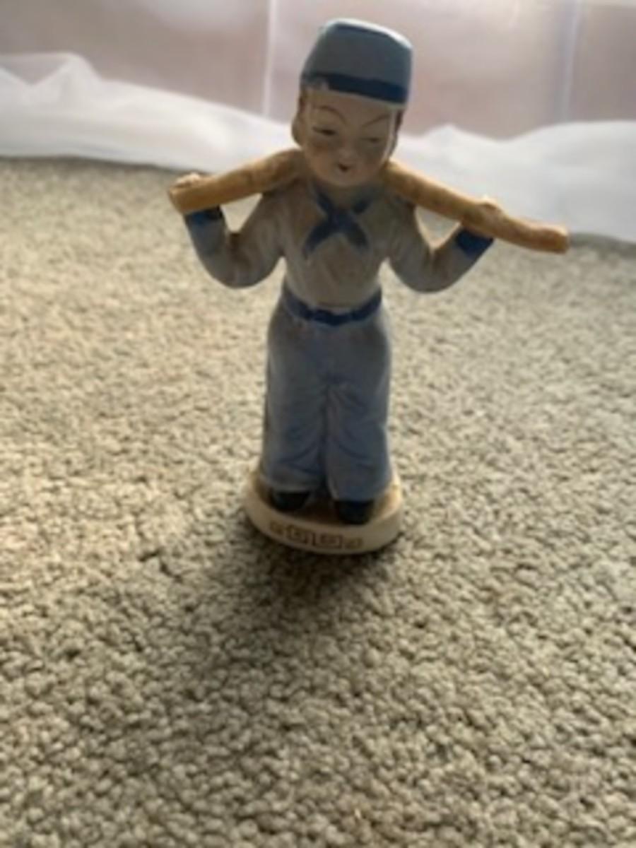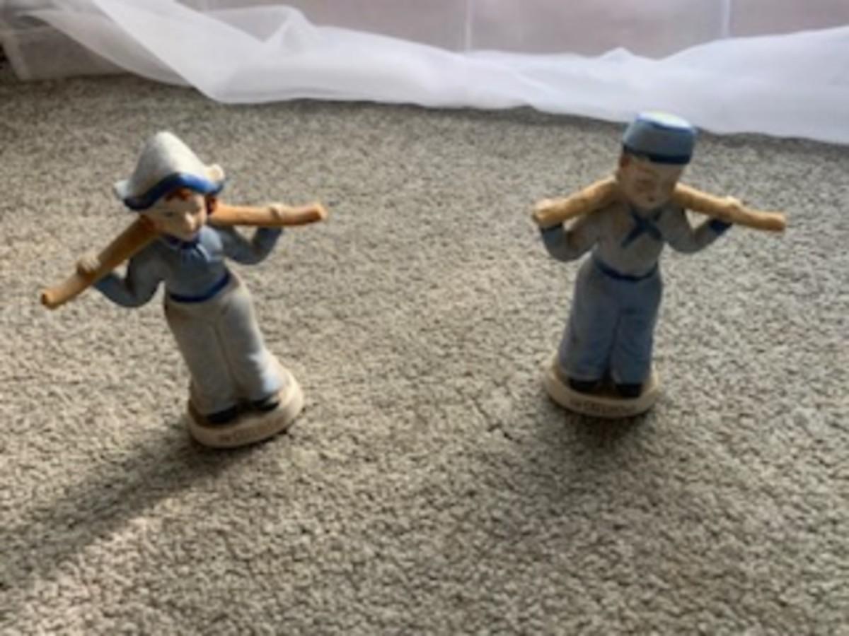 Hand-painted in classic blue and white tones two figures dressed in folk attire and carrying water buckets suspended from shoulder yokes.