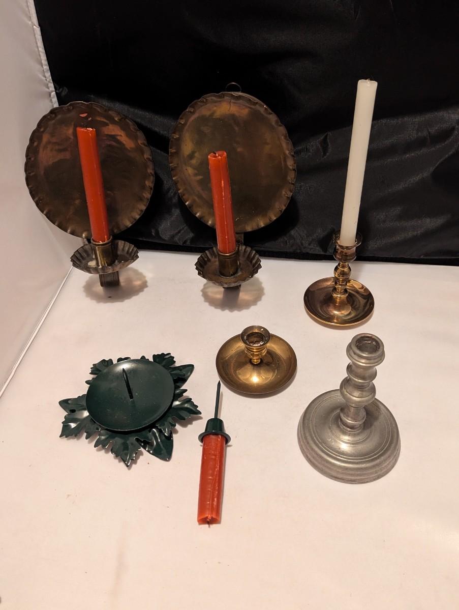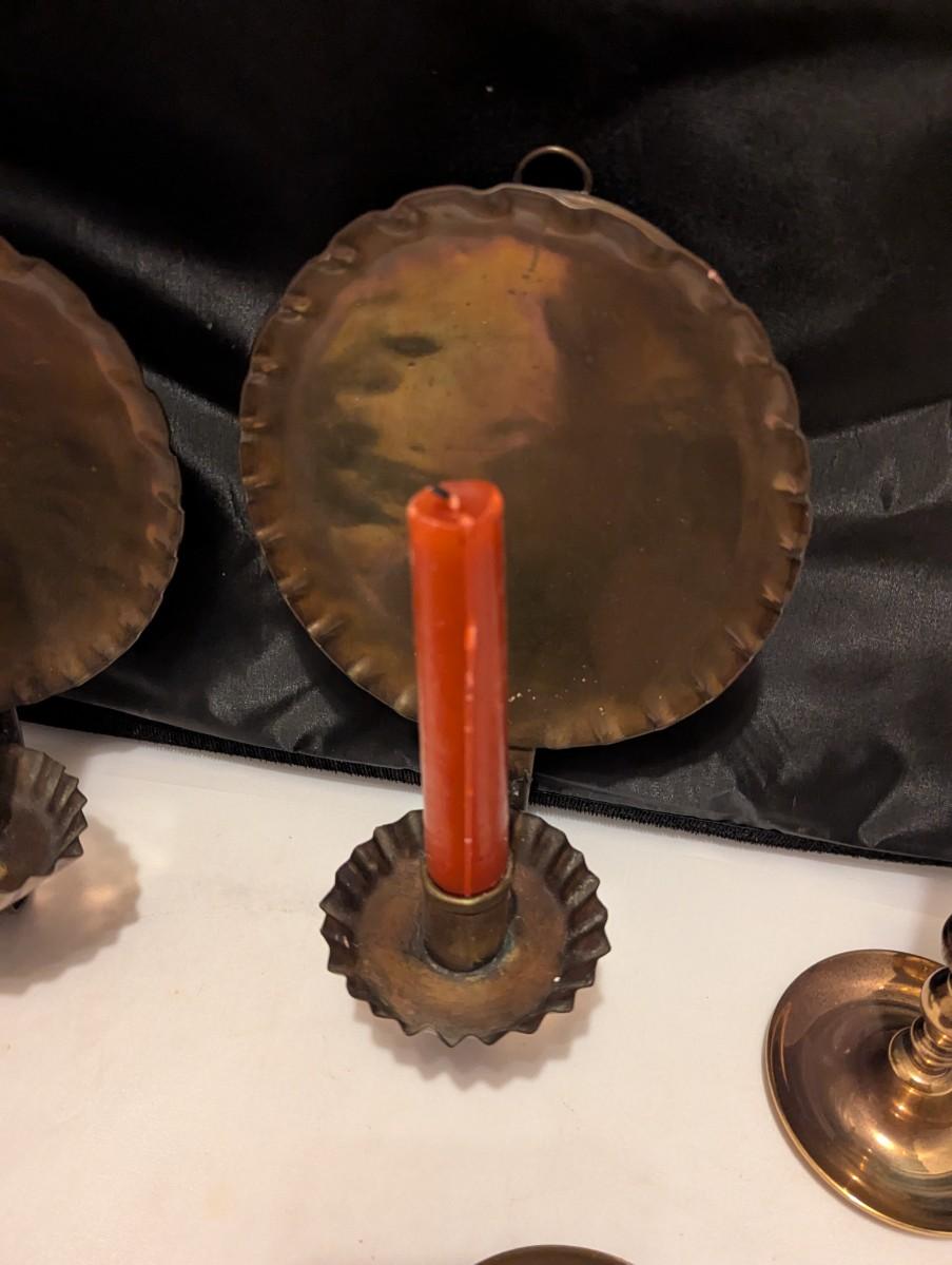 2 Early American Primitive Metal Tin Wall Sconces Farmhouse Candle Holders & Pewter & Brass (B)