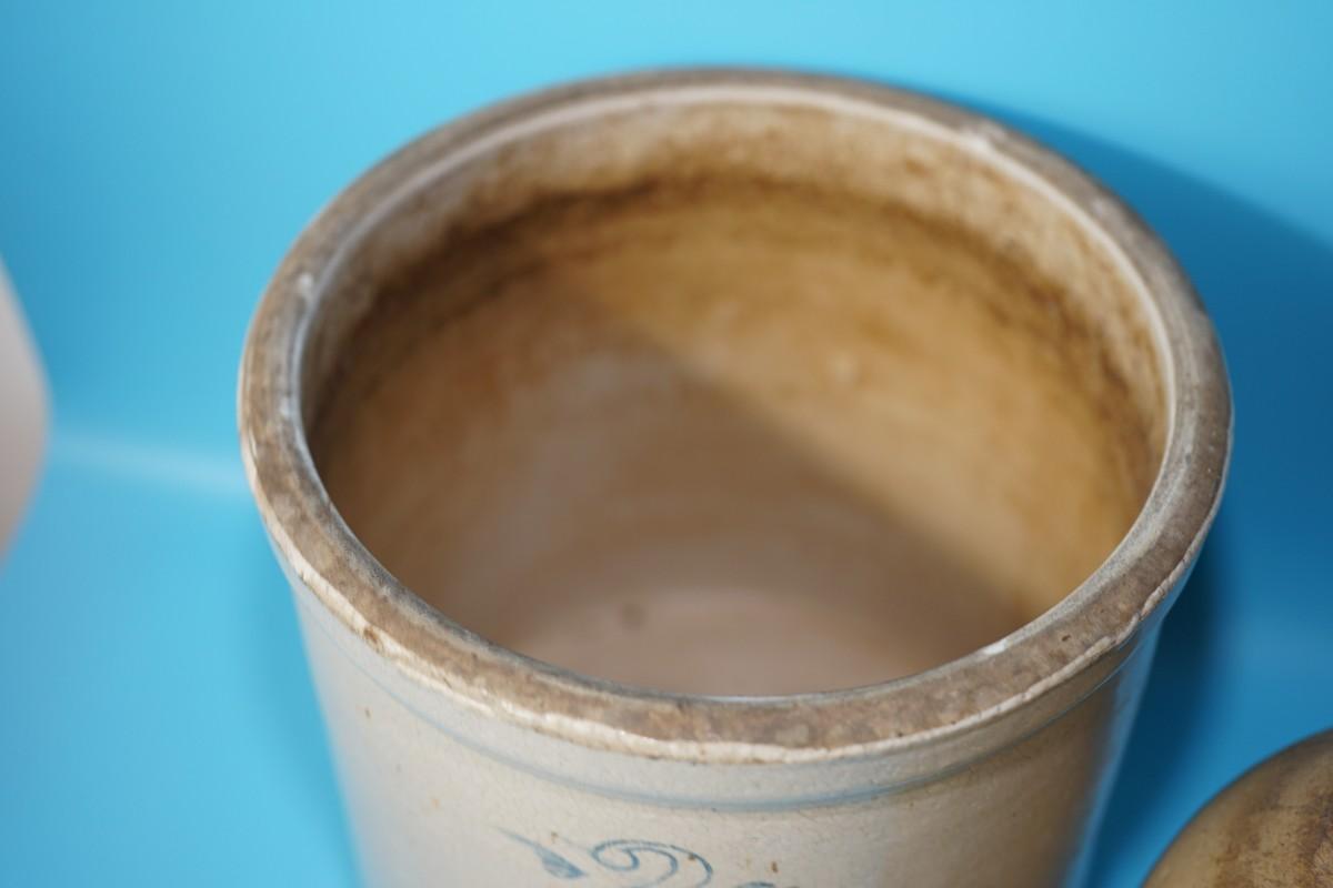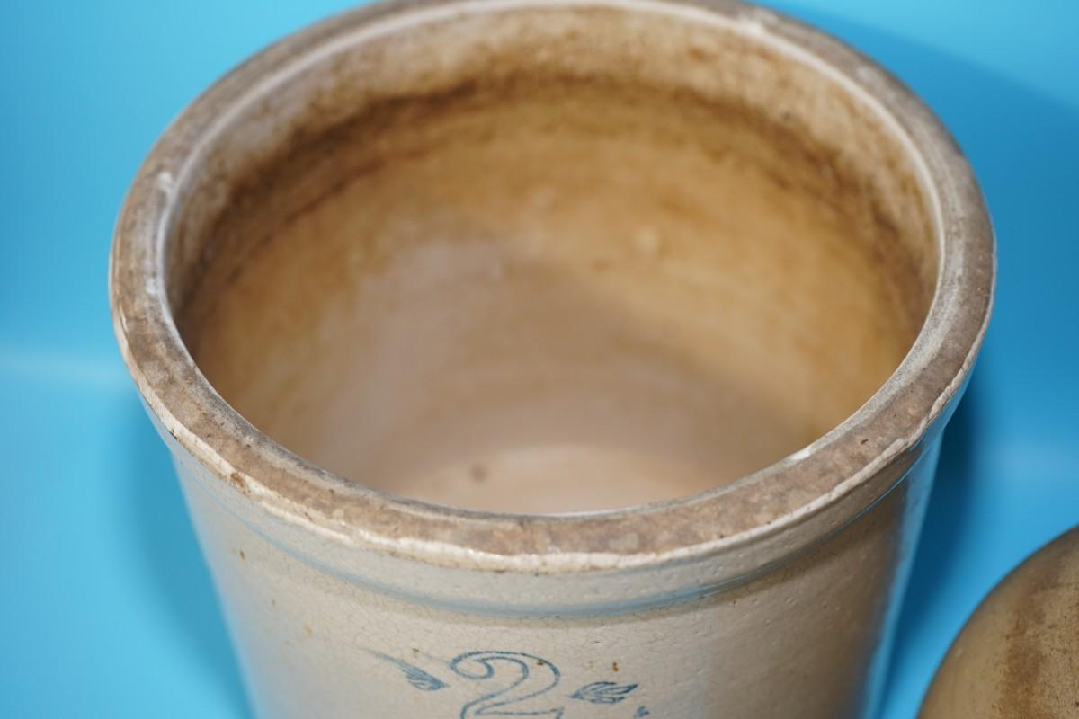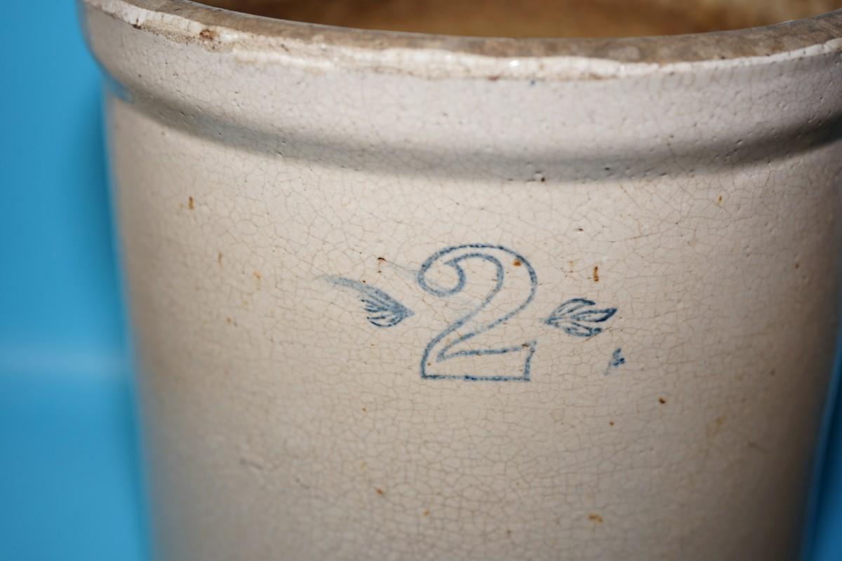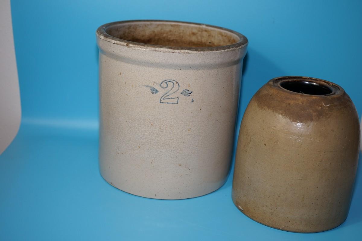 The #2 crock , maker unknown is about 10" the canning crock with staining and soiling at the top measures: 9 1/2" and 8 1/2"