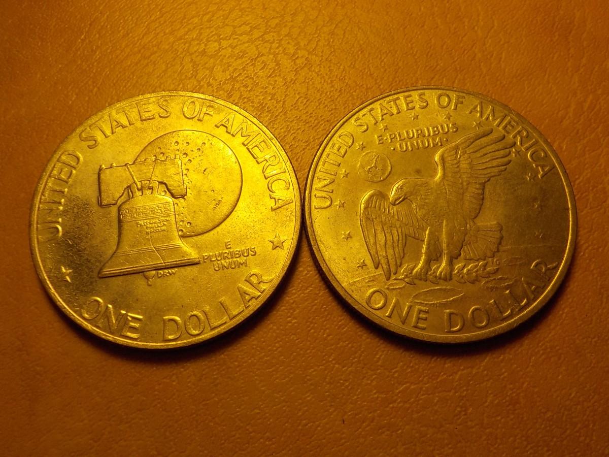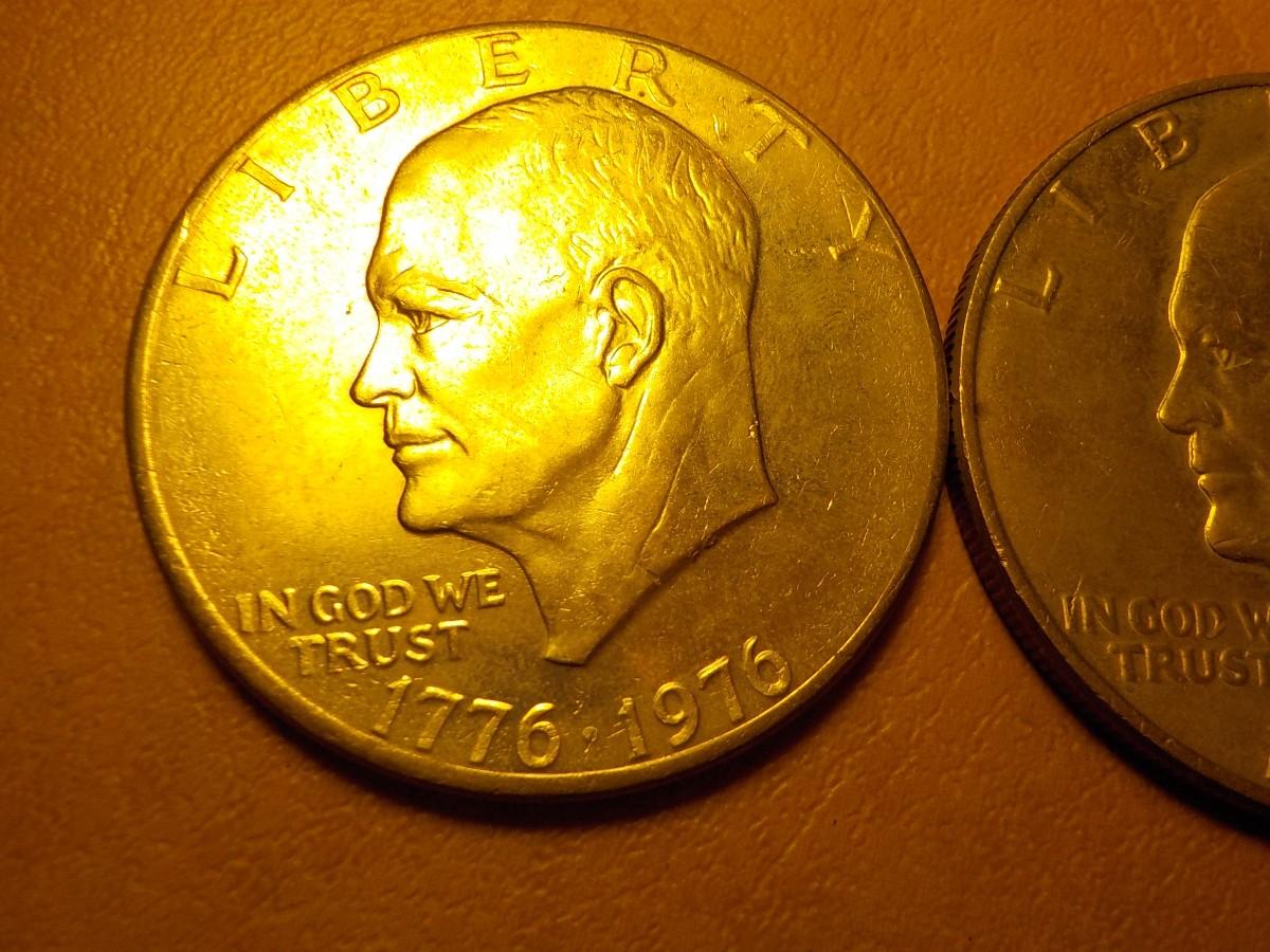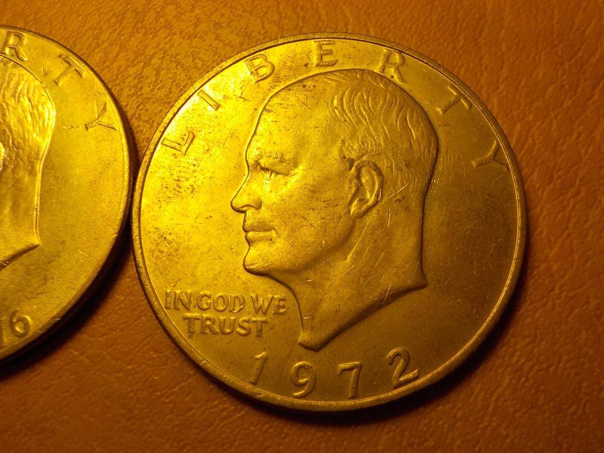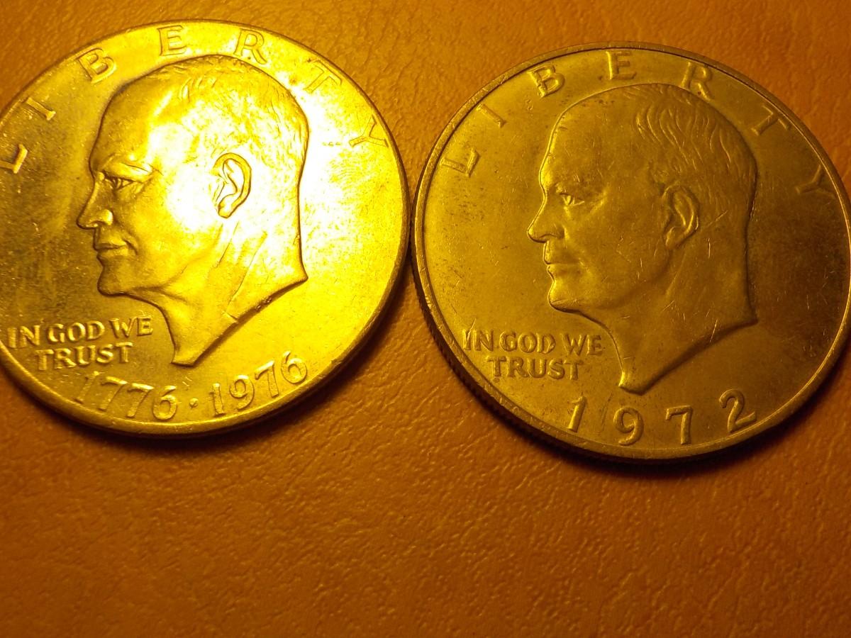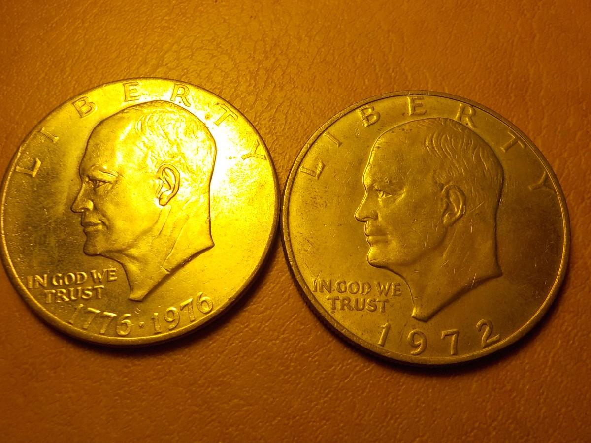 2- Eisenhower dollar coins, Bi-Centennial and 1972