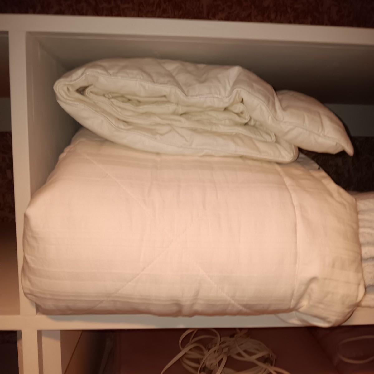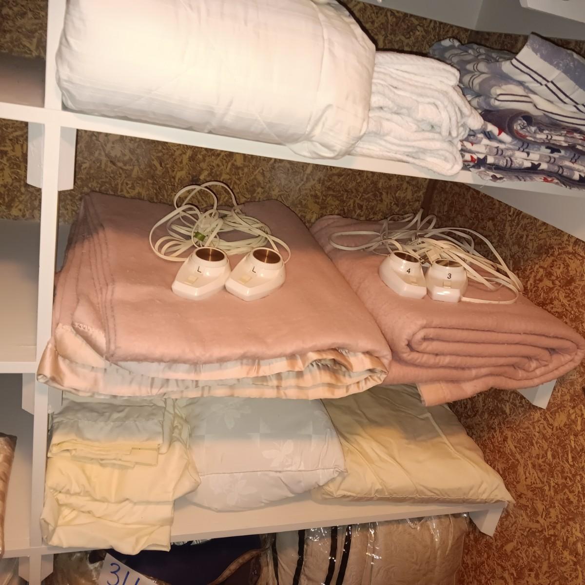 2 ELECTRIC BLANKETS, DOWN COMFORTER AND 2 PILLOWS, SHEETS AND WHITE BLANKET ALL QUEEN SIZE