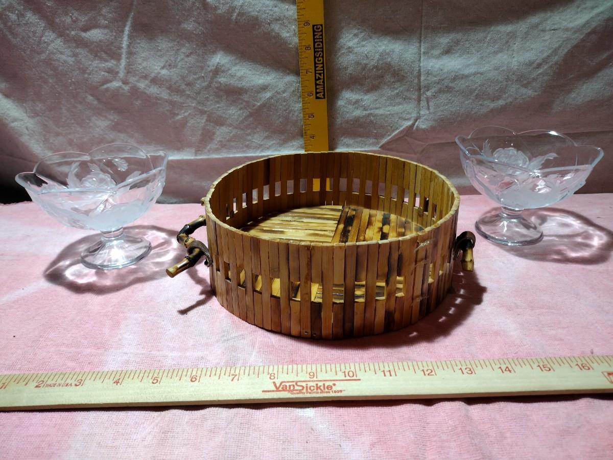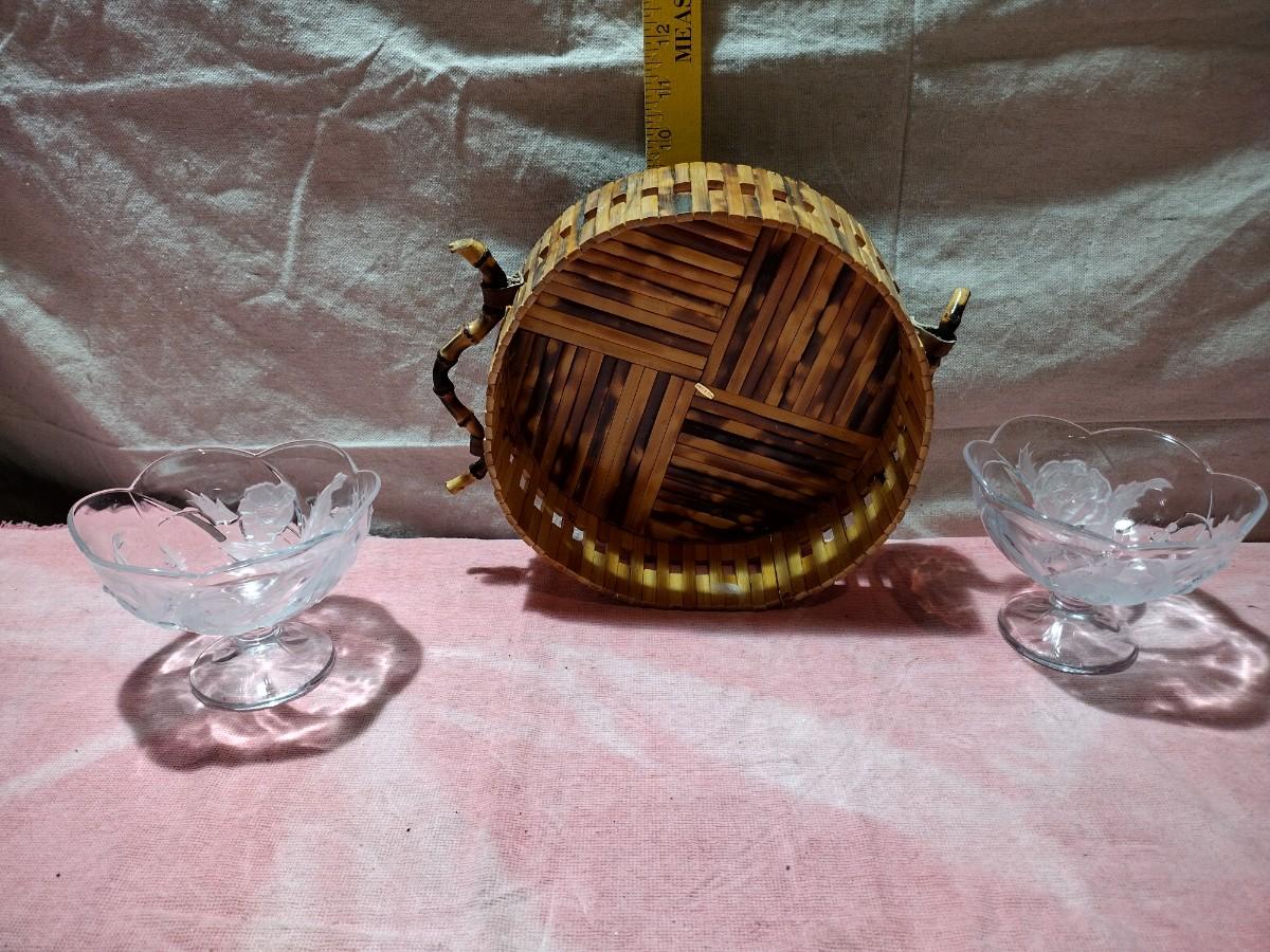 2 EMBOSSED COMPOTES AND A BAMBOO BASKET