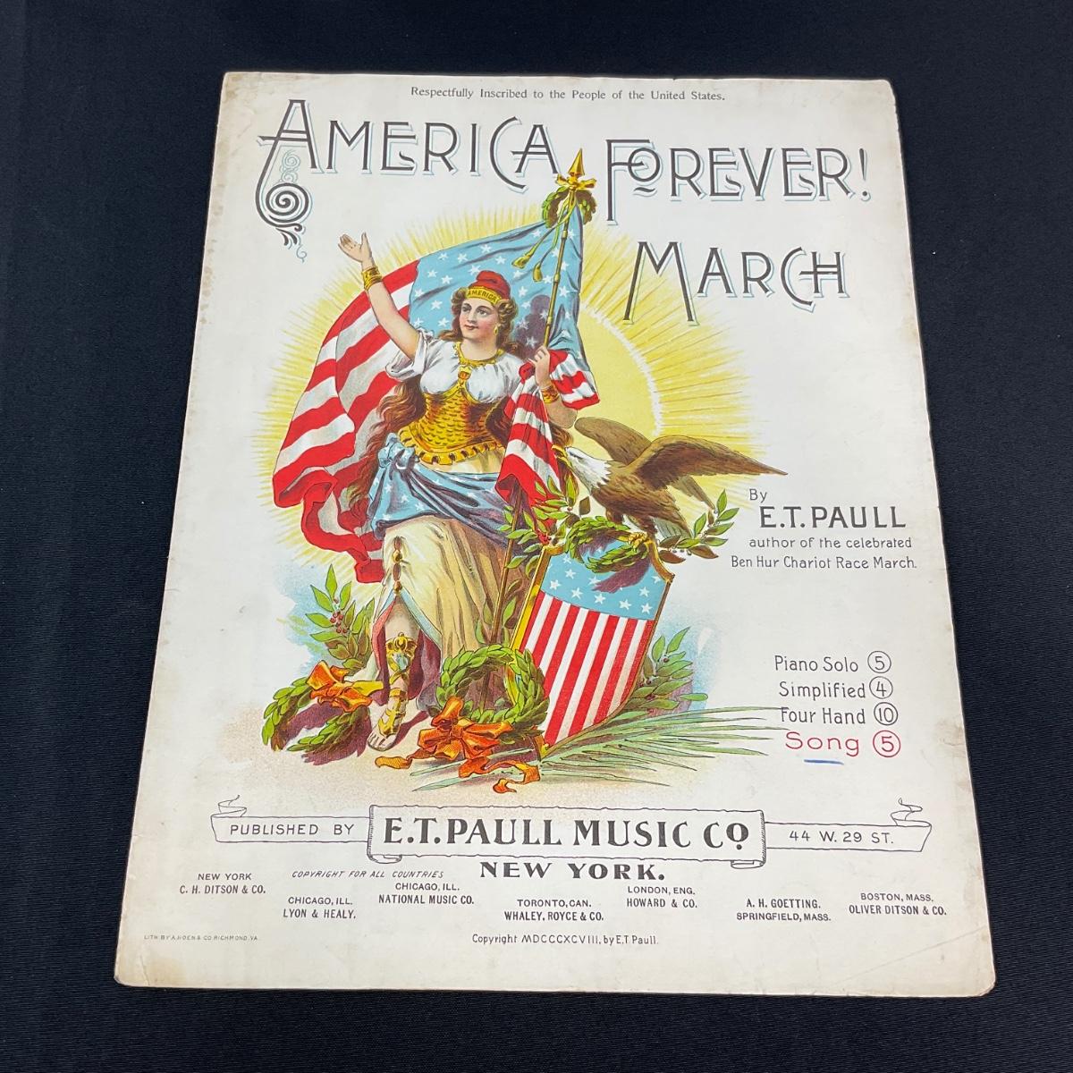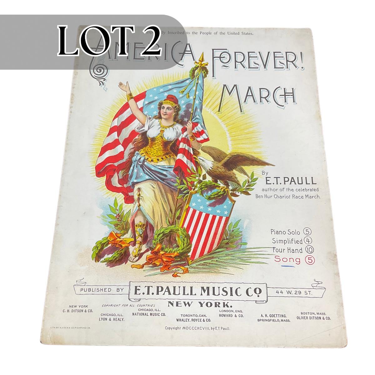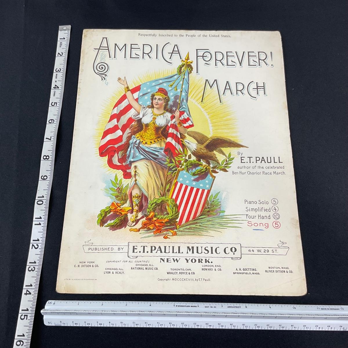 One vintage full color cover art E.T. Paul America Forever March By E.T. Paul. This piece does have some wear and tear but otherwise appears to be in good shape and complete. Please see photos for details and condition. Any condition statement is given as a courtesy to a client, is an opinion, and should not be treated as a statement of fact. Reference to condition written, oral or within a condition report shall not be regarded as a full account of condition and may not include all defects, alterations, or restorations. Absence of a condition report does not imply a lot is flawless or lacking imperfections or damage. Katherine’s Auction & Appraisal Service shall have no responsibility for any error or omission. Returns shall not be accepted on the basis of condition. ::: Shipping is available on this lot. If you require shipping you must let us know at the close of the auction. We will coordinate with you after the item has been won. Shipping fees will include insurance up to or exceeding the value of all items being mailed. If you have any questions regarding this lot please contact the auctioneer either via this website, by direct email or by phone. PICK UP TIMES and other important information can be found in the TERMS and DESCRIPTION of the auction. Please take a look for pertinent information. Thanks!
