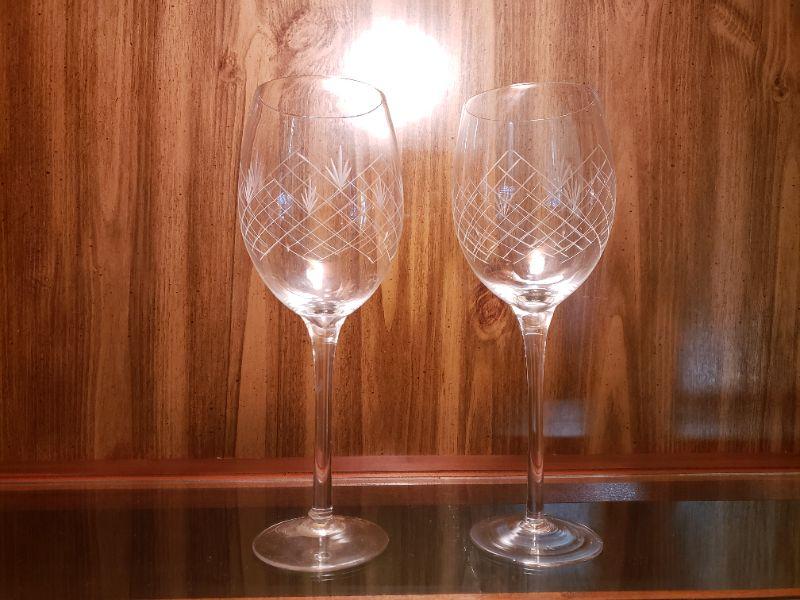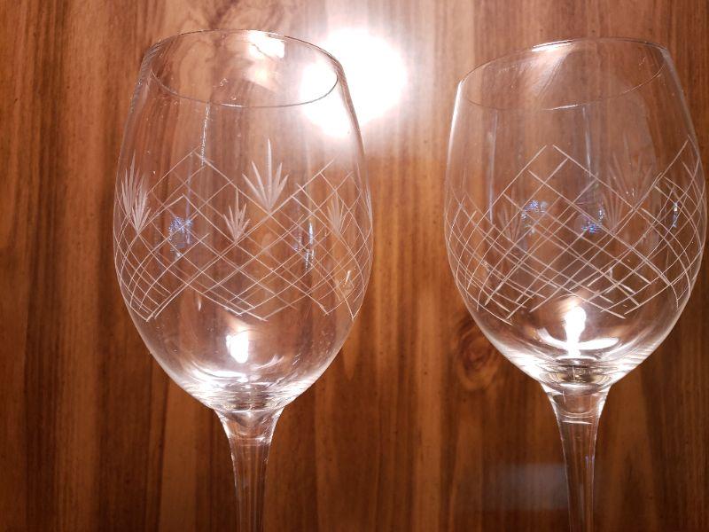 2 etched crystal long stem wine glasses