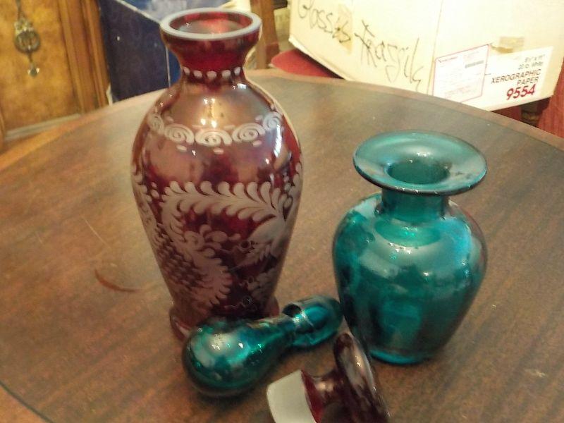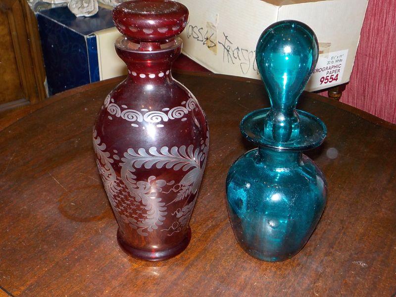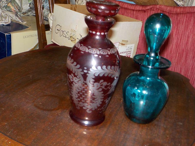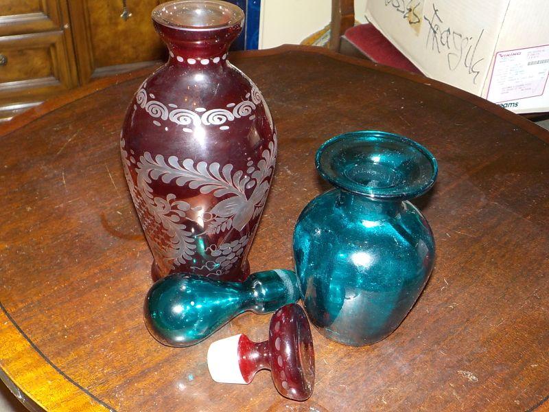 2- European vintage decanters / Etched glass ruby red/ cobalt blue.