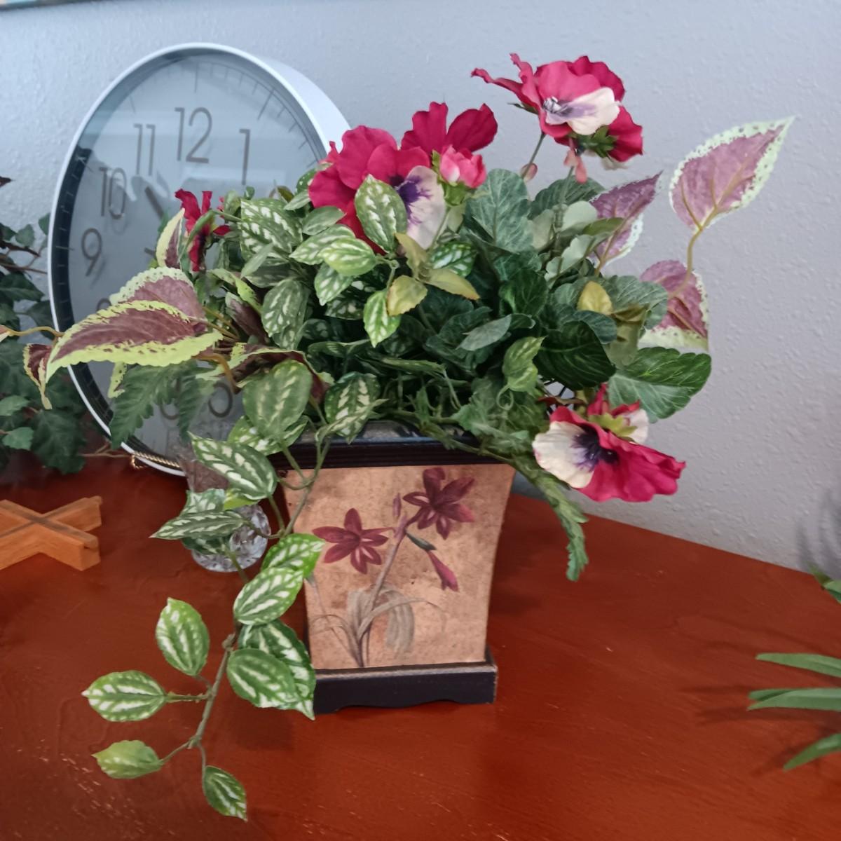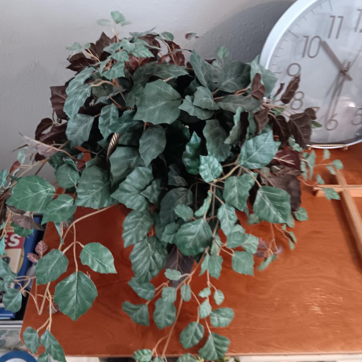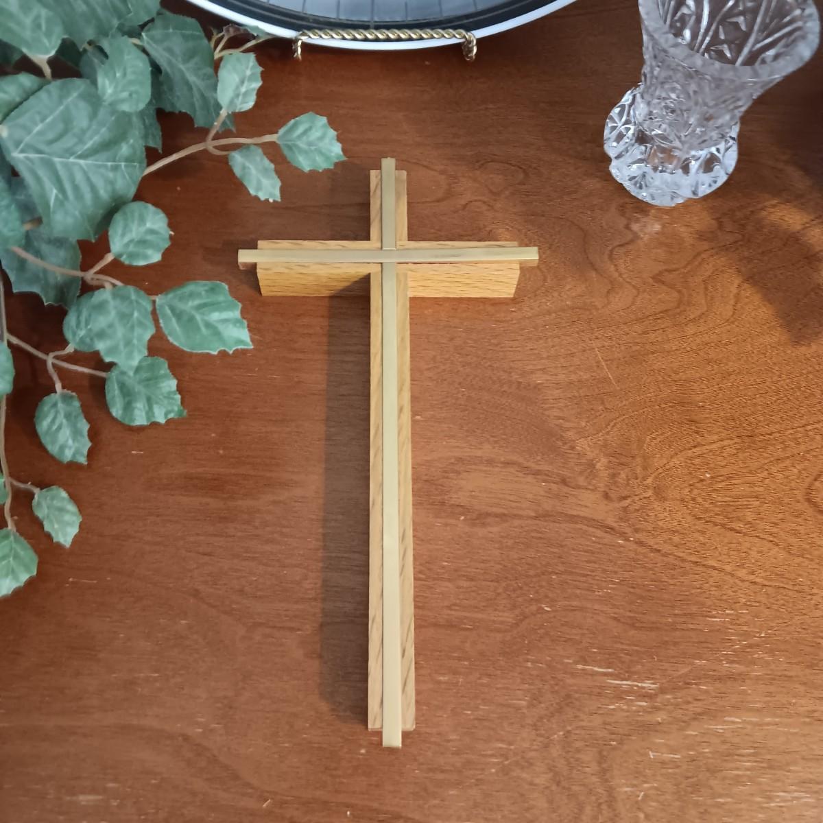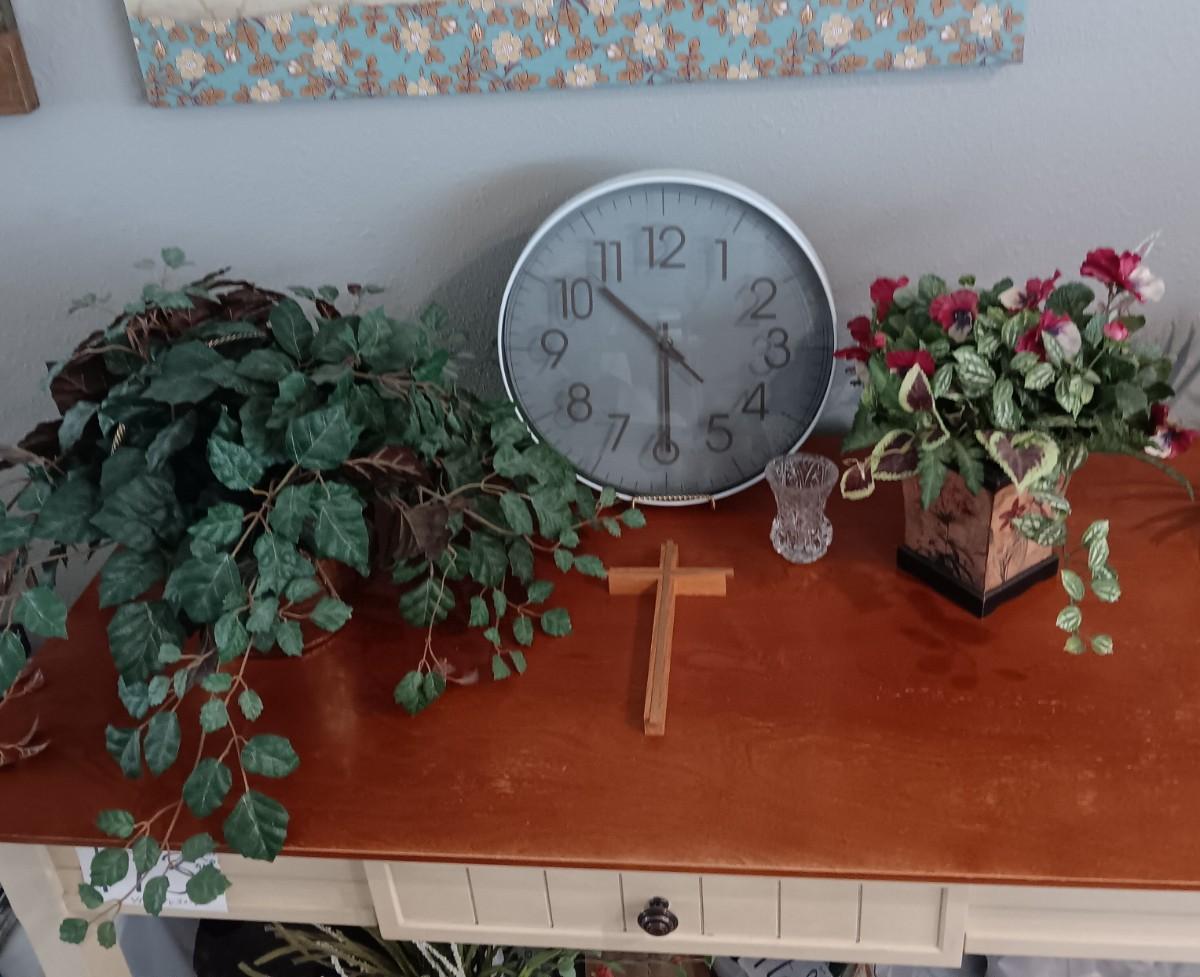 2 FAUX PLANTS IN BRASS AND TIN CONTAINERS, WALL CLOCK, CROSS AND TOOTHPICK HOLDER