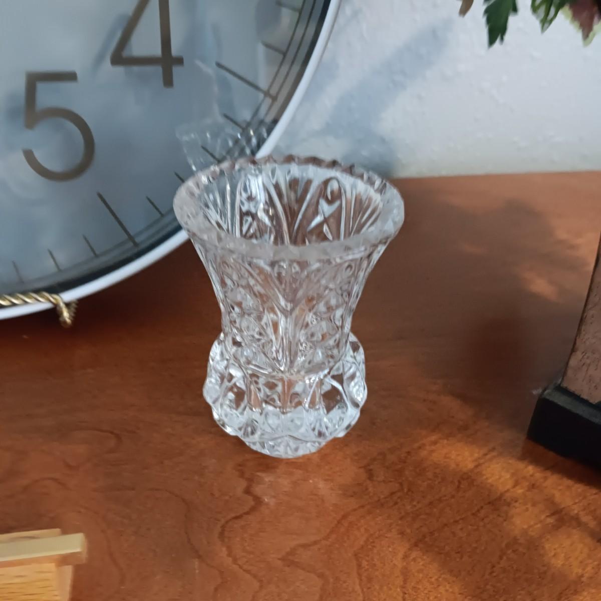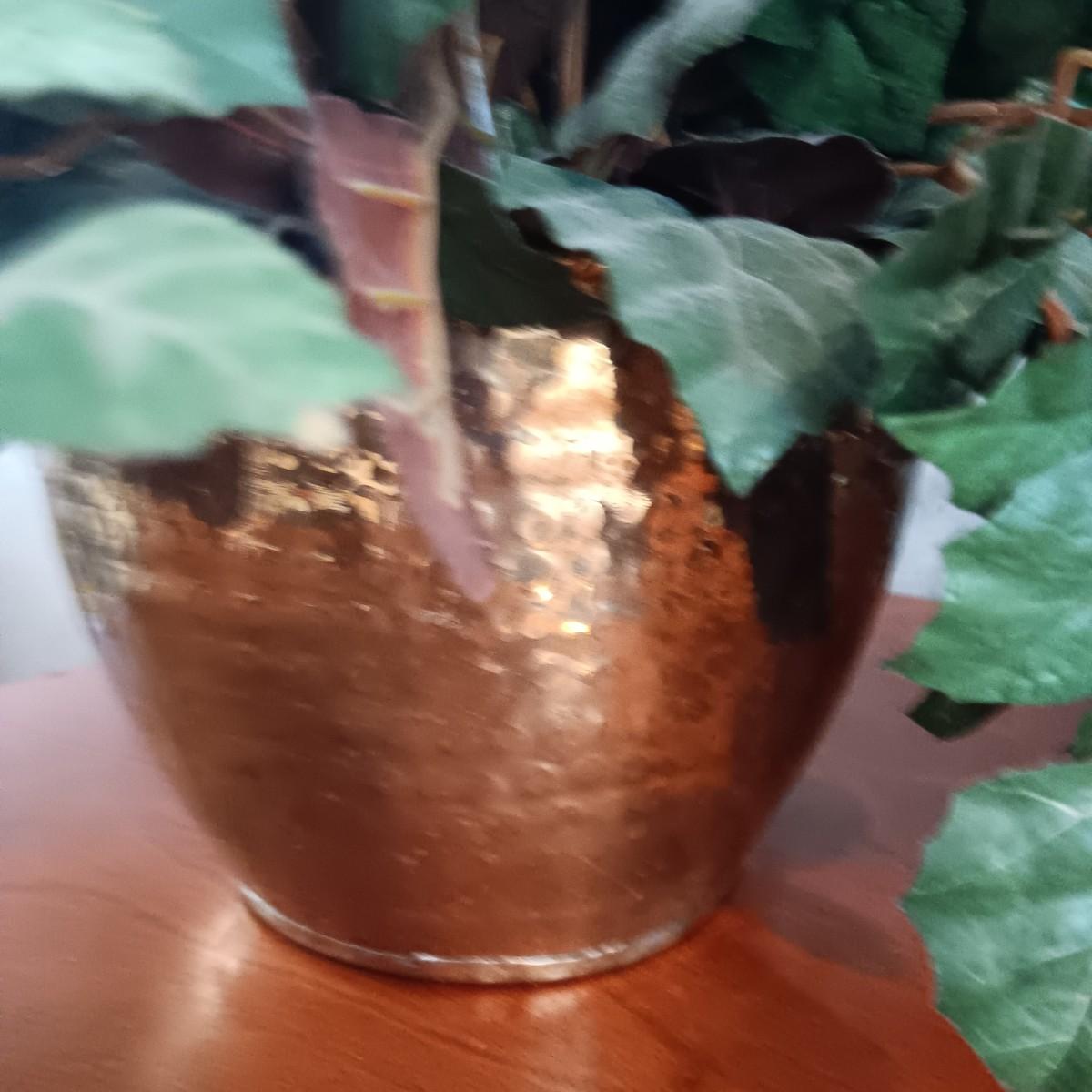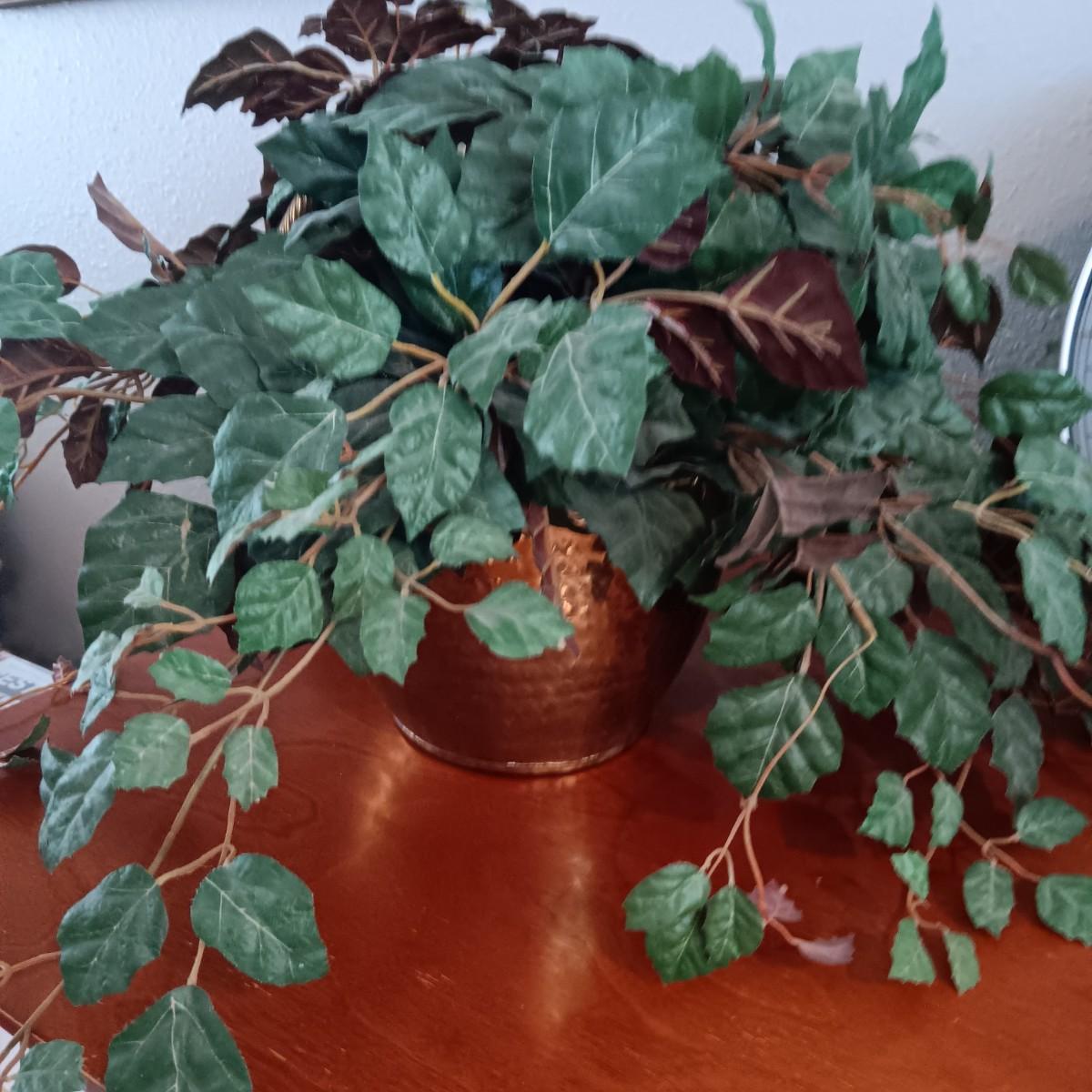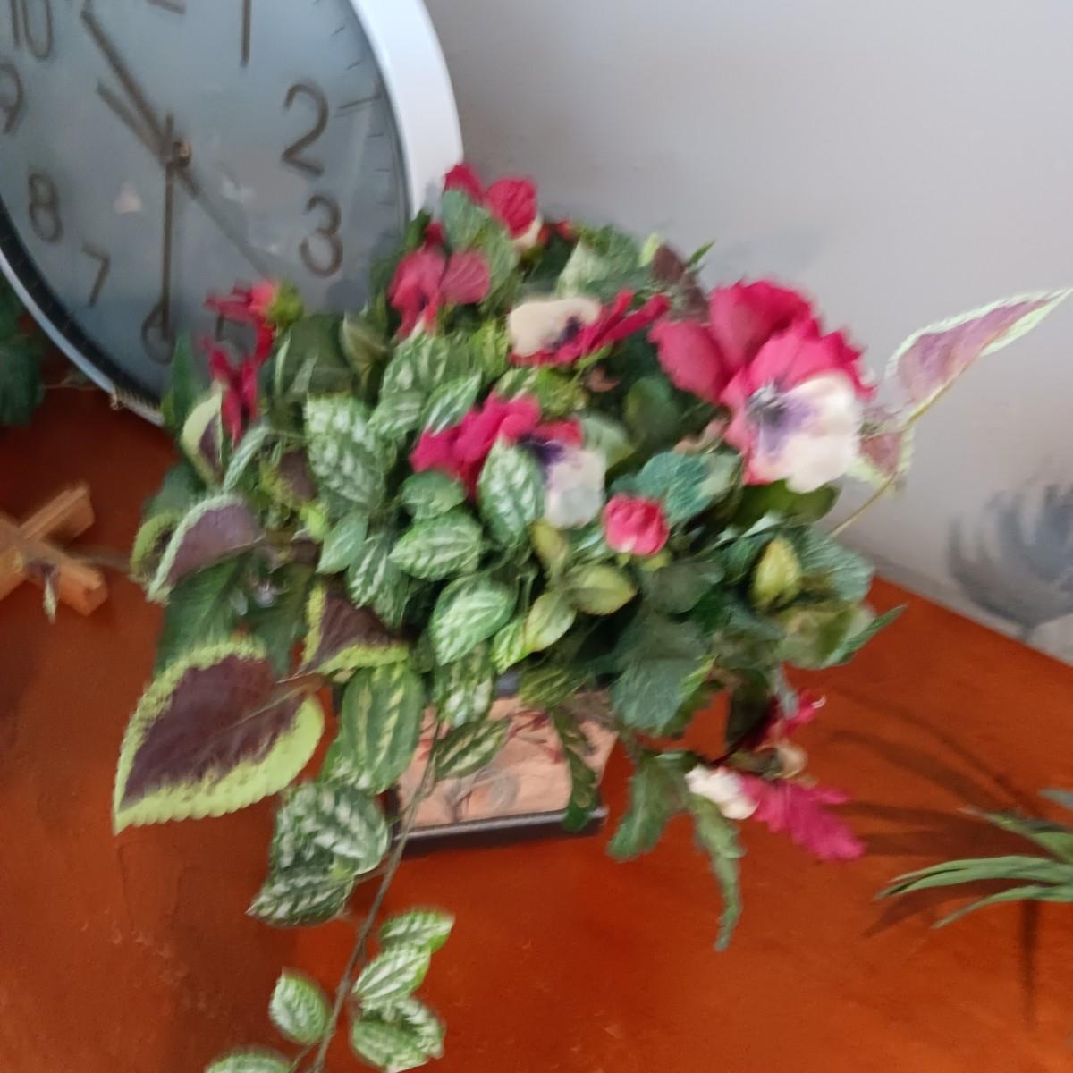 2 FAUX PLANTS IN BRASS AND TIN CONTAINERS, WALL CLOCK, CROSS AND TOOTHPICK HOLDER
